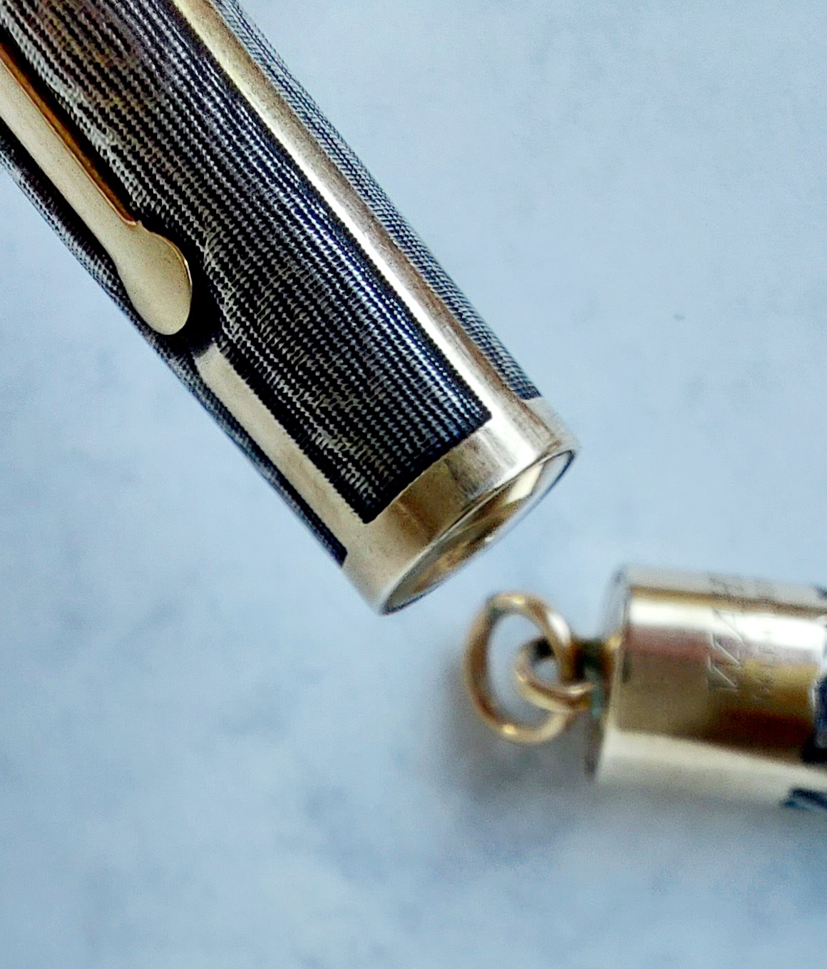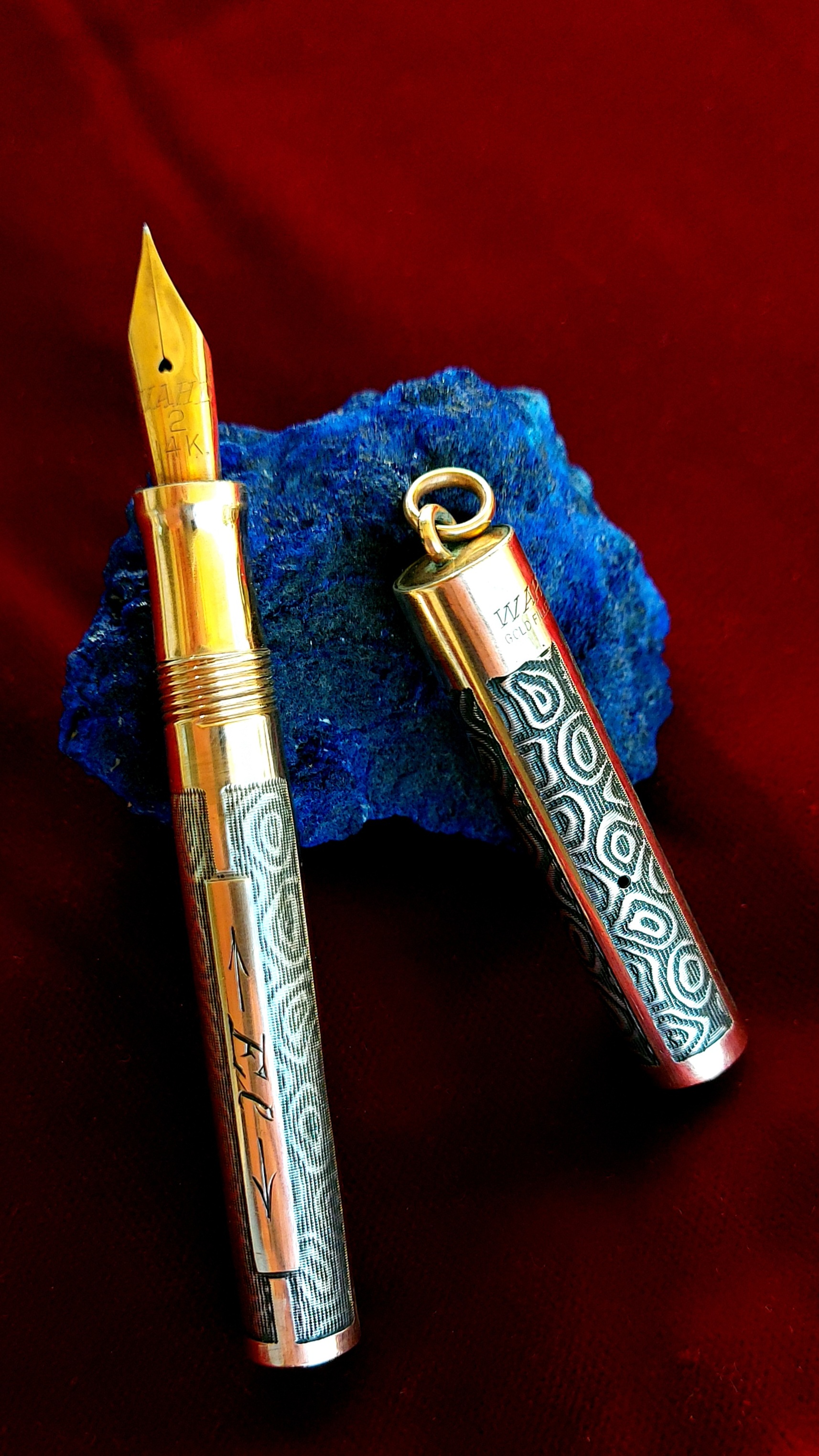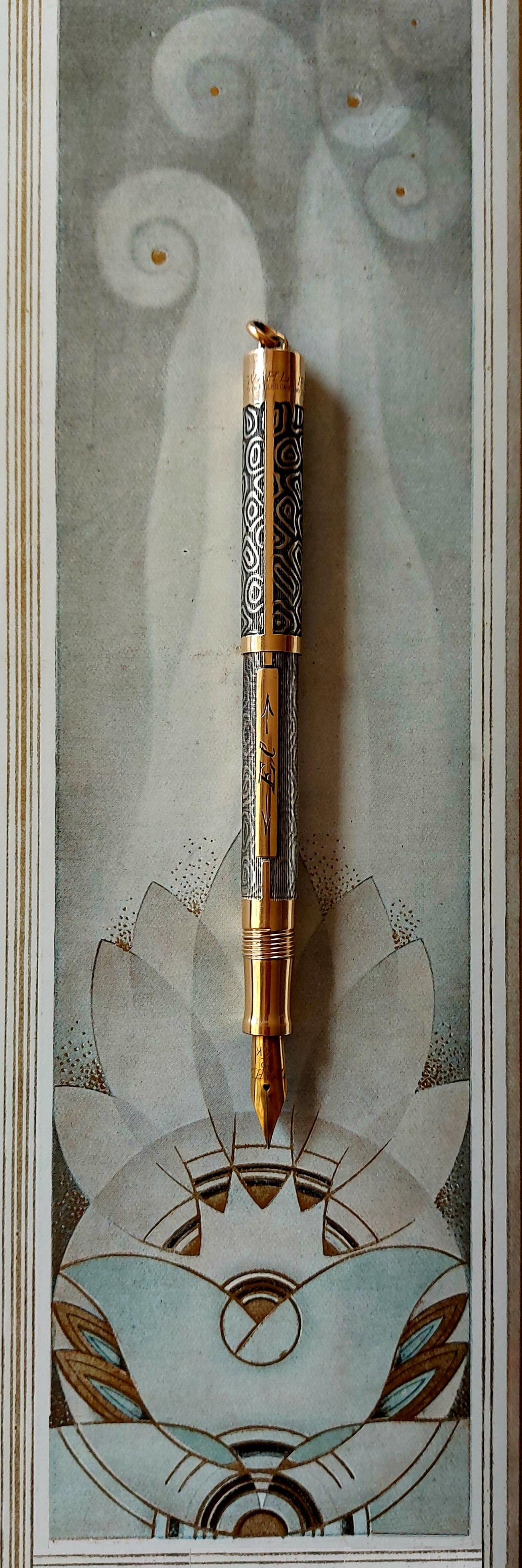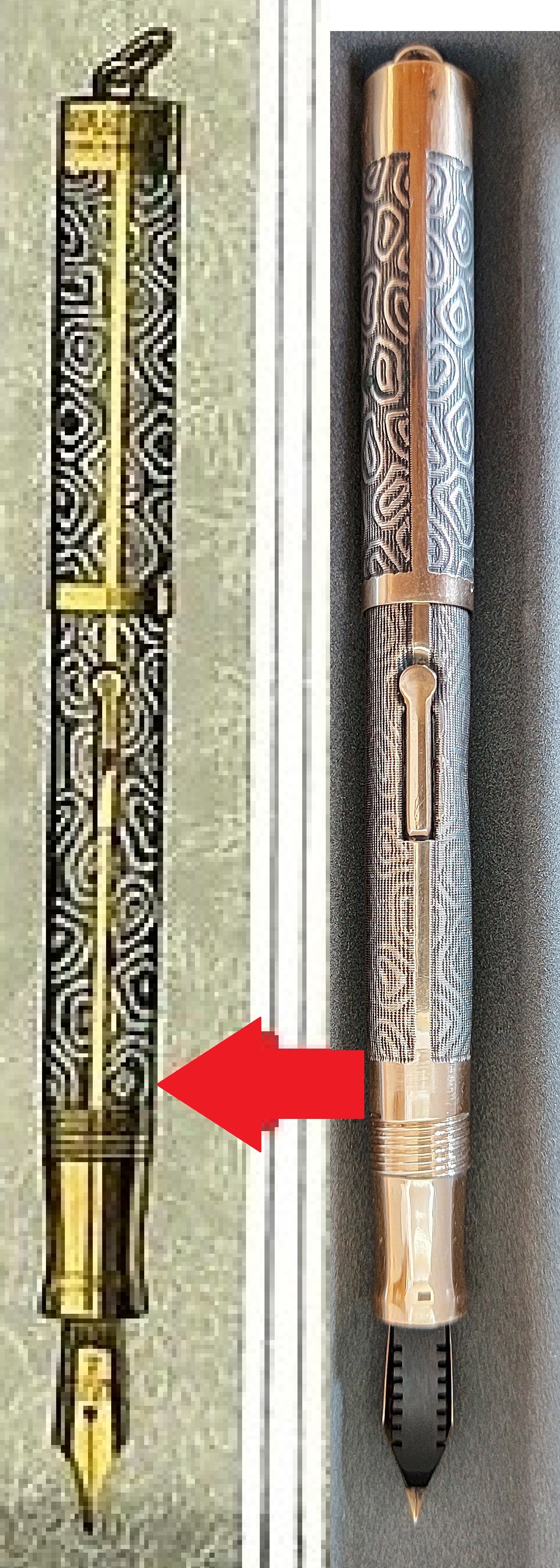 Per quanto riguarda il decoro (“Niagara” design, pattern), tanto prezioso quanto inusuale nel panorama pennistico, nella pagina allegata si apprende trattarsi di un «rivestimento in oro giallo 12K su argento massiccio [vermeil]. Parte della lamina d’oro veniva poi tagliata via e la superficie d’argento liberata veniva quindi lavorata [“Engine turned”] a macchina [quella apposita per il guilloché, per ottenere le caratteristiche isole di materiale]».