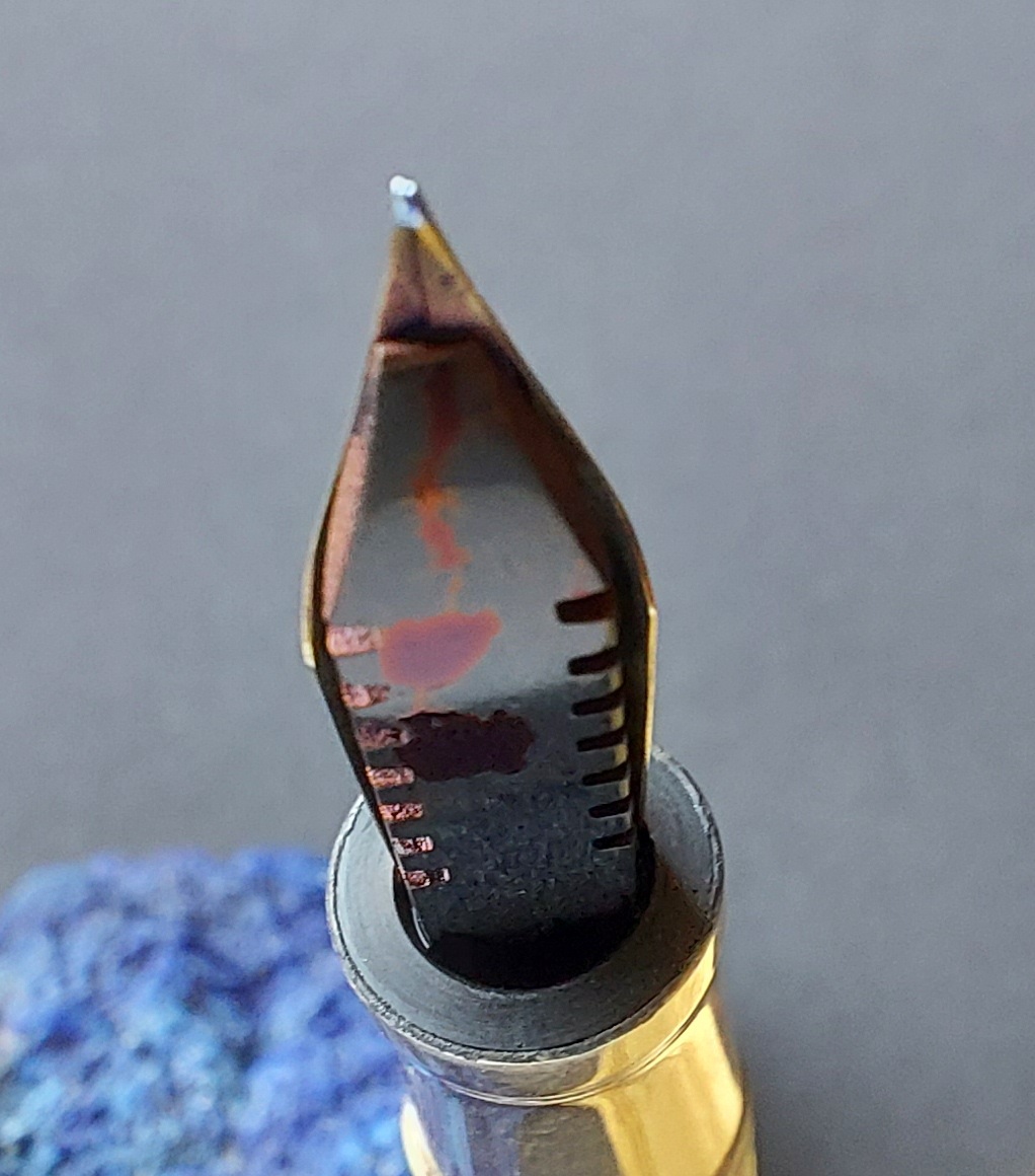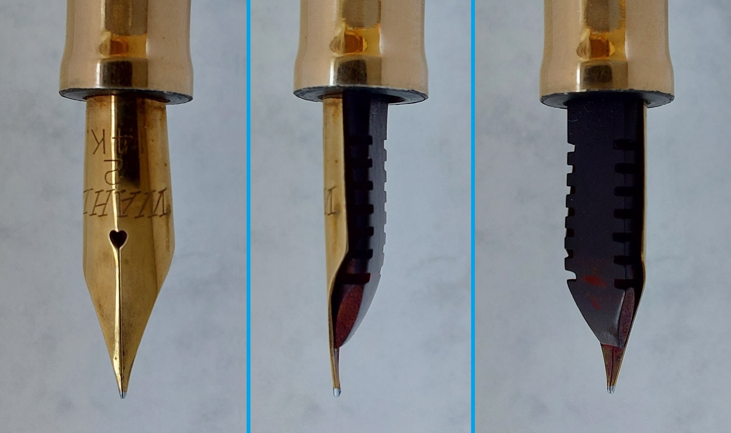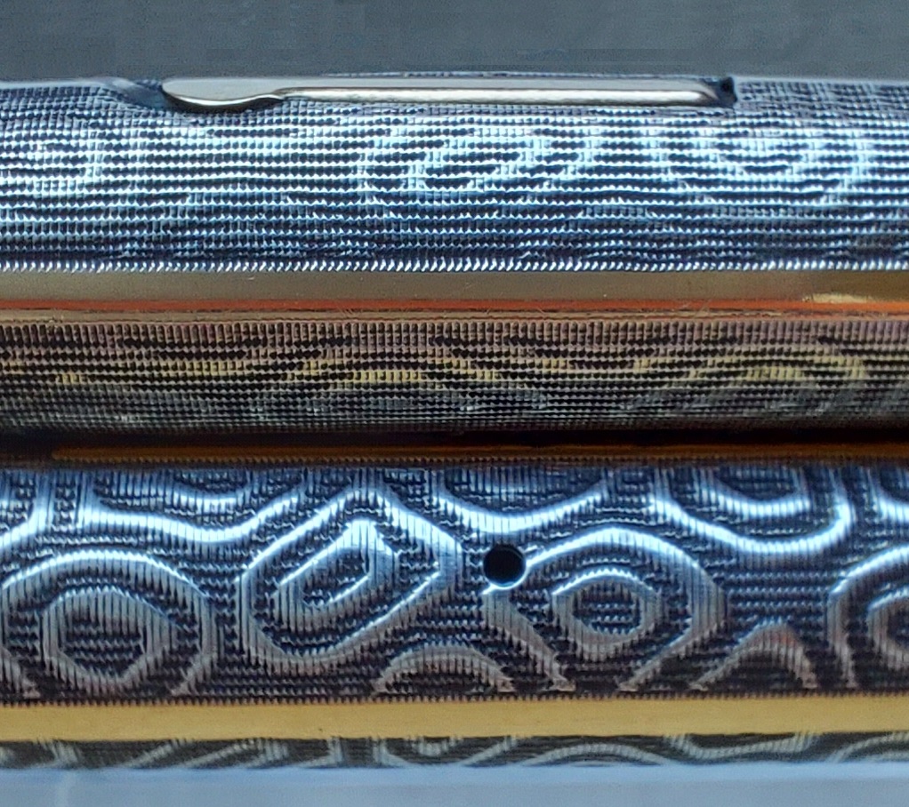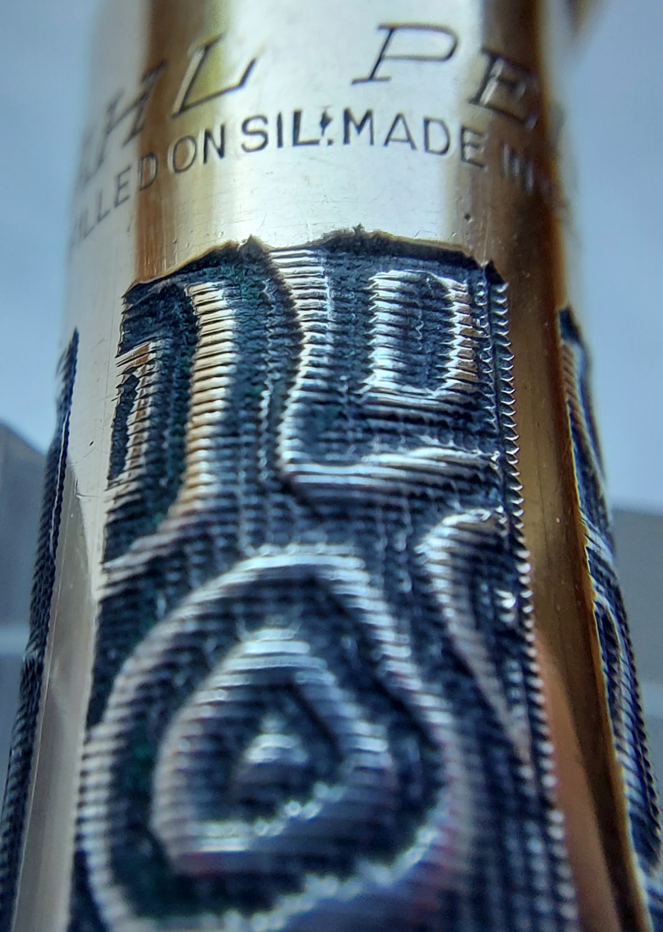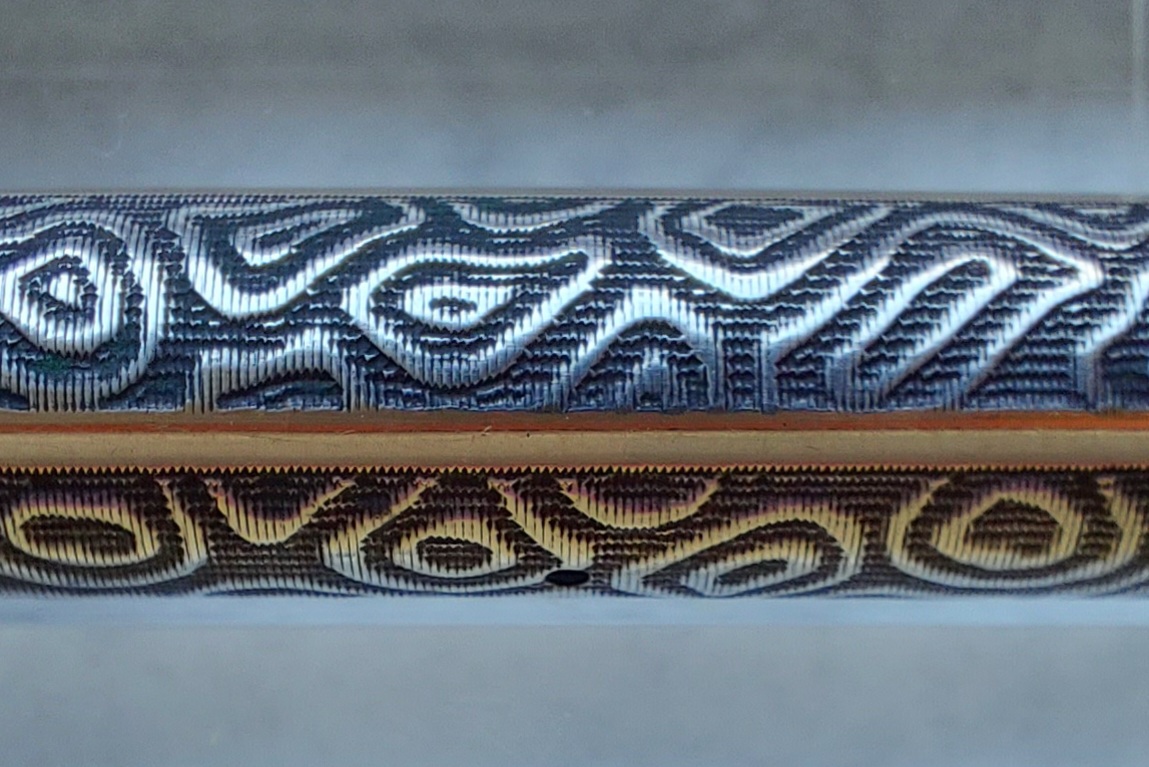 Pur potendo anche apparire come un effetto voluto dal costruttore, dalle pochissime penne consultabili in rete (tutte piuttosto “lisce”, e uniformemente) si direbbe invece che possa trattarsi di semplice “usura”, anche se sul mio esemplare l’altezza del decoro sulle due parti della penna è, come detto, diversa ma assolutamente omogenea, e non vi sono punti più o meno spessi di decorazione sul singolo elemento, nemmeno dove lo sfregamento di metallo su metallo è avvenuto certamente e con frequenza (ad es. sul fondello per la parte che accoglie il cappuccio calzato).