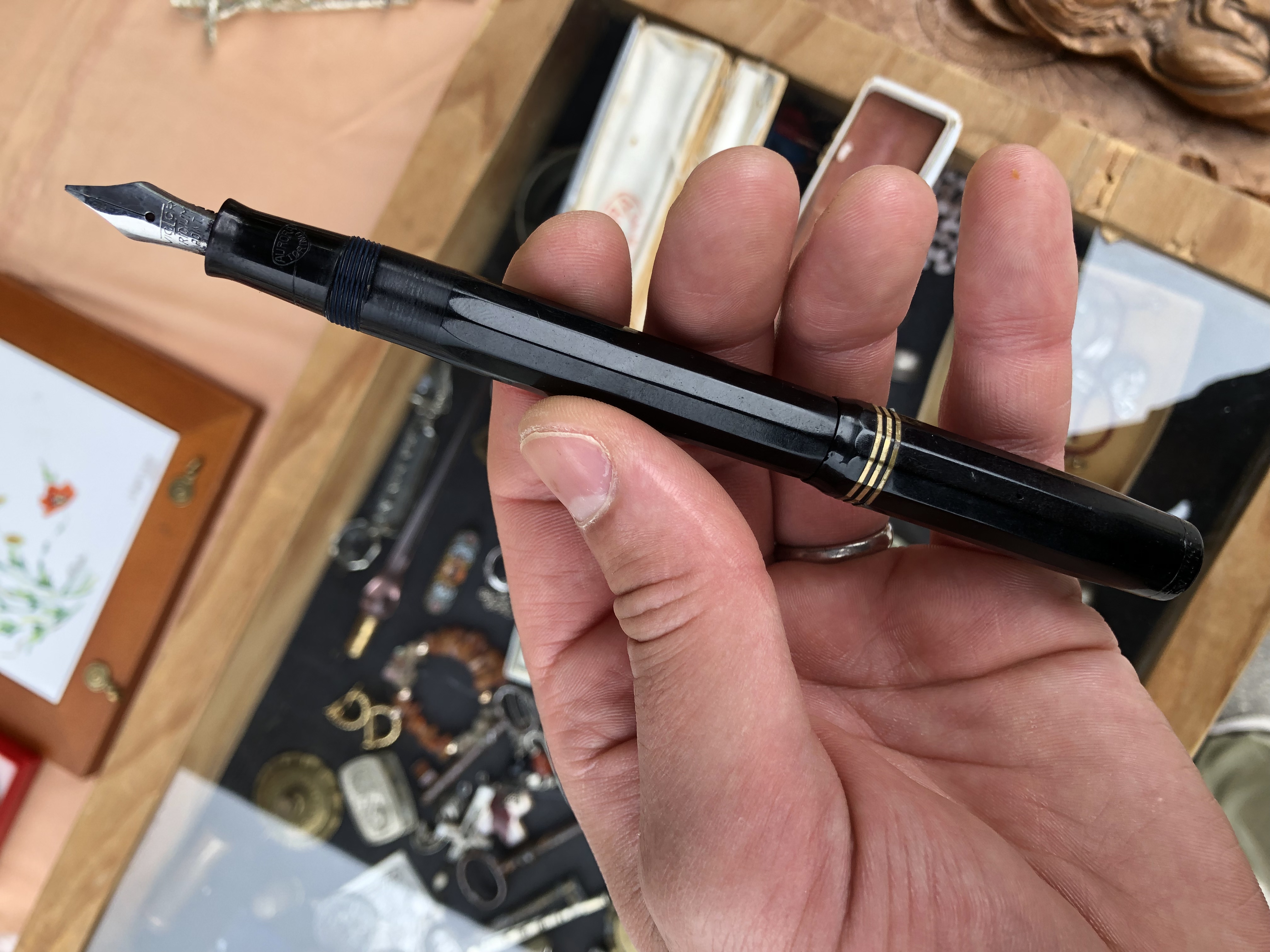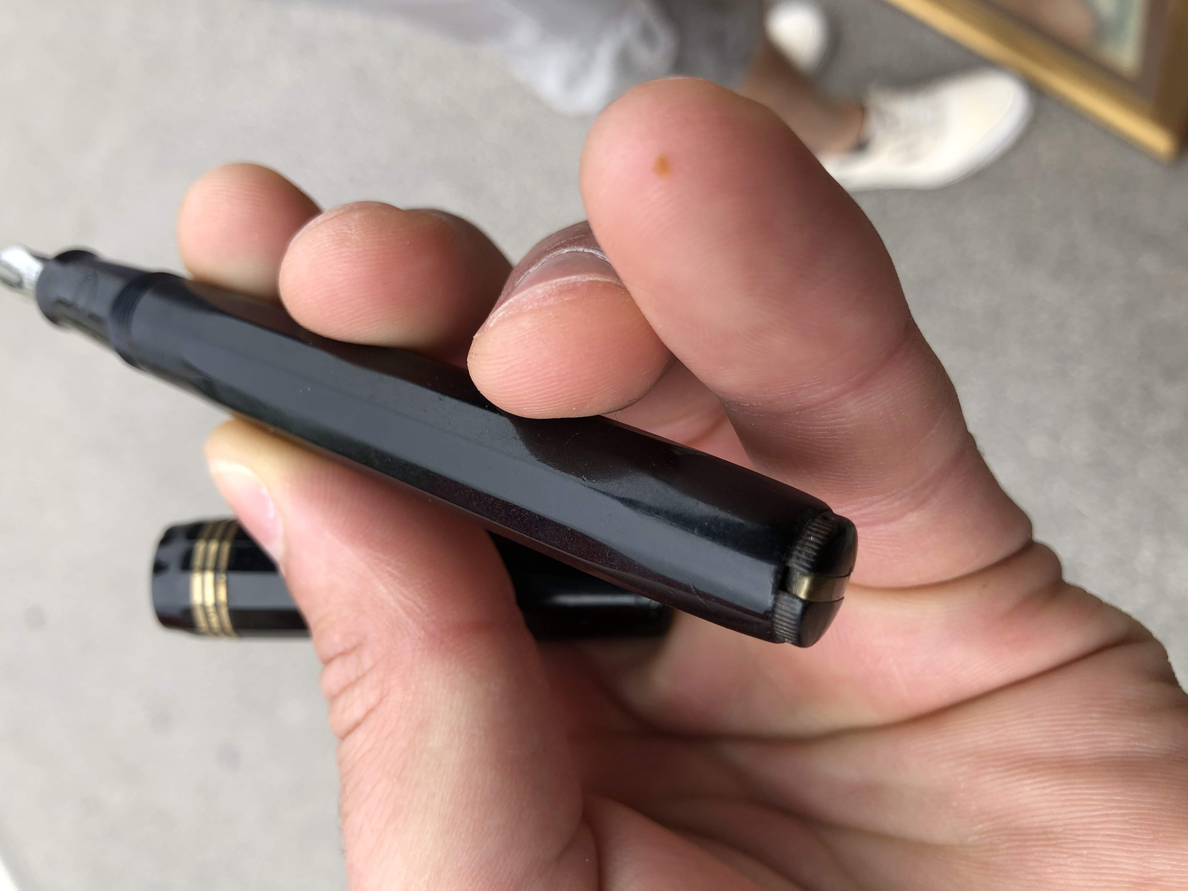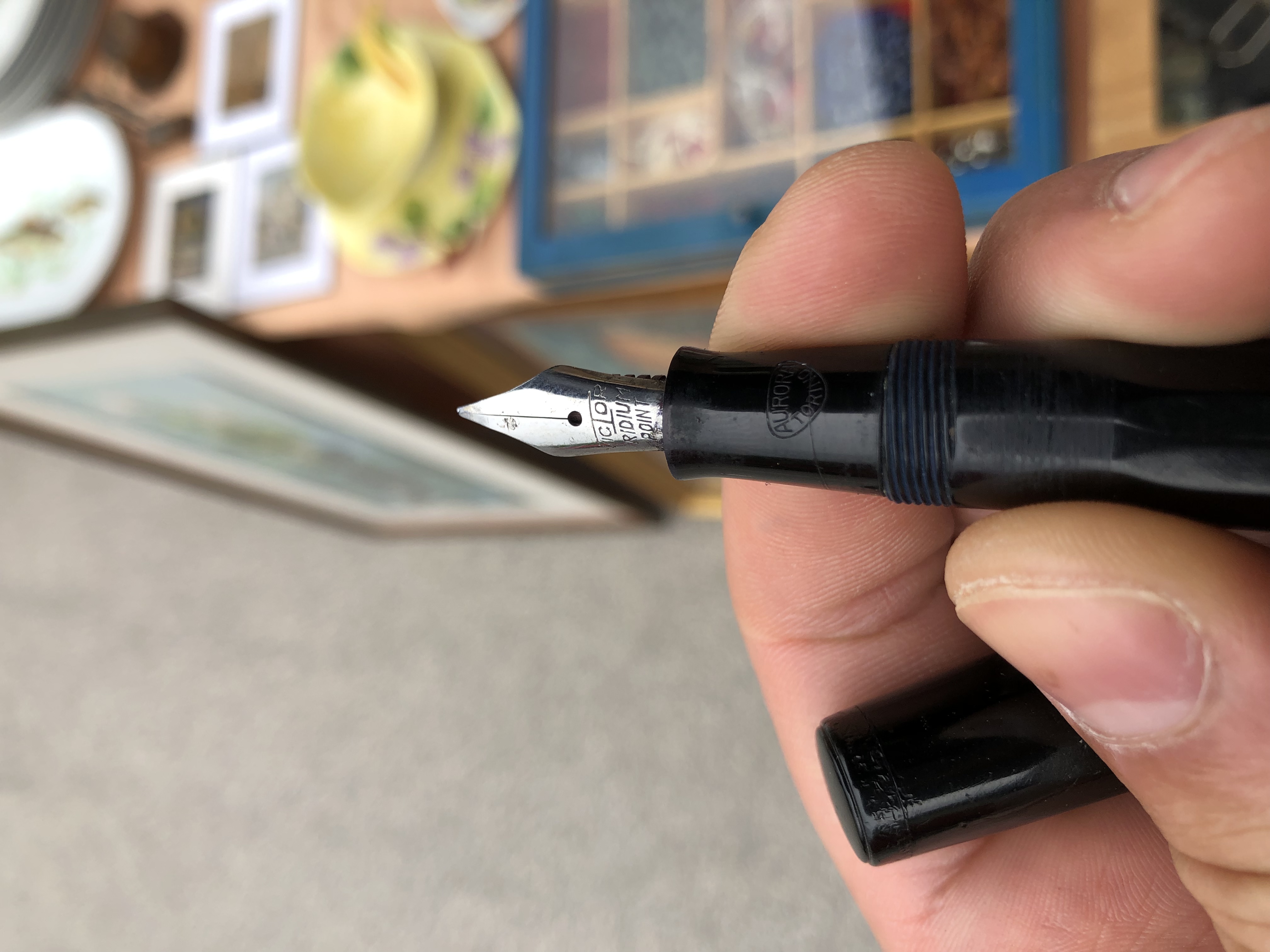 Ho incontrato a un mercatino una Aurora Novum, manca di clip, pennino sostituito con un acciaio generico, sfaccettata nera e misura, penso, grande, infatti non riuscivo a impugnarla col cappuccio calzato…