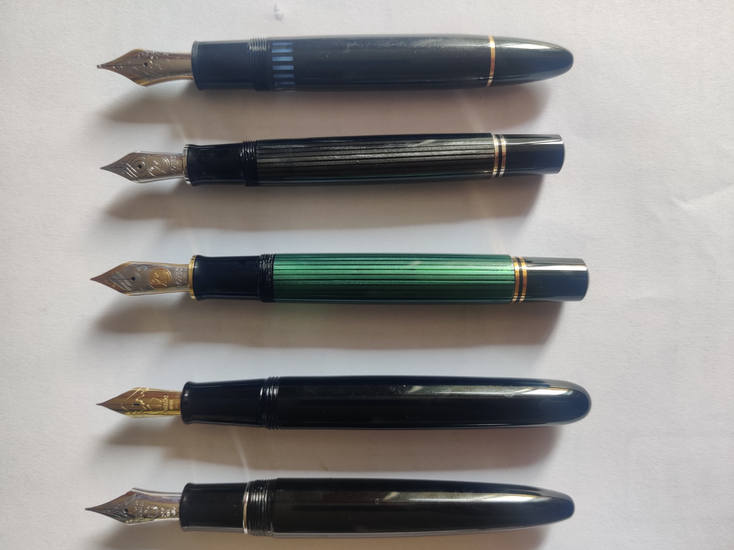 Di queste 5 penne che hai fotografato, se non erro Sailor, M1000 e 149 hanno il pennino No. 9 (o giu' di li) mentre la Namiki dovrebbe avere il pennino Pilot No. 20, che e' piu' piccolo di quello che monta la Pilot Custom Urushi (No. 30).
