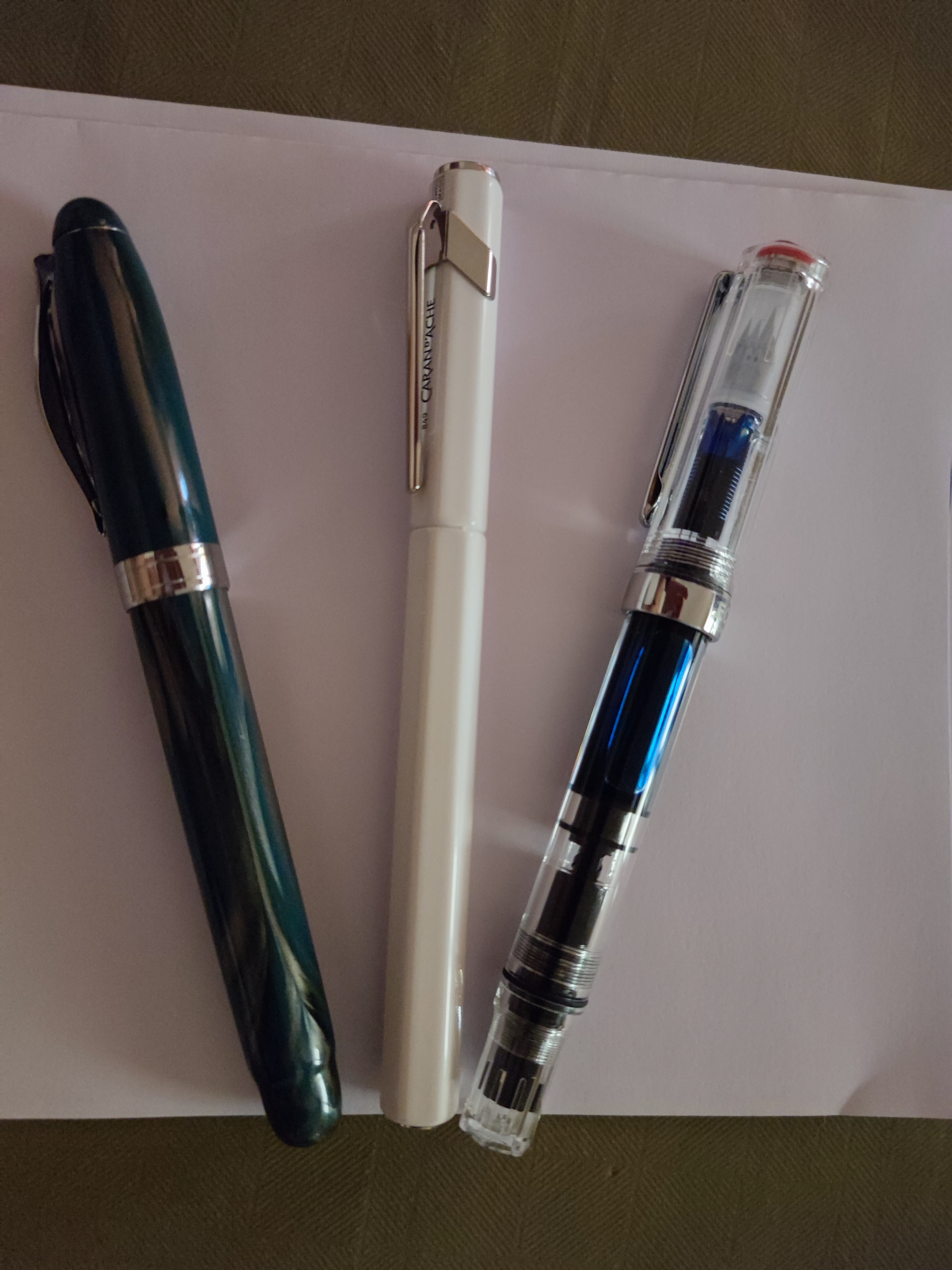 Ecco tre belle penne tra i 30 e i 40 (euro). Una più bella come designer (la Caran d'ache), una che scrive assai bene (la twsbi eco), una assai divertente (la ahab). Tre penne da avere e che mi divertono nella calura di luglio