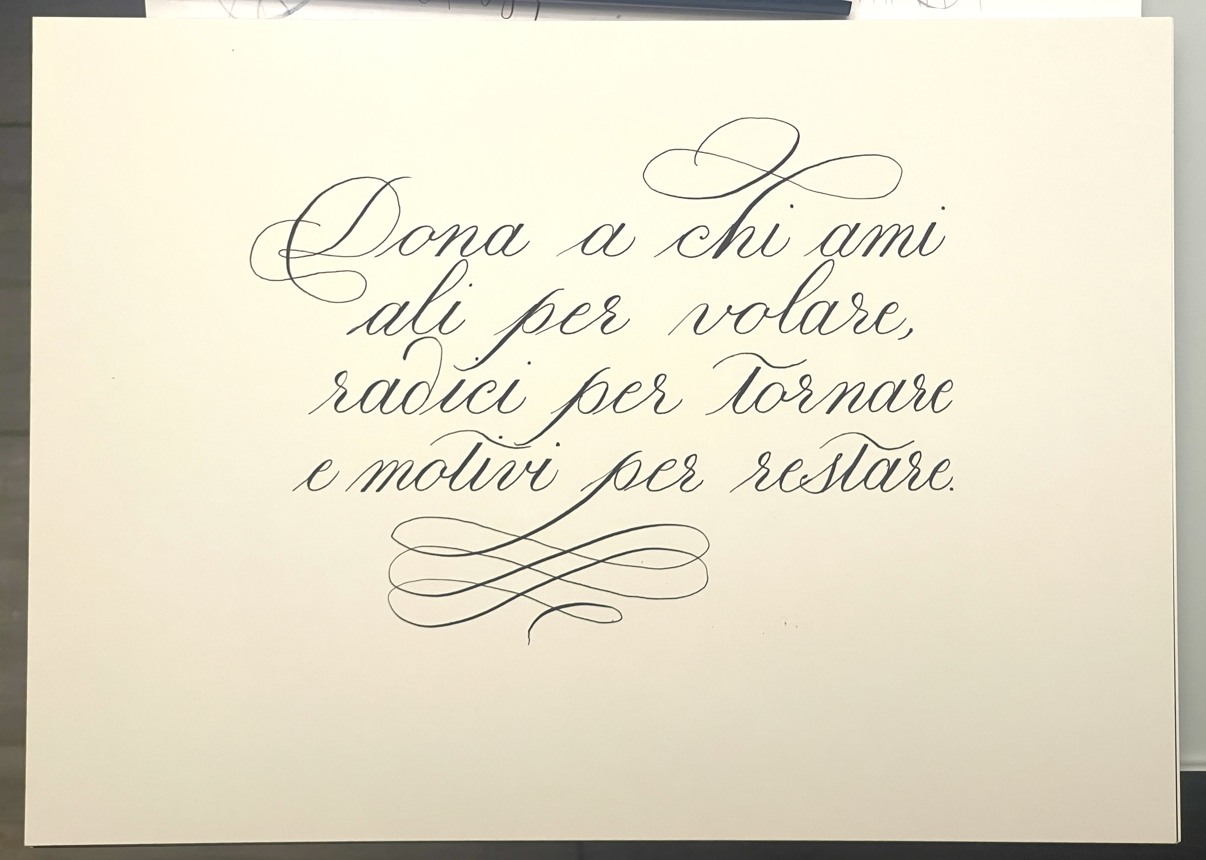 Il grosso dell’impegno sono state le partecipazioni, da scrivere su cartoncini piccoli per 45 famiglie (dovevano essere la metà inizialmente). Hanno insistito per pagarmi il lavoro almeno la metà di quello che aveva chiesto la copisteria di Lugano. Ci ho messo dei mesi, ma sono rimasti contentissimi. Io pure, molto più di quanto mi aspettassi (le copisterie a Lugano vendono oro probabilmente!).