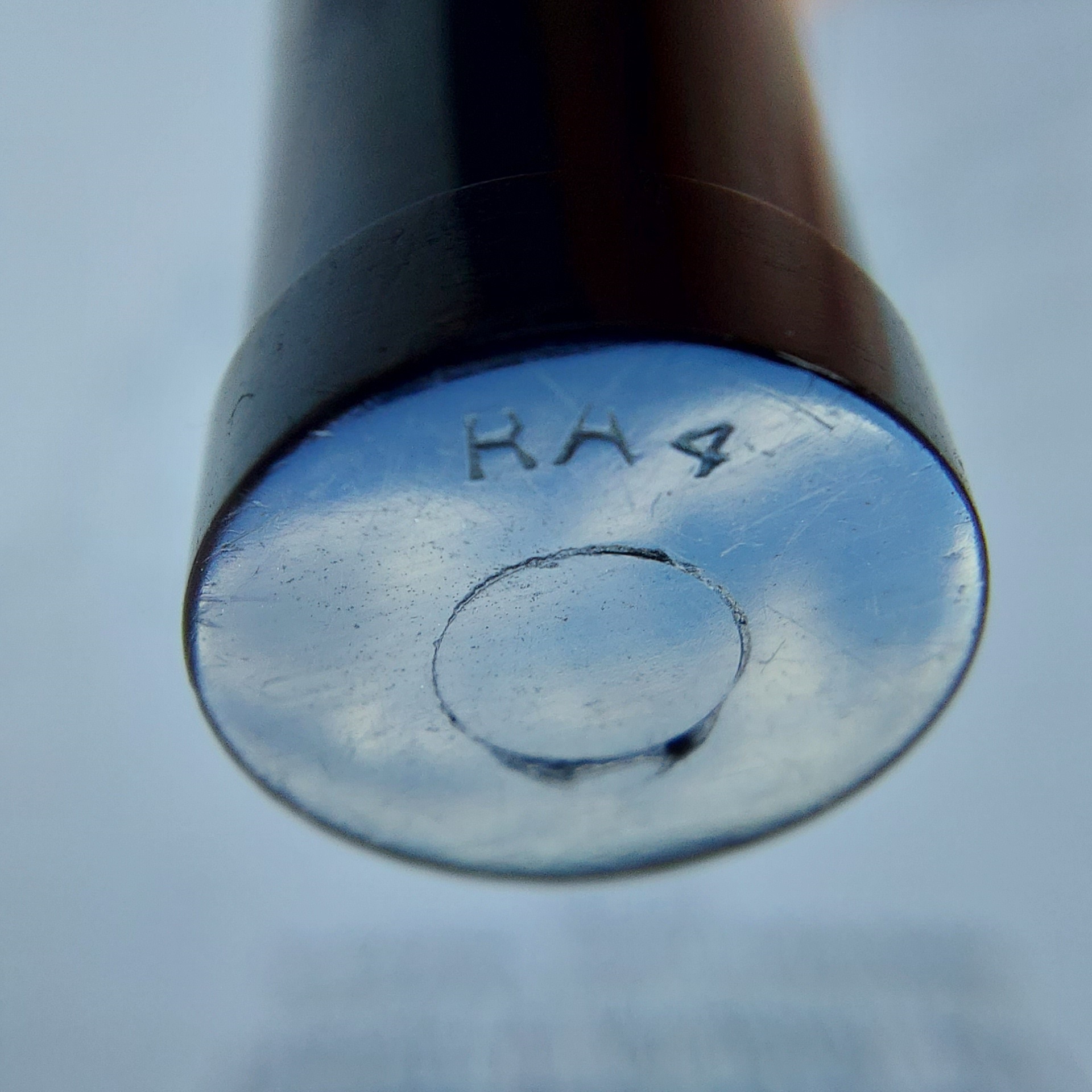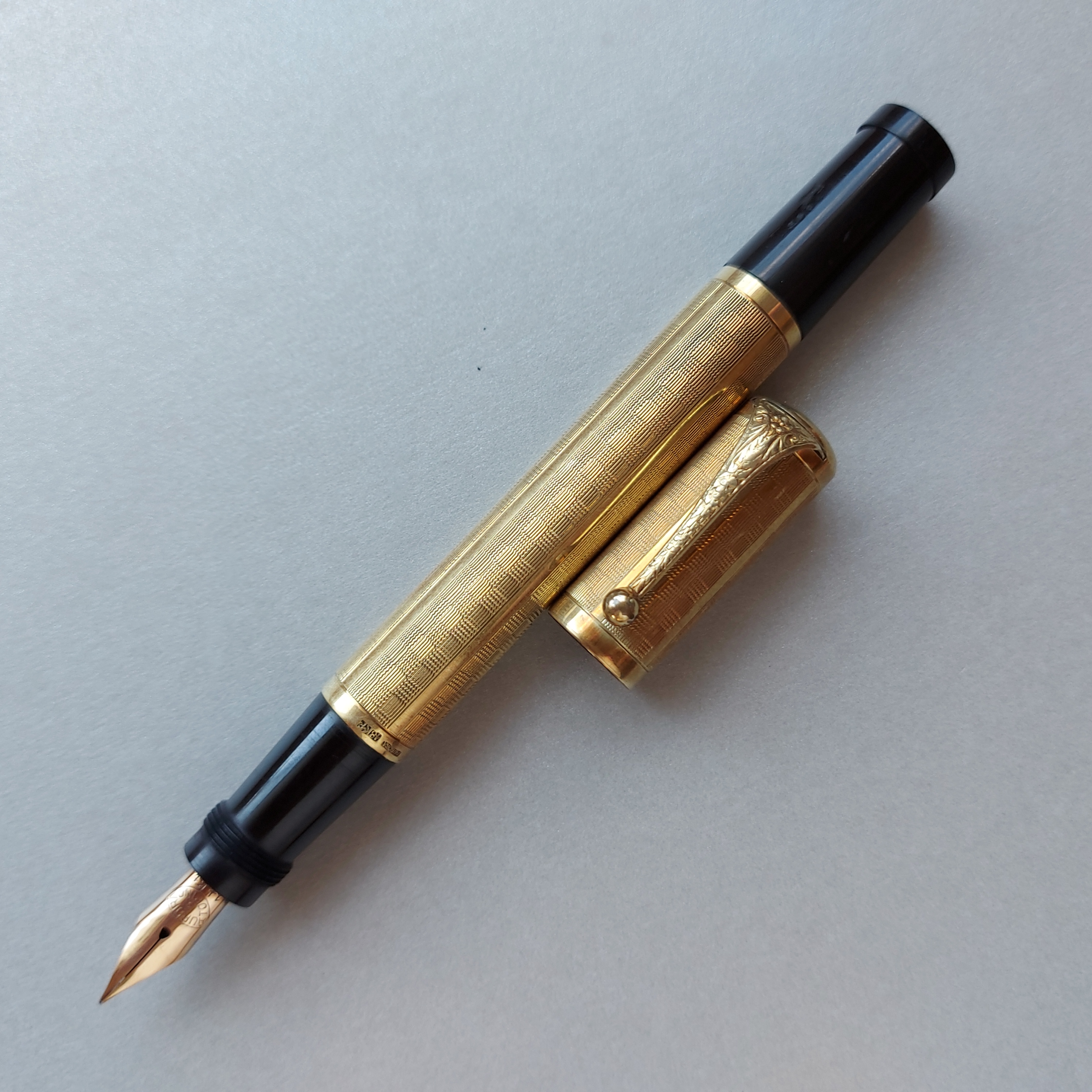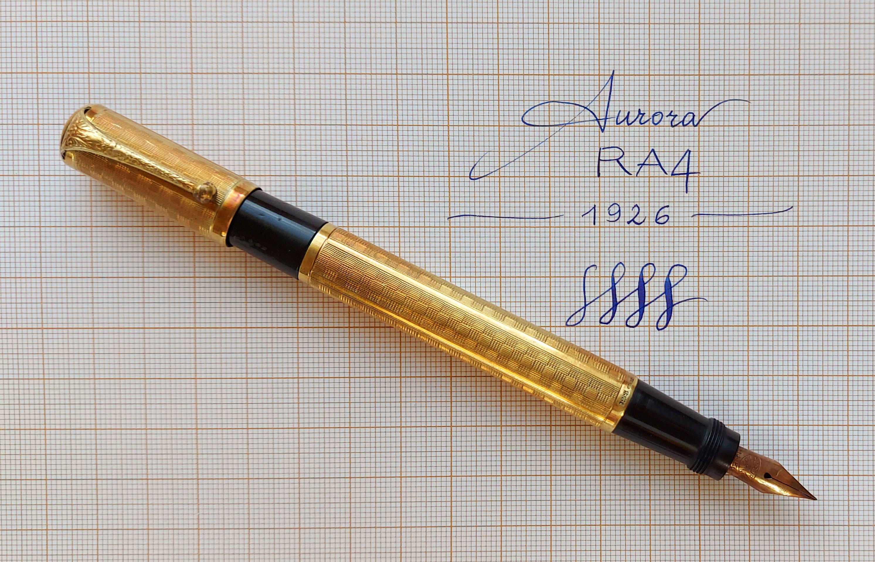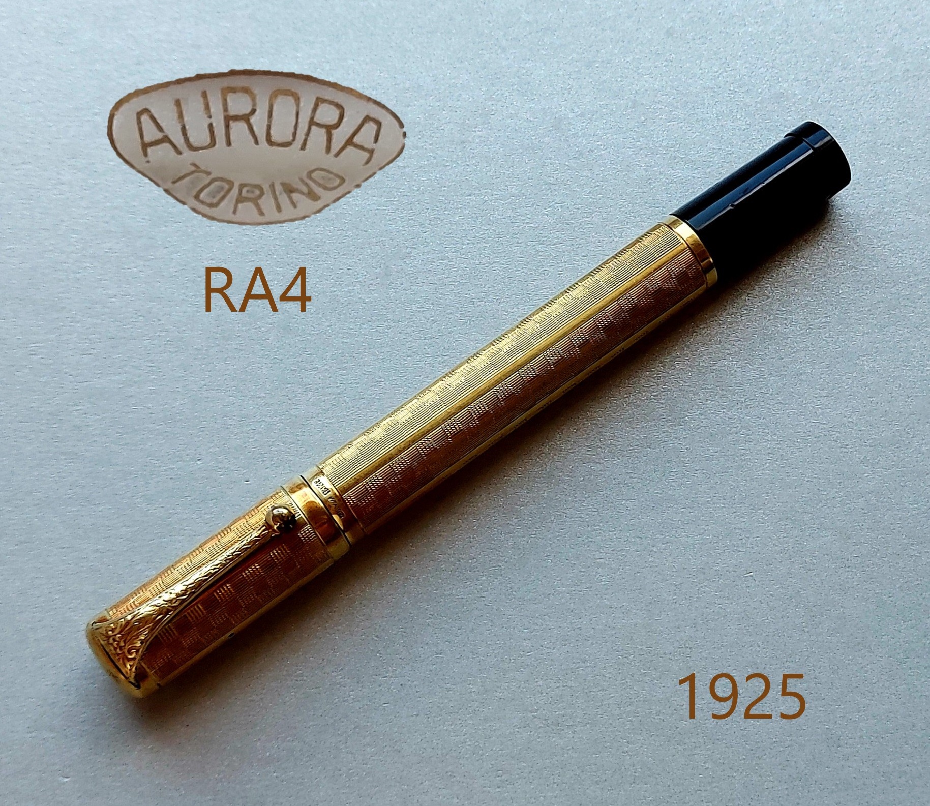 La penna AURORA RA4 (Rientrante Aurora #4) in ebanite nera liscia (BHR), laminata oro 18 K.R., cappuccio a vite con clip fissa, corretto pennino Aurora #3 in oro 14 carati, caricamento safety, produzione Italia, anno 1925.