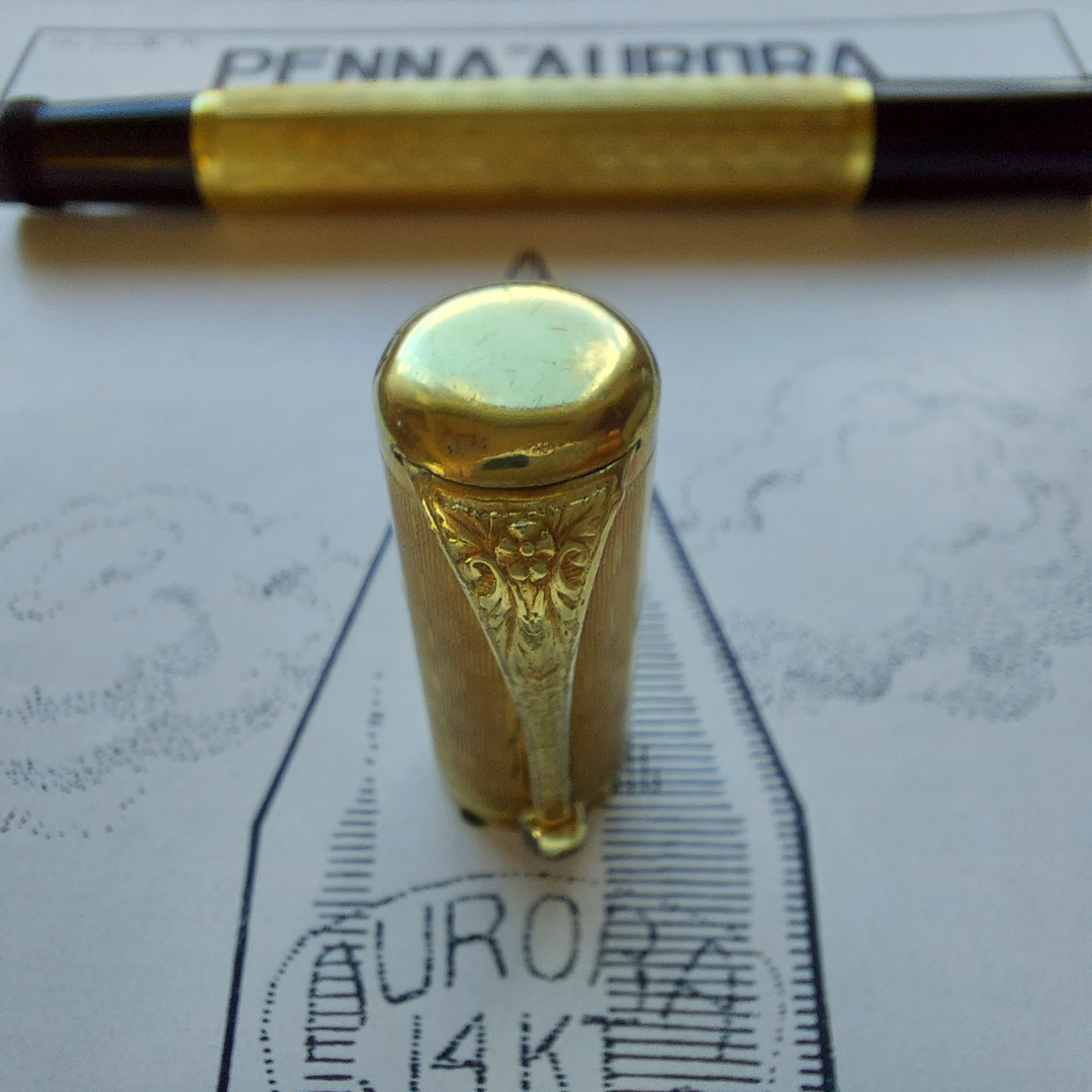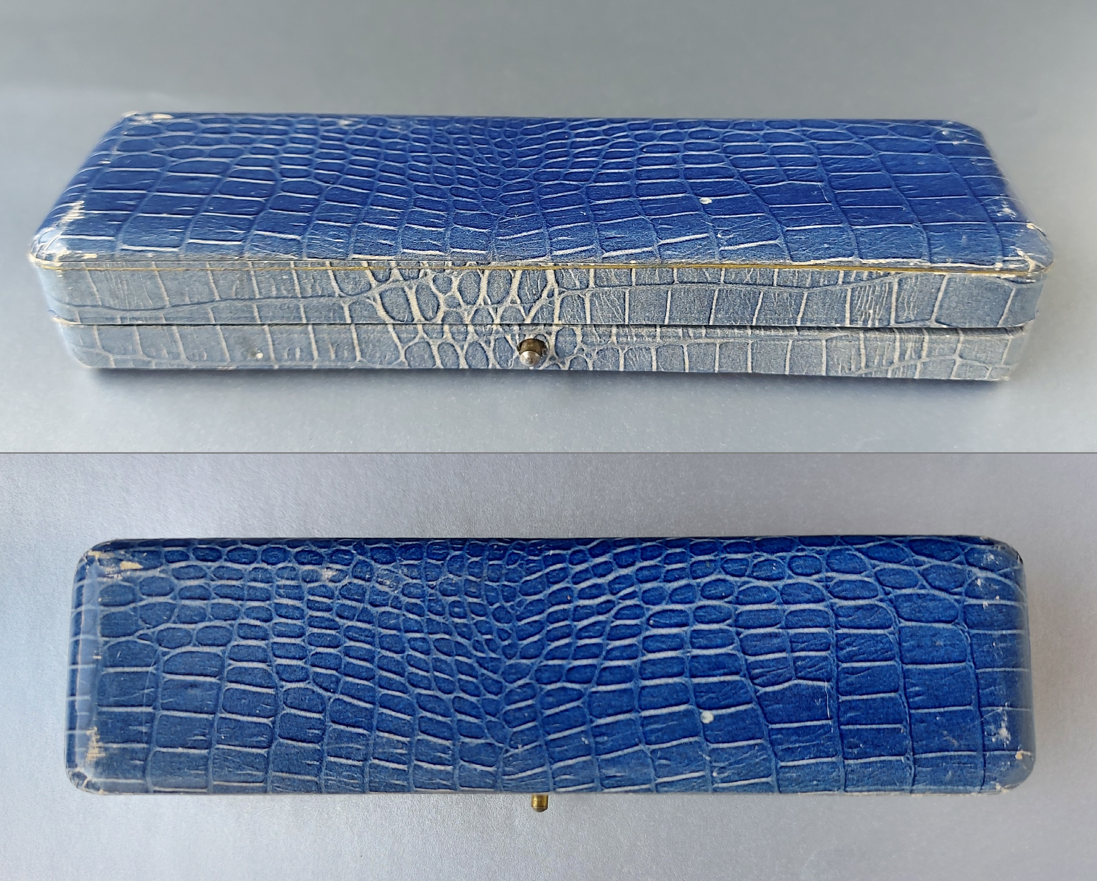 È il caso di questa Rientrante Aurora: preziosa, non comune in taglia grande, in condizioni eccellenti. Perciò, se vedete un’improbabile (alle nostre latitudini, almeno) “pelle di serpente color blu” occhieggiare tra le carabattole male assortite d’un banchetto, investite un poco di tempo per indagare, perché vi è la concreta possibilità che si tratti di una scatolina per stilografiche Aurora degli anni Venti (utilizzata anche per le “Duplex” dopo il 1927).