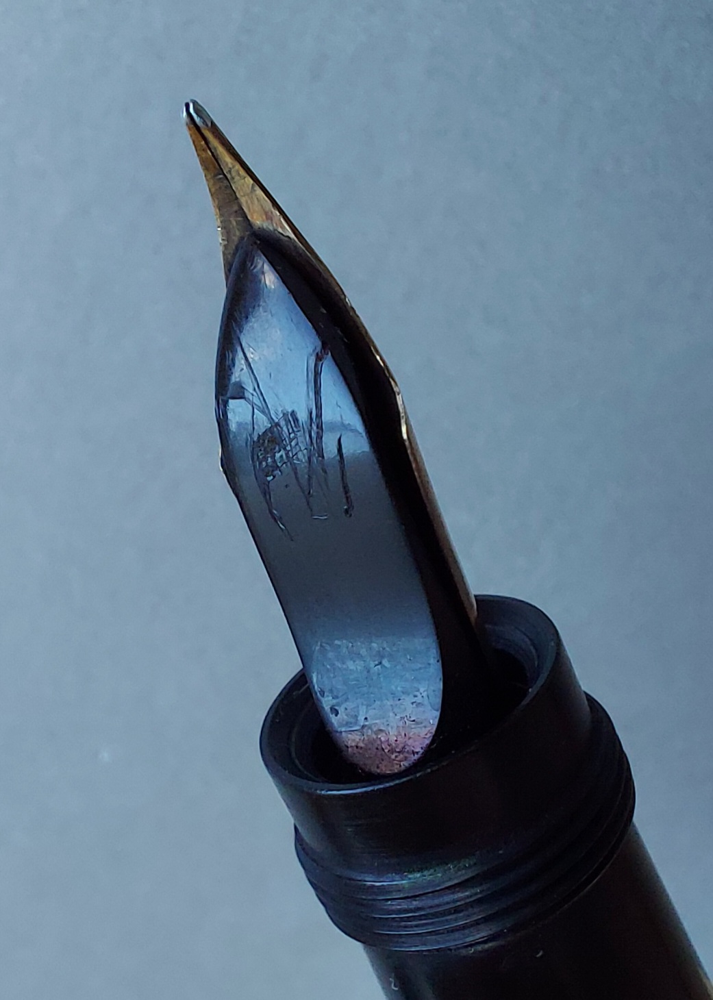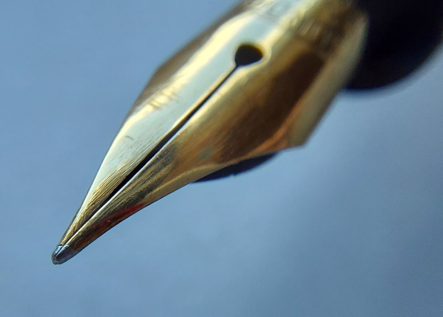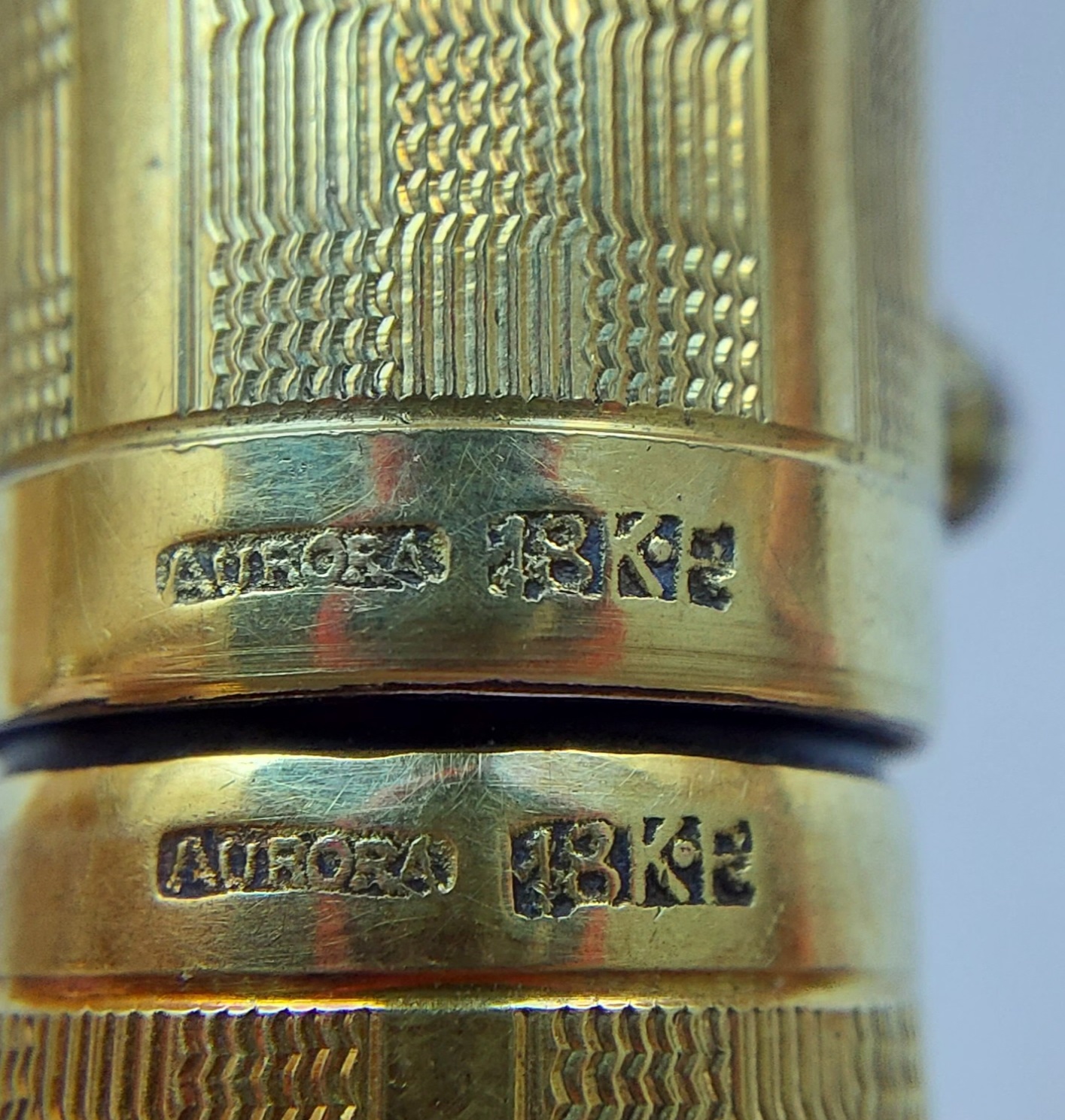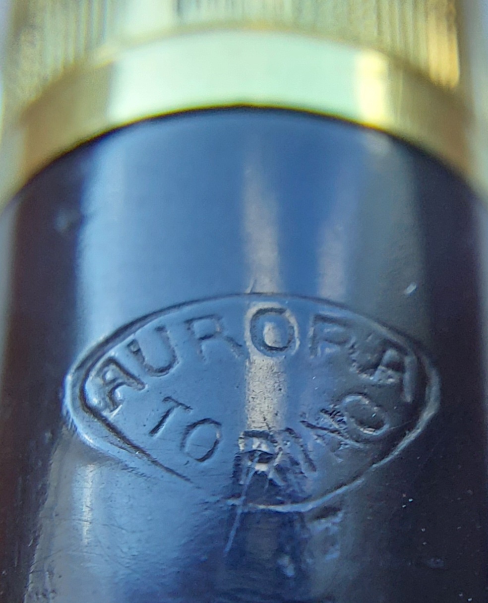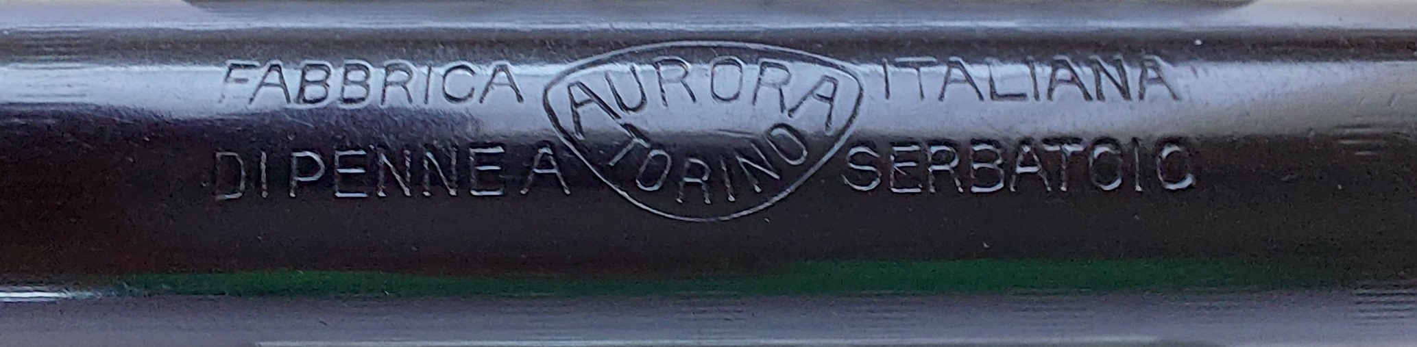 L’iscrizione sul pennino riporta nel caratteristico cartiglio Aurora (scudetto ovale) la Marca, la taglia (non coincidente, ma questo è corretto, con quella della penna) e la Città di produzione