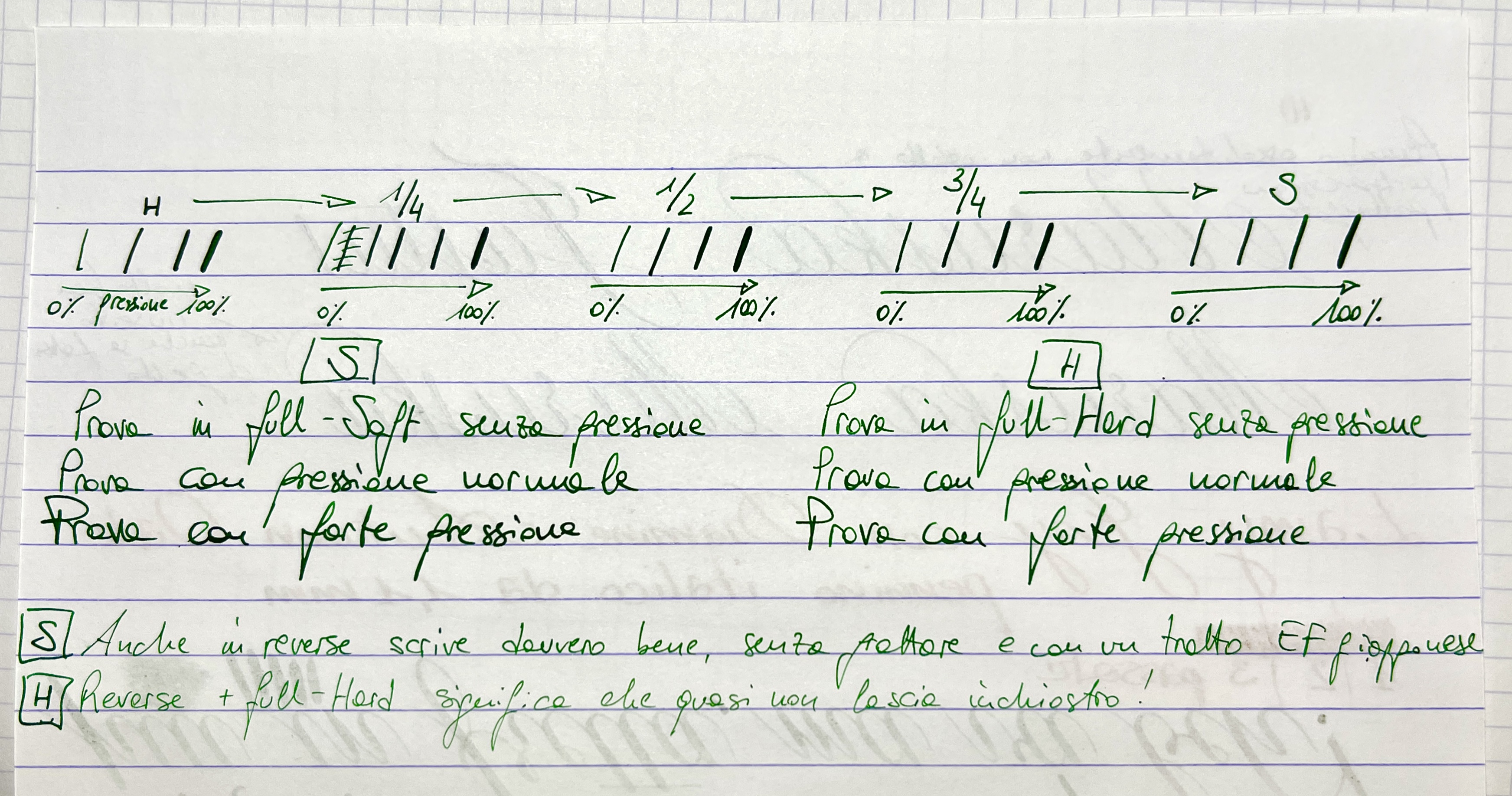 Se la metto in hard il flusso viene quasi totalmente strozzato e la penna scrive come un UEF, paragonabile alla mia platinum 3776. Se si esercita pressione quando la penna è in hard si libera il flusso e si ha una variazione di tratto davvero interessante. Secondo me non è un comportamento normale, ma a me piace davvero molto.