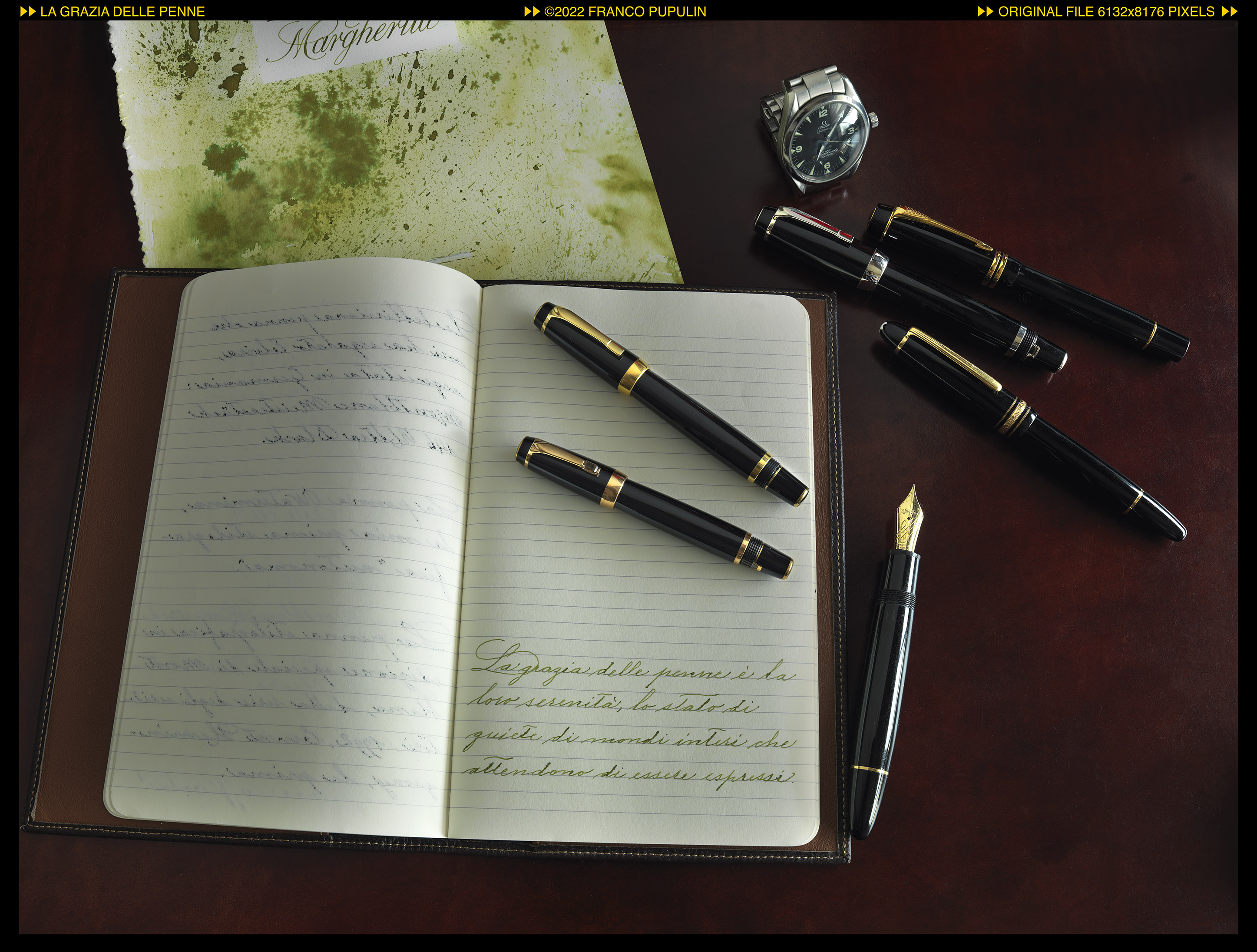 Non so in che misura sia possibile apprezzarlo appieno nell'immagine riprodotta qui sul forum, che é stata ridotta in dimensioni e salvata come un JPG di qualità media, ma la nitidezza tanto in primo piano, sulle fibre della carta e sulle cuciture del quaderno, così come sulle penne nelle zone centrali e sul quadrante dell'orologio più verso il fondo, é semplicemente mozzafiato.