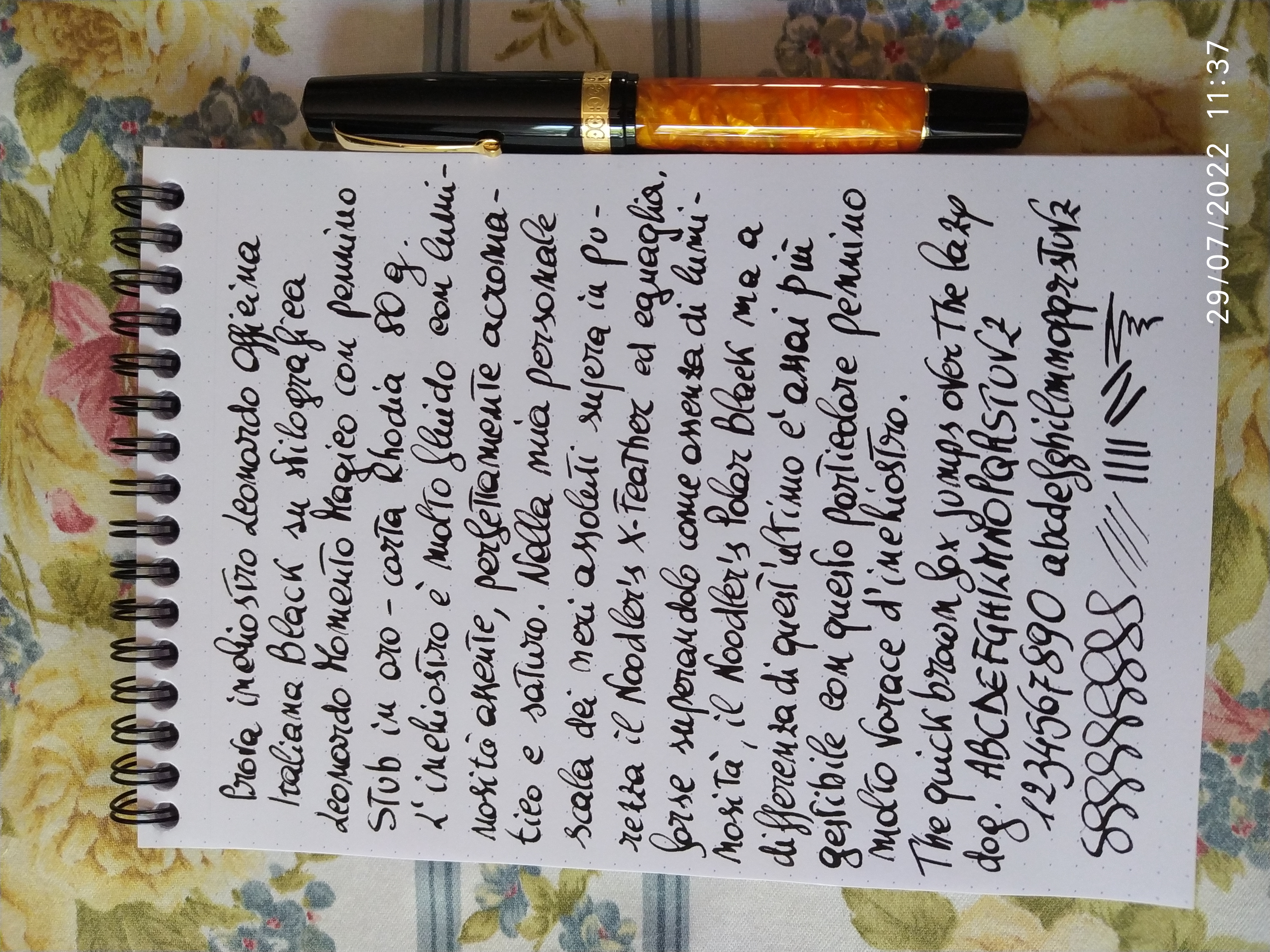 Ho entrambi, il Perle Noir, ed il Leonardo Black. Sono entrambi ottimi, il Perle Noir tendo ad usarlo sui pennini fini giapponesi, il Leonardo su tutto il resto tranne le Pelikan (sulle quali uso l’inchiostro di casa Brilliant Black che arresta un po’ il tipico flusso copioso).