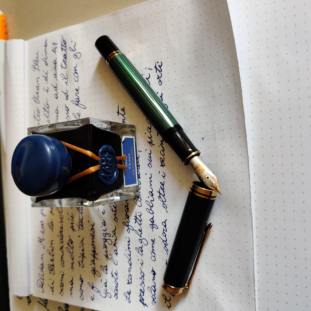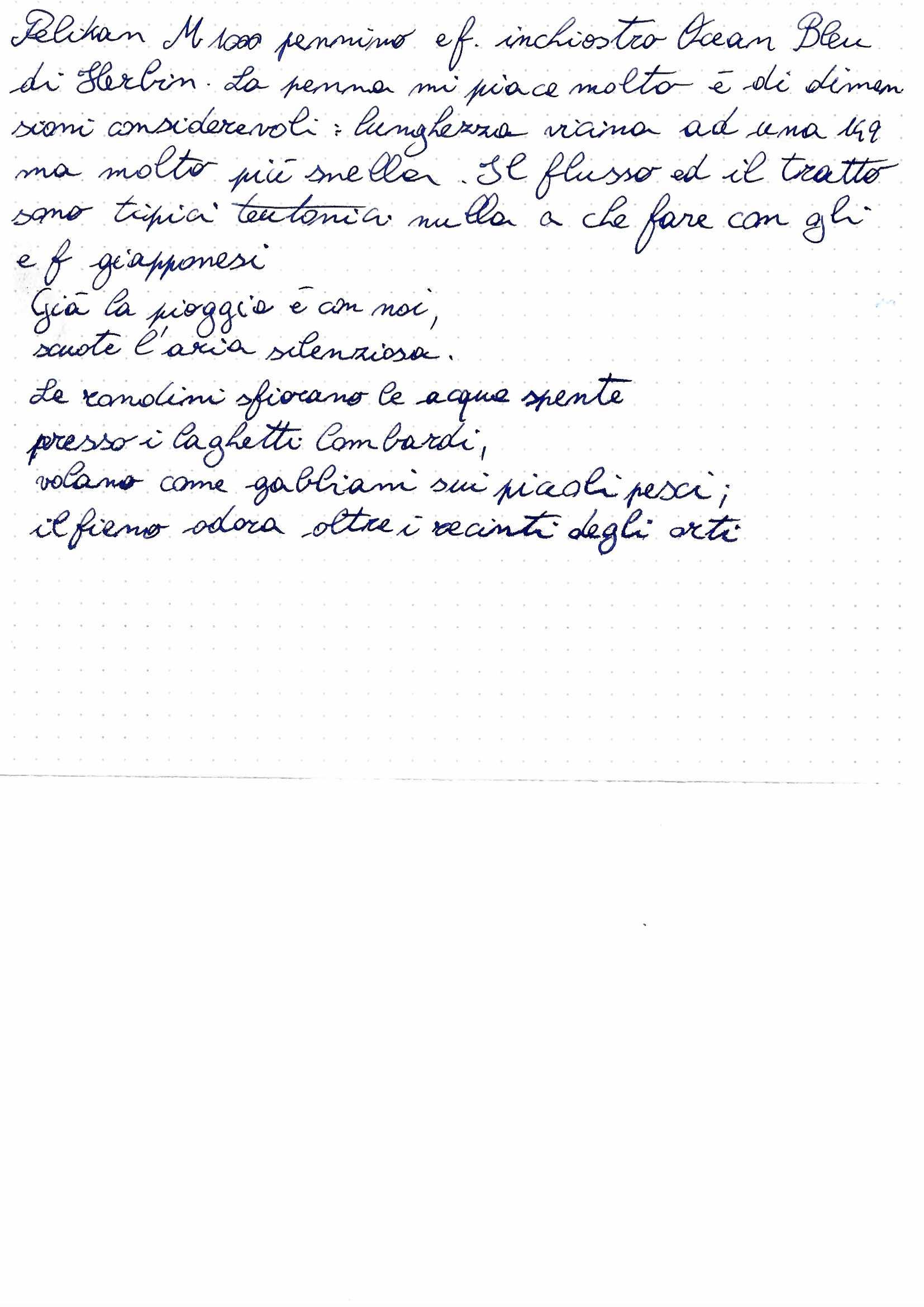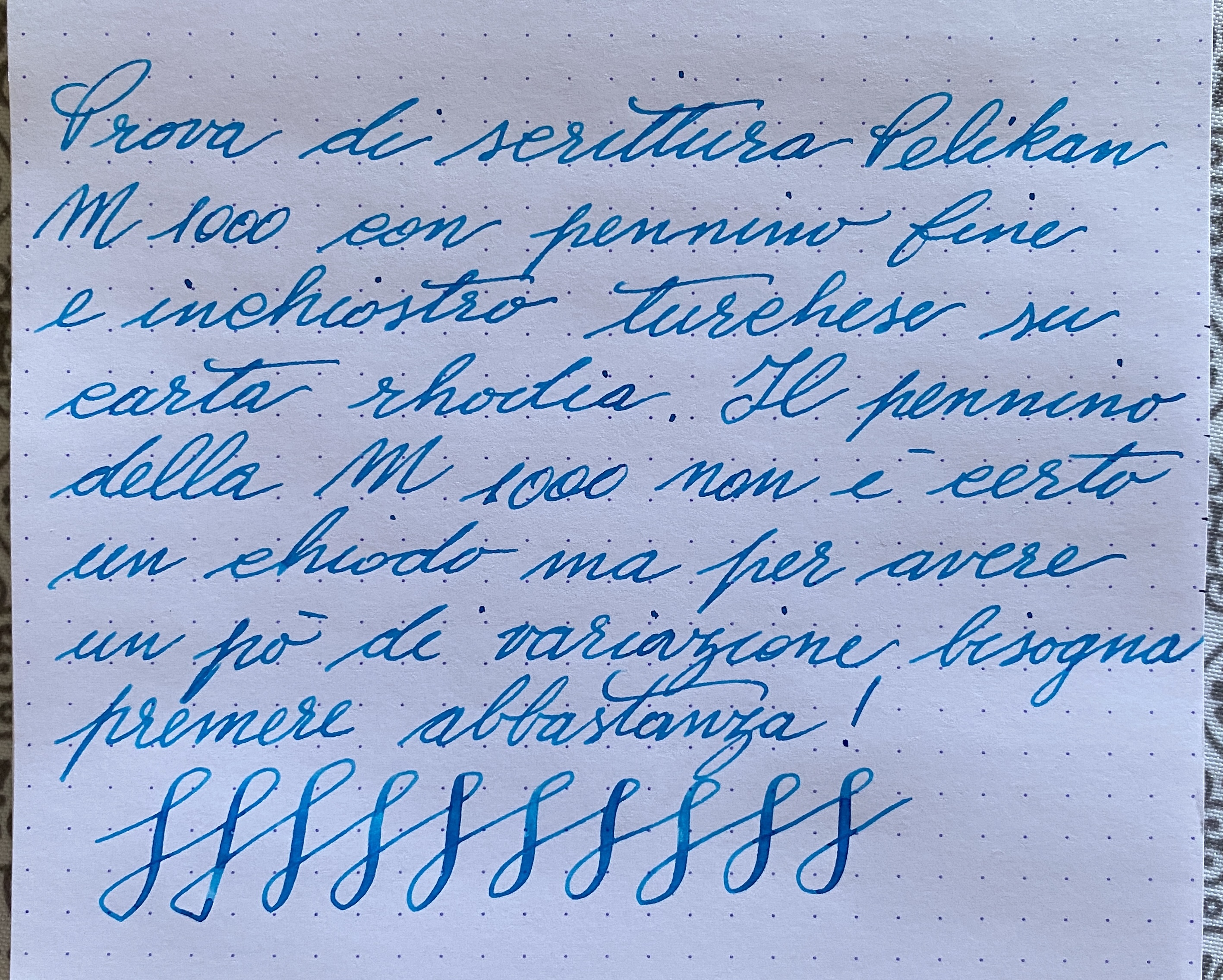 Ciao Marco, scusa il ritardo ma...sono riuscito ad entrare in ufficio solo ora! Ti invio uno scarabocchio fatto su carta Rhodia dot pad. La penna è un ef sebbene abbia il sistema di caricamento in ottone il peso non lo trovo affaticante, è sempre piacevole utilizzarla, ha un flusso leggermente bagnato come di norma per la marca, il pennino è rigido ma ha una certa morbidezza con i suoi 27 mm (misurati con il righello) è davvero maestoso anche rispetto alla mia 805. E' una penna che sono contentissimo di avere come tutte le altre Pelikan vintage incluse! :wave: