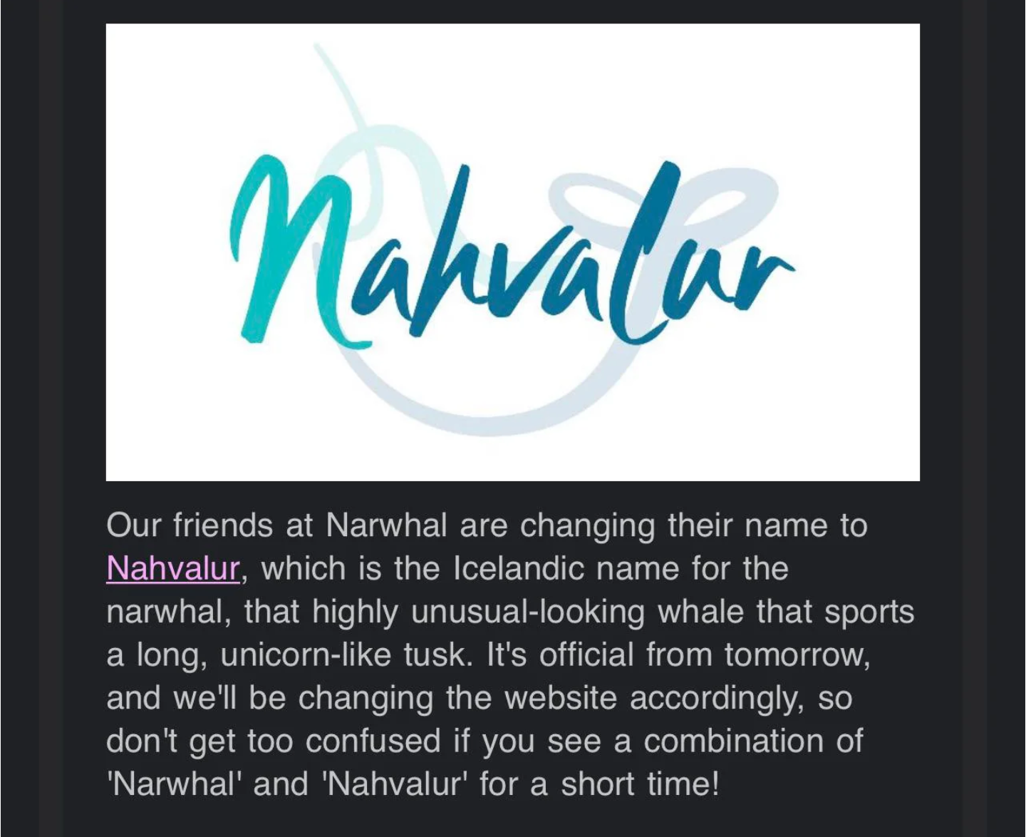 "I nostri amici di Narwhal stanno cambiando il nome in Nahvalur, che è il nome islandese del narvalo (Narwhal, in inglese), quel cetaceo dall'aspetto insolito che sfoggia una lunga zanna unicursale. È ufficiale da domani e cambieremo il sito web di conseguenza, quindi non confondetevi se vedrete una combinazione di Narwhal e Nahvalur per un breve periodo."