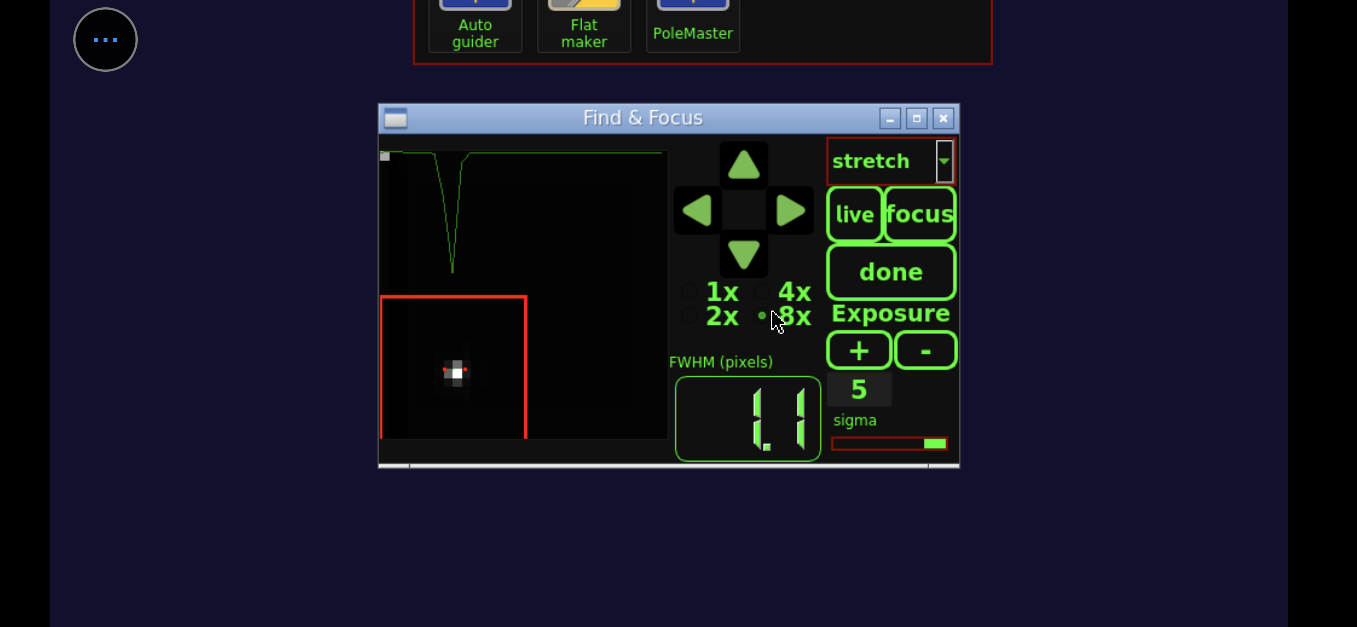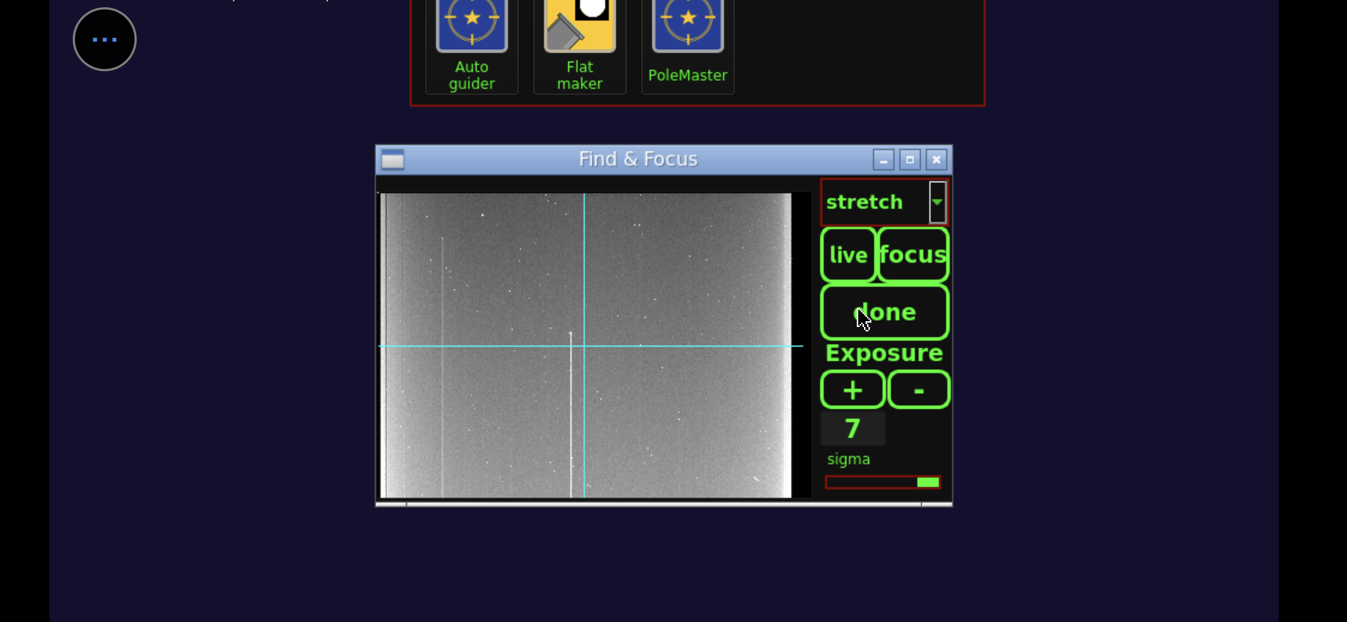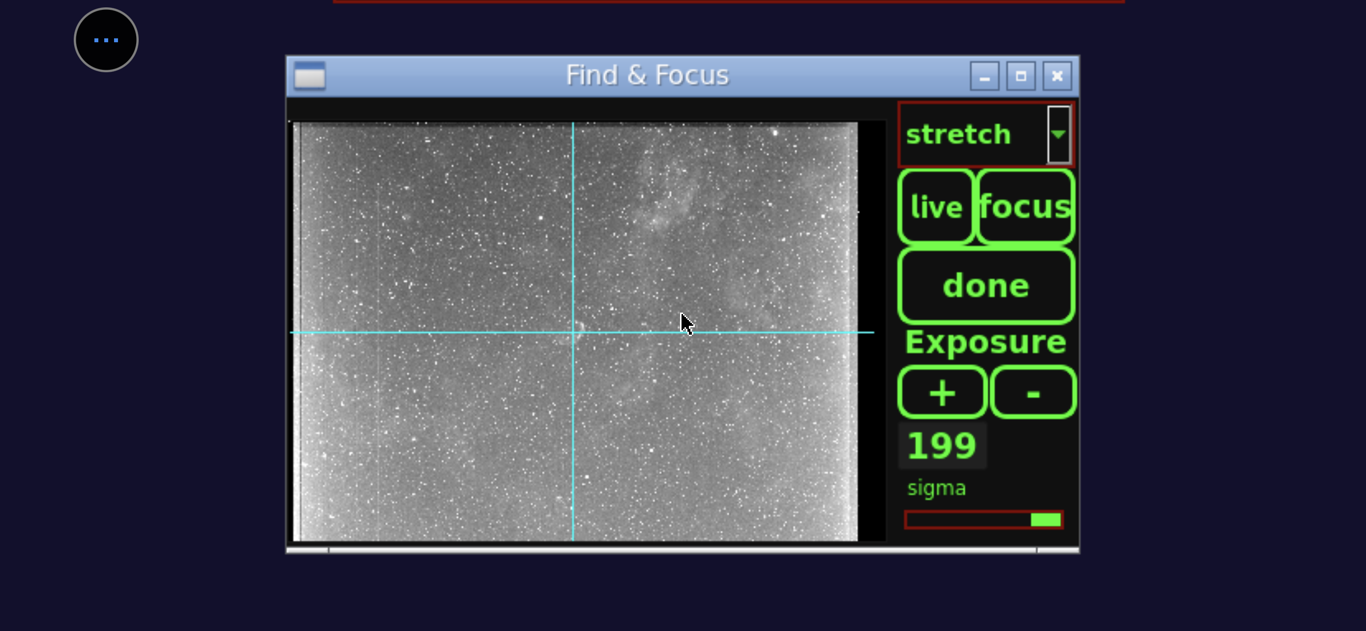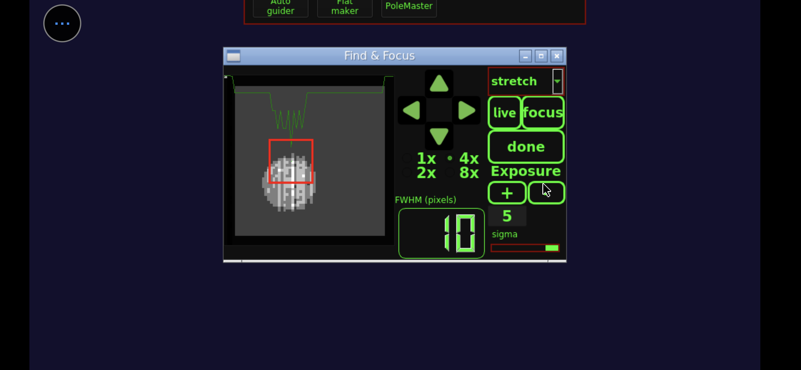 Aprendo l'apposito pannello "Focus" abbiamo una misurazione della dimensione della stella in pixel. L'uso di una stella luminosa come Vega fa molto comodo con filtri così stringenti perché ci permette di usare un tempo di refresh del live view di 5 decimi di secondo, vedendo le regolazioni quasi in tempo reale. Una stella più piccola richiederebbe tempi più lunghi rendendo noiosa e imprecisa la regolazione. Partiamo con una pessima messa a fuoco da 10 pixel (segno che ho inavvertitamente toccato la ghiera di messa a fuoco durante il trasporto dentro e fuori dal garage) che porto velocemente a valori più consoni. 2 è già un ottimo valore, ma si può migliorare e, infatti, riesco a scendere fino a 1,1. Ora possiamo finalmente puntare il soggetto da fotografare: la Crescent Nebula che può essere trovata nella pulsantiera sia come "oggetto denominato" o con il numero di catalogo NGC6888. La montatura riparte e in un paio di secondi centra il bersaglio. Allunghiamo il tempo di refresh del live view a 20 secondi per controllare di essere nel posto giusto. Una volta trovata la giusta inquadratura (che nel mio caso vede la Crescent al centro, ma poteva vederla spostata più in là per includere meglio la stella Sadr), è il momento di sfruttare l'autoguida per bloccare l'inquadratura.