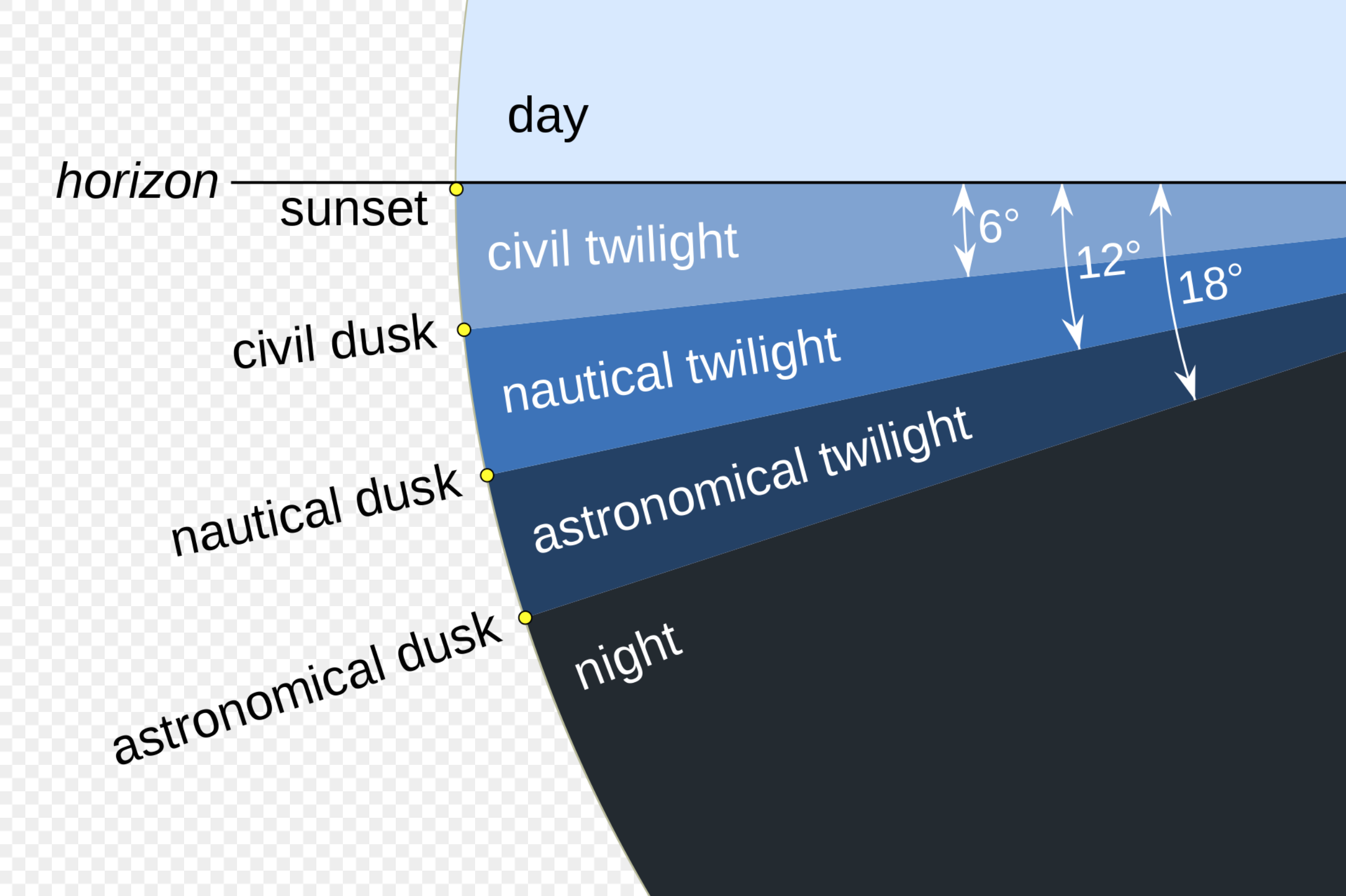 Per sapere il momento esatto in cui si può iniziare a far foto, è necessario conoscere l'orario dell'inizio della notte. Non è scontato come sembra, infatti dopo il tramonto iniziano le 3 fasi del "crepuscolo": civile, nautico e astronomico. Ogni fase finisce quando il Sole scende di 6° sotto l'orizzonte (alla fine del crepuscolo astronomico, il Sole si troverà sotto l'orizzonte di 18° e smetterà di illuminare l'atmosfera, questo è l'inizio della notte), in soldoni si parla di circa 1 ora e 45 minuti dopo il tramonto. App dedicate all'astronomia o al meteo per l'astronomia segnalano sempre l'ora esatta della notte (segnalo ClearOutside che, nonostante non sia di facilissima lettura all'inizio, presenta previsioni meteo spesso più accurate di qualunque altra app).