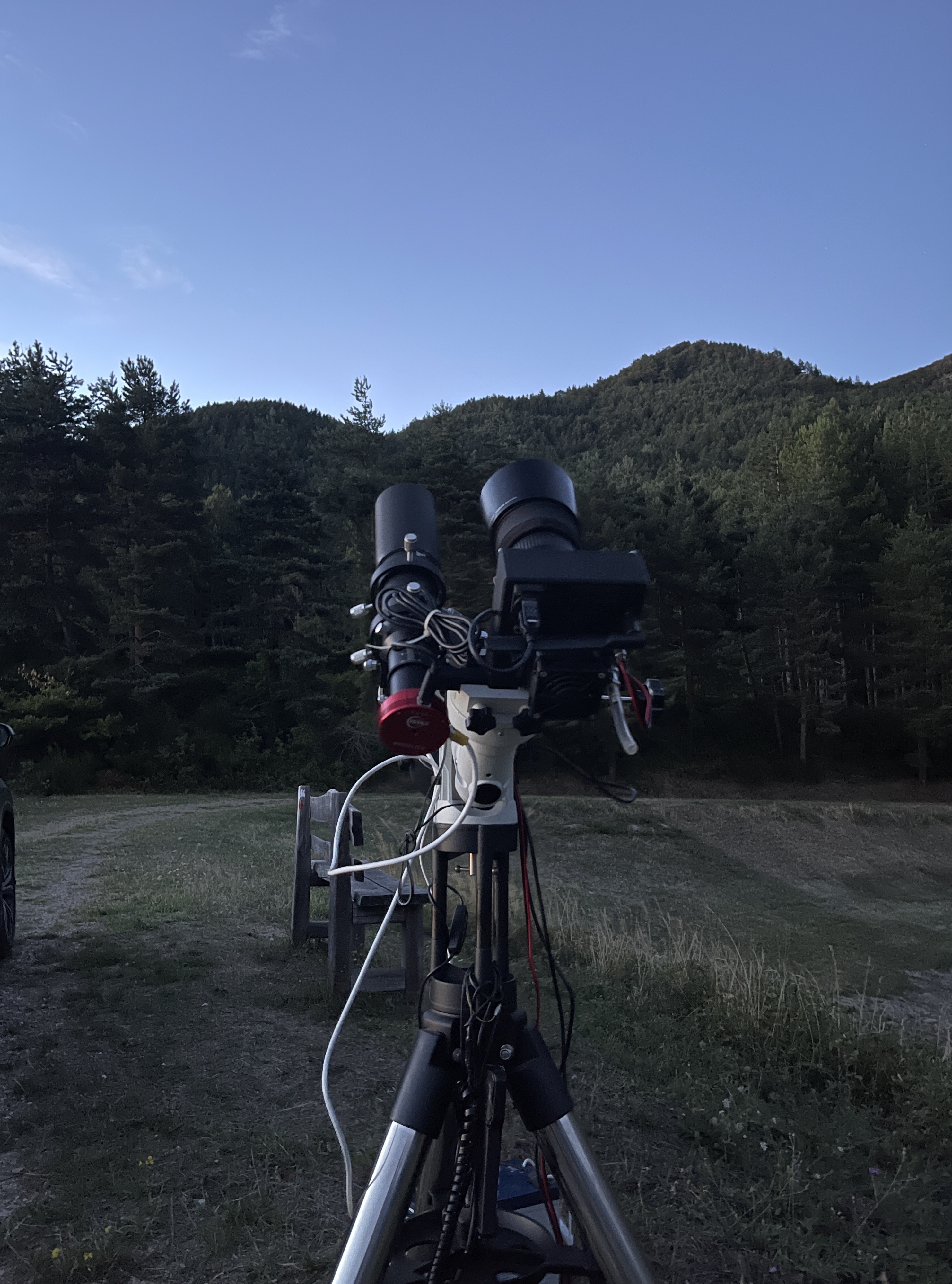 Già durante il crepuscolo la Stella Polare diventerà visibile a Nord, a un'altezza sull'orizzonte pari alla latitudine a cui vi trovate (in Italia si va dai 35° ai 47° circa) ed è piuttosto semplice da riconoscere perché le stelle che la circondano sono molto deboli: se vi trovate in una zona non troppo buia (o effettivamente durante il crepuscolo) la vedrete stagliarsi da sola in cielo, circondata da un anello di cielo vuoto. Non appena la Polare sarà visibile, si potrà procedere con i preparativi. Normalmente, quando fotografo da casa, porto dentro e fuori da garage il setup già completamente montato (anche se con il telescopio grande arrivo a 35kg totali!!), in modo da essere sicuro che tutti i cavi sono sempre collegati, che il bilanciamento sia corretto e che tutto funzionerà come l'ultima volta, dedicando solo un paio di minuti a questa fase.