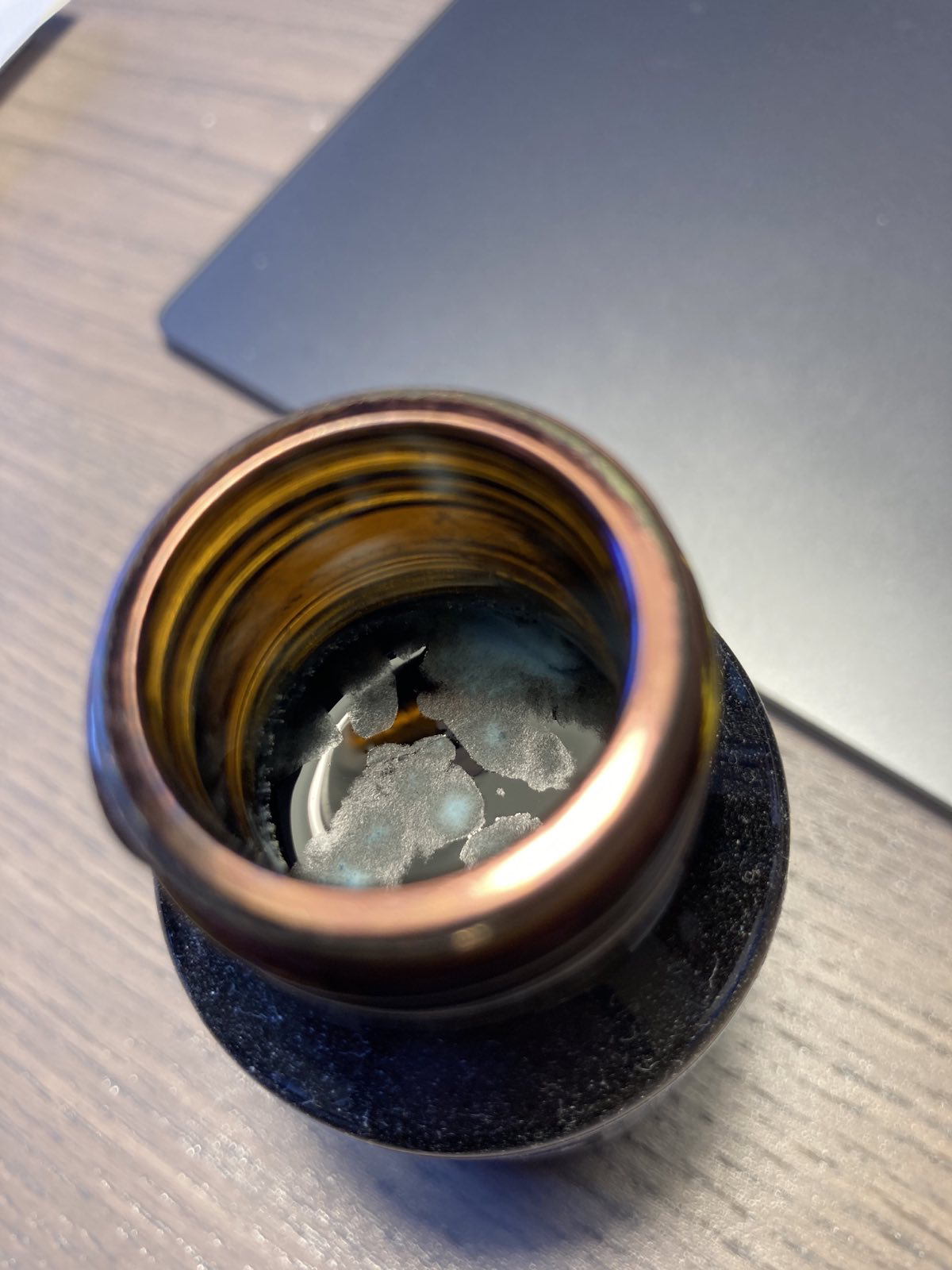sembra muffa, magari prova a metterti in contatto con R&K inviandogli delle foto, so che ad esempio la faber castell invia delle bottiglie di ricambio quando ci sono dei problemi. non ho mai avuto problemi con i miei R&K