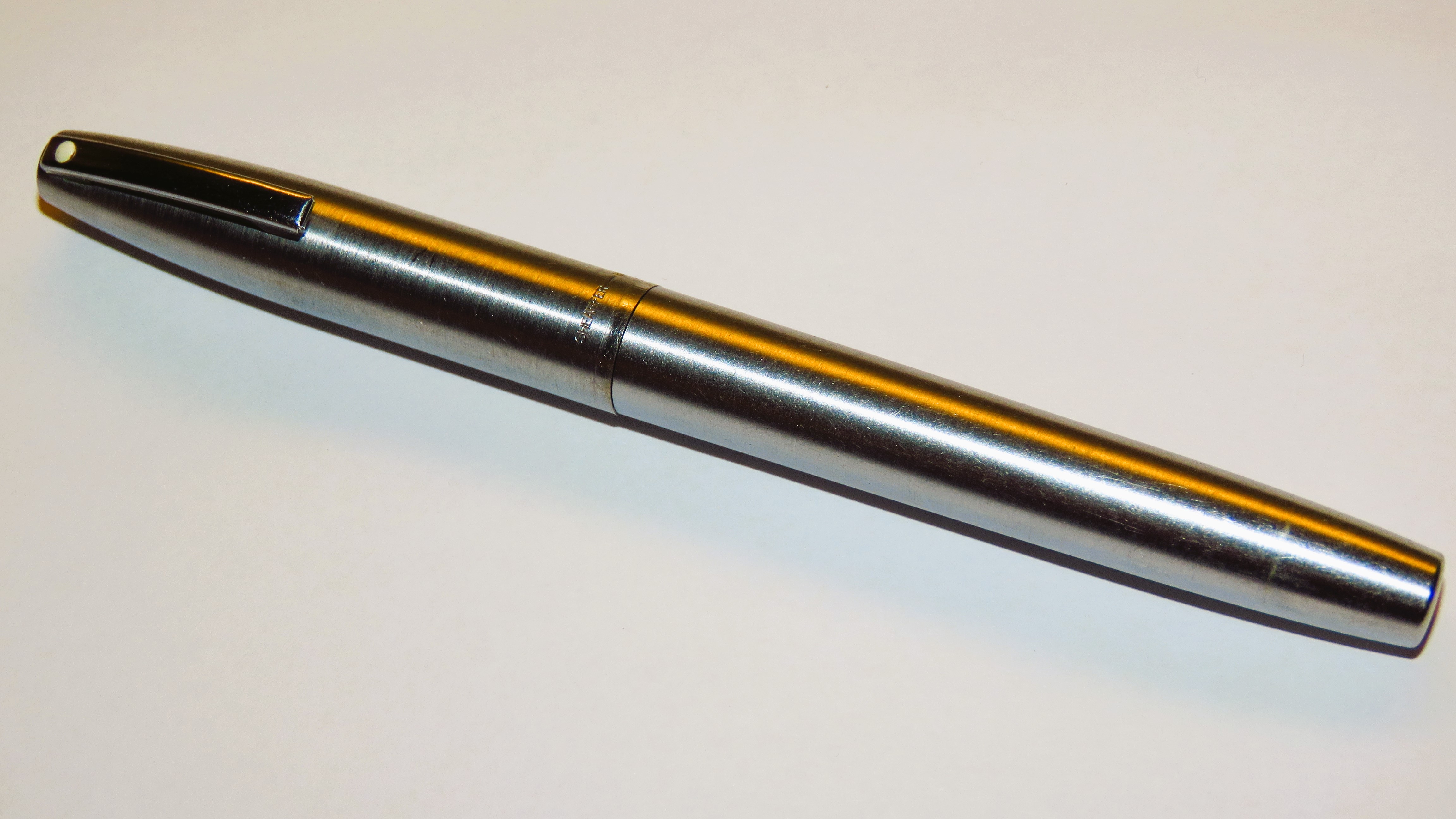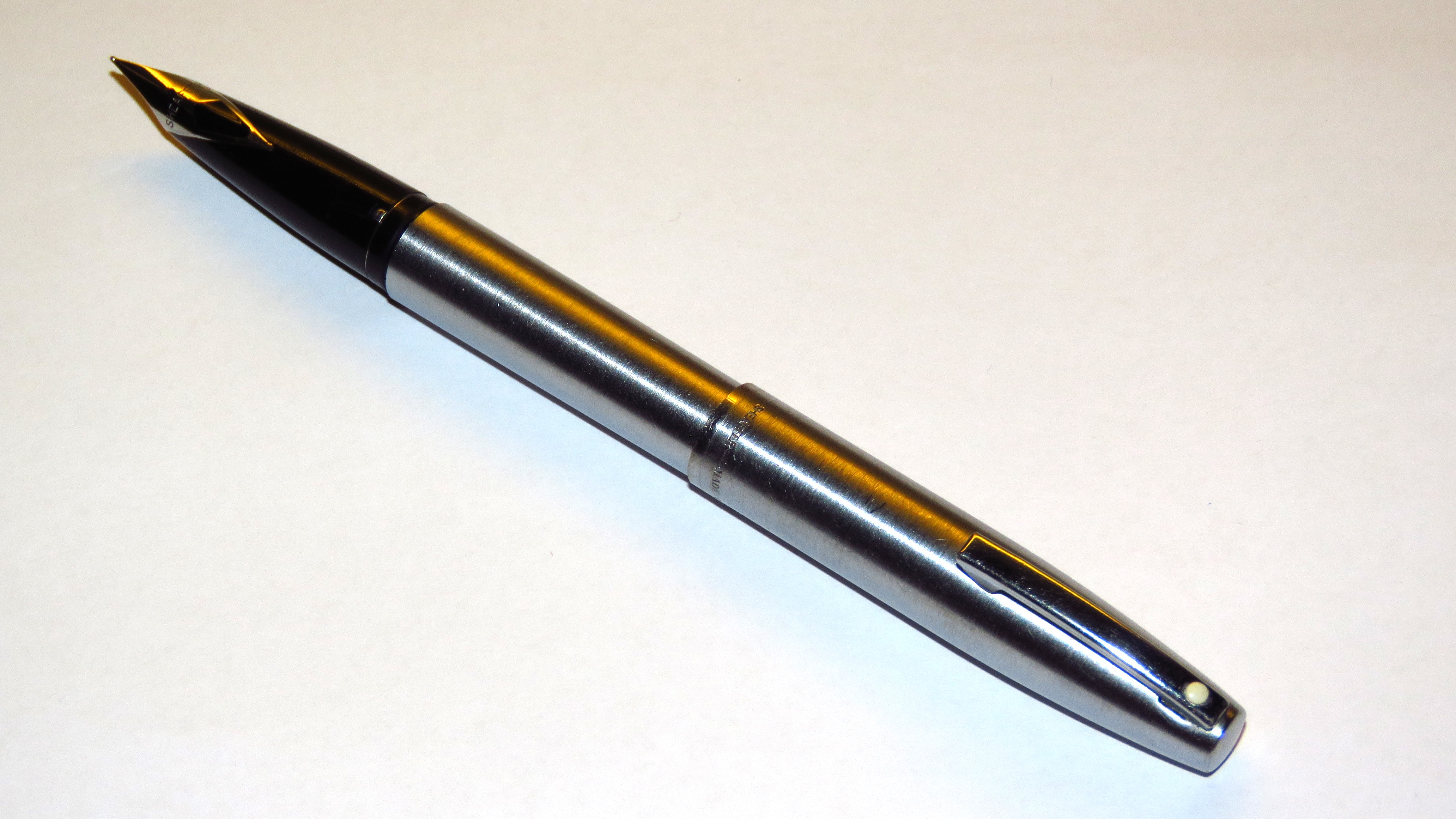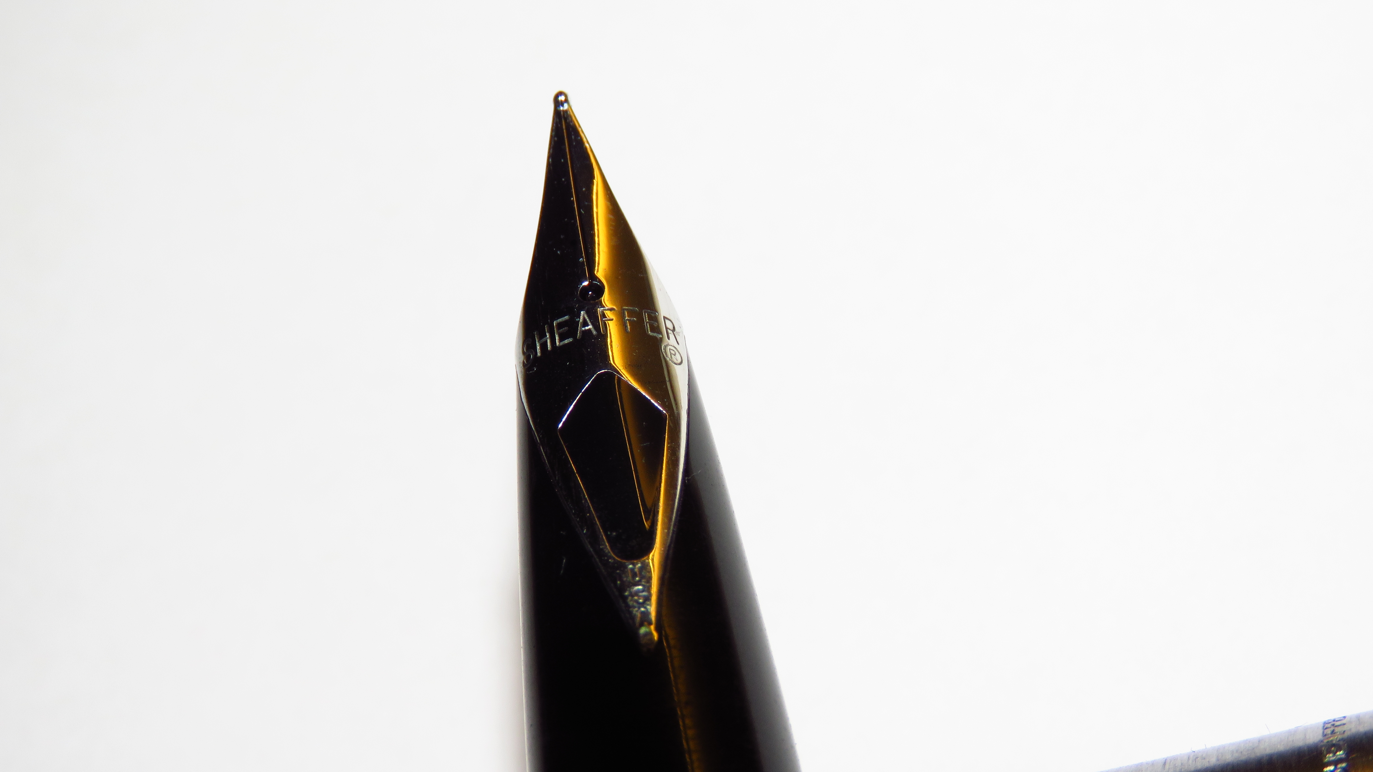 Pennino a coda di rondine, tratto F. Scrive meravigliosamente bene grazie alla pallina di iridio lavorata a sfera.