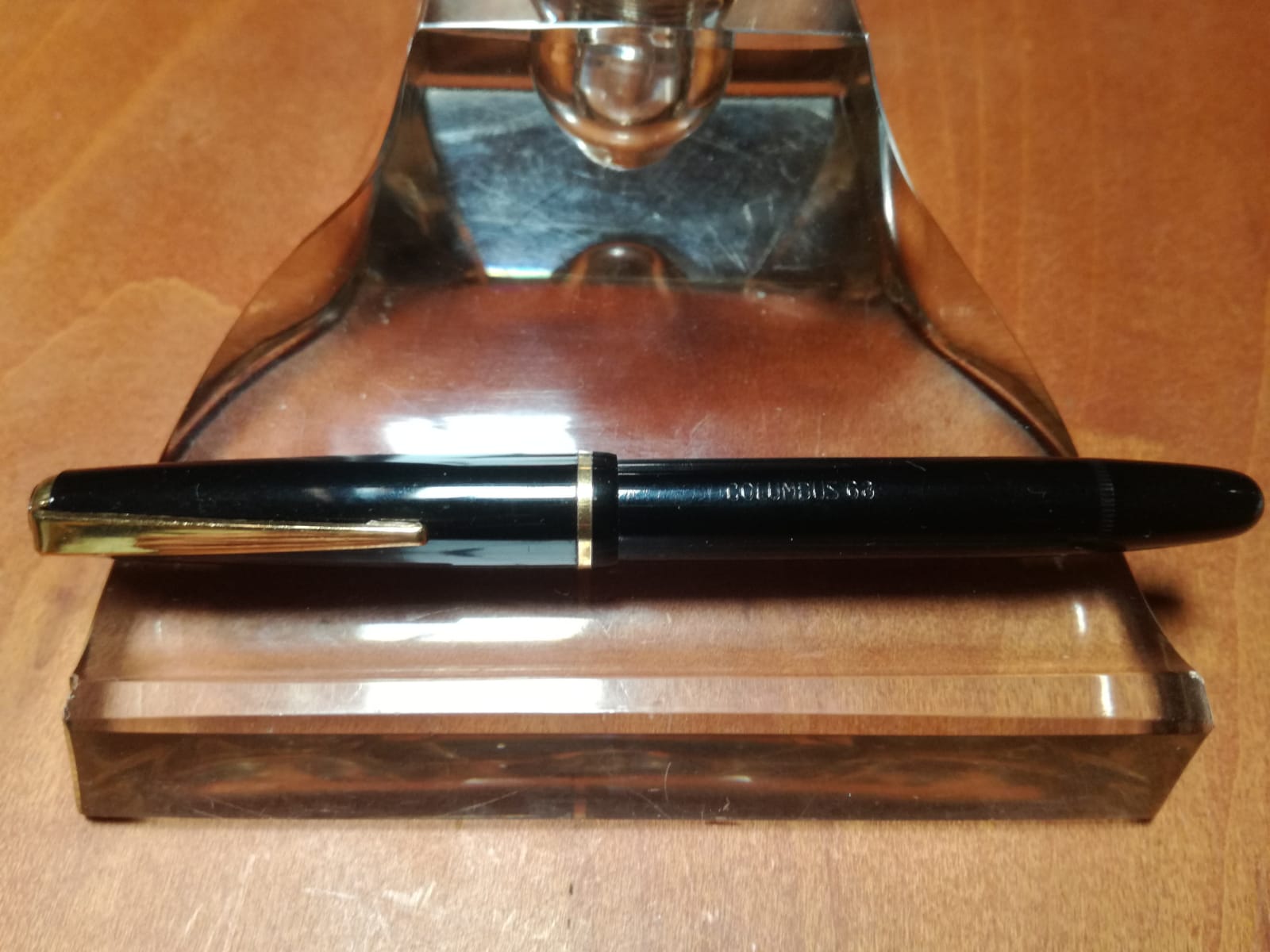 volevo mostrarvi una piccola penna trovata nuova, prodotta - immagino - negli anni Sessanta del secolo scorso. Si tratta di una Columbus 63, pennino in oro, marcato Columbus 15 e alimentatore in ebanite. Cappuccio con chiusura a vite, testina con jewel in plastica, veretta dorata singola sottile e due forellini. Clip di forma triangolare allungata piatta. Fusto con finestra di visualizzazione del livello di inchiostro, con la stampigliatura "Columbus 63" in stampatello. Alimentazione a pistone.