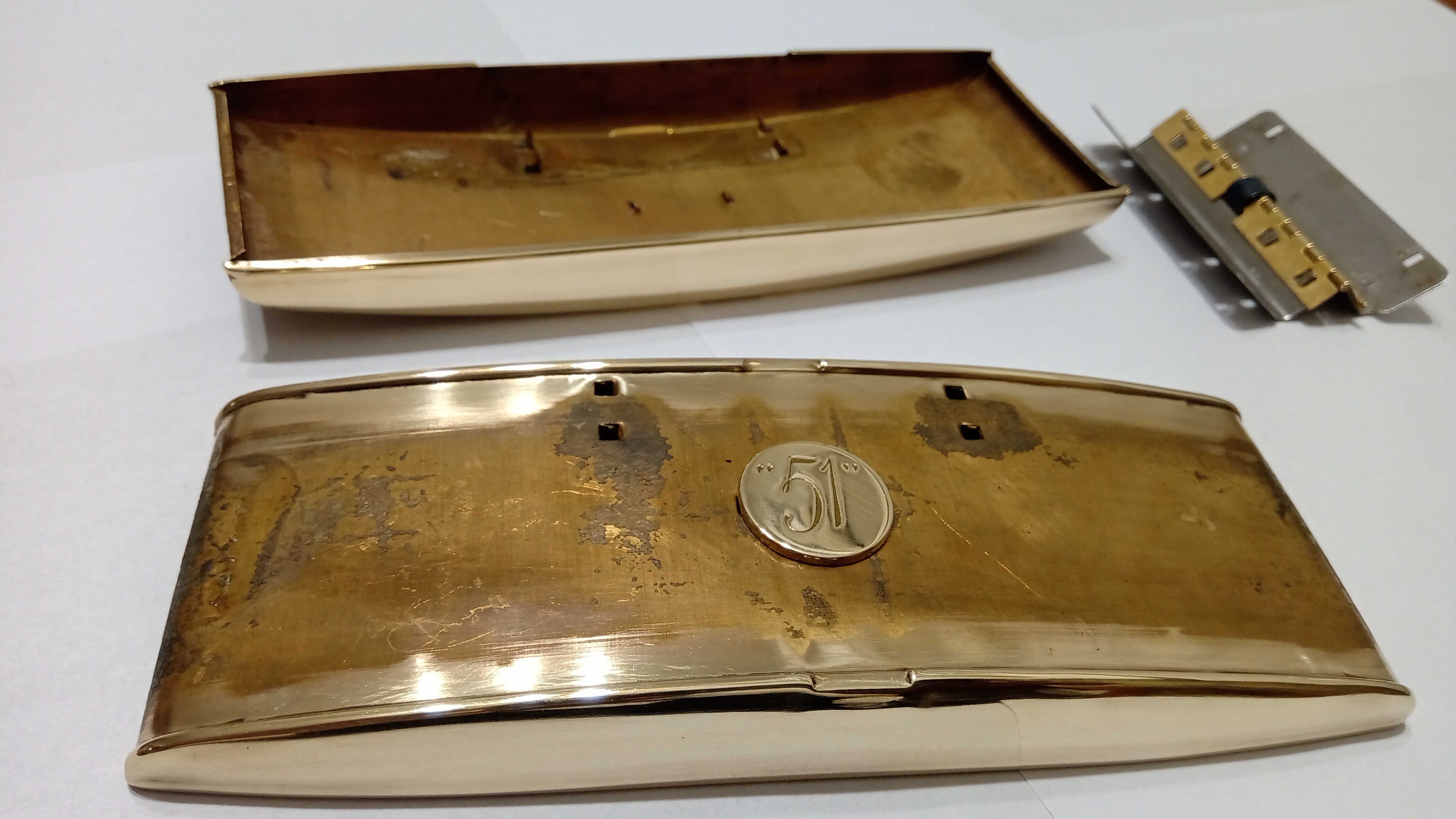 Ora è il momento della scatola in ottone, che è stata completamente smontata, rimuovendo la cerniera, il logo del coperchio e i rivestimenti esterni ed interni che erano deteriorati e macchiati,