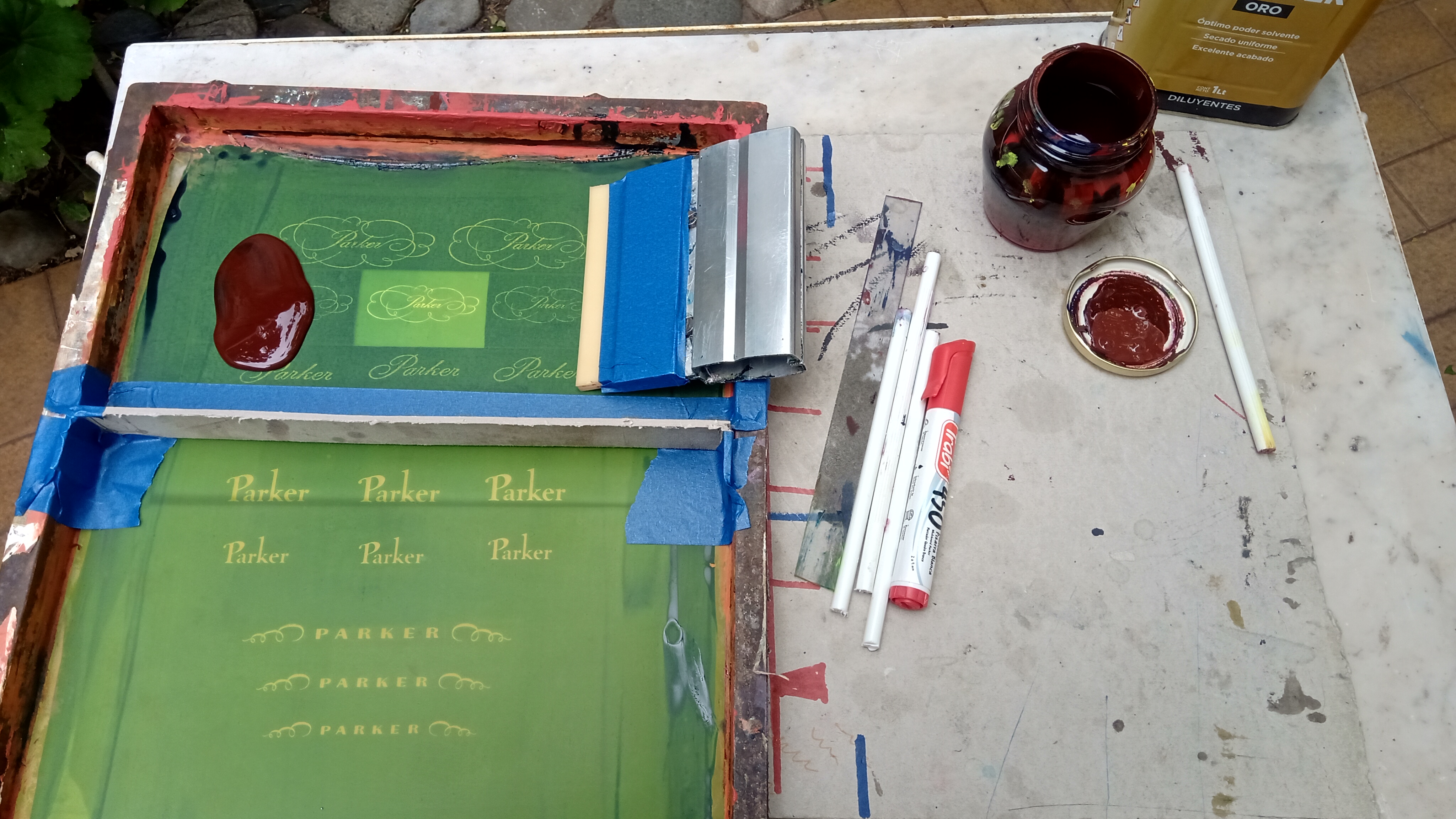 Ora inizia il processo di stampa, posizionando parte dell'inchiostro preparato sul telaio, appoggiandolo saldamente sul tessuto teso, e passando una racla per far passare l'inchiostro attraverso la rete e depositarlo sul tessuto...
