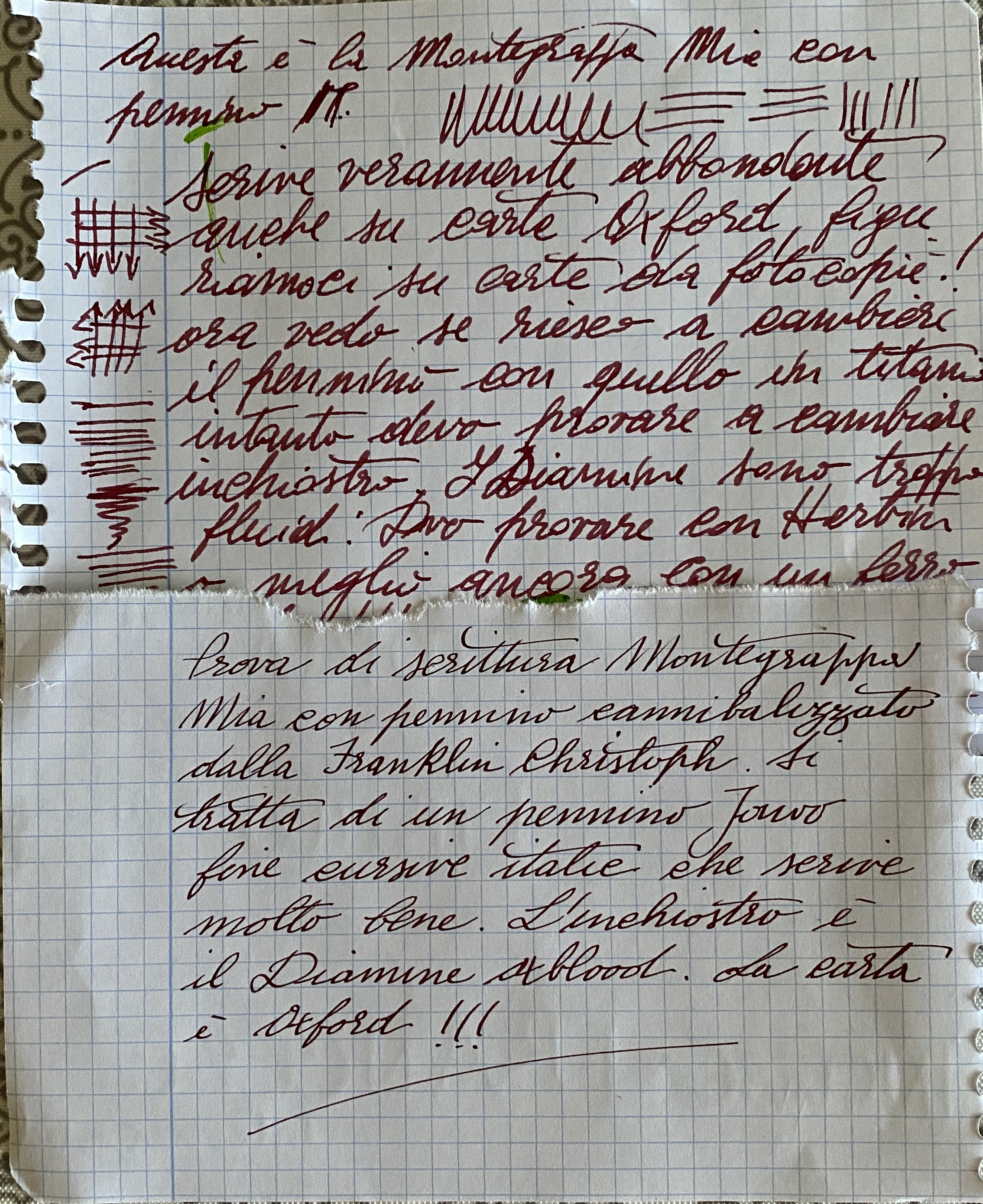 Operazione riuscita grazie, in attesa di comprare un pennino Montegrappa, ho trapiantato quello della FC che tra l’altro è un signor pennino fine cursive italic realizzato da un nib master che lavora per la ditta americana e che scrive molto bene anche se ha un feedback non per tutti