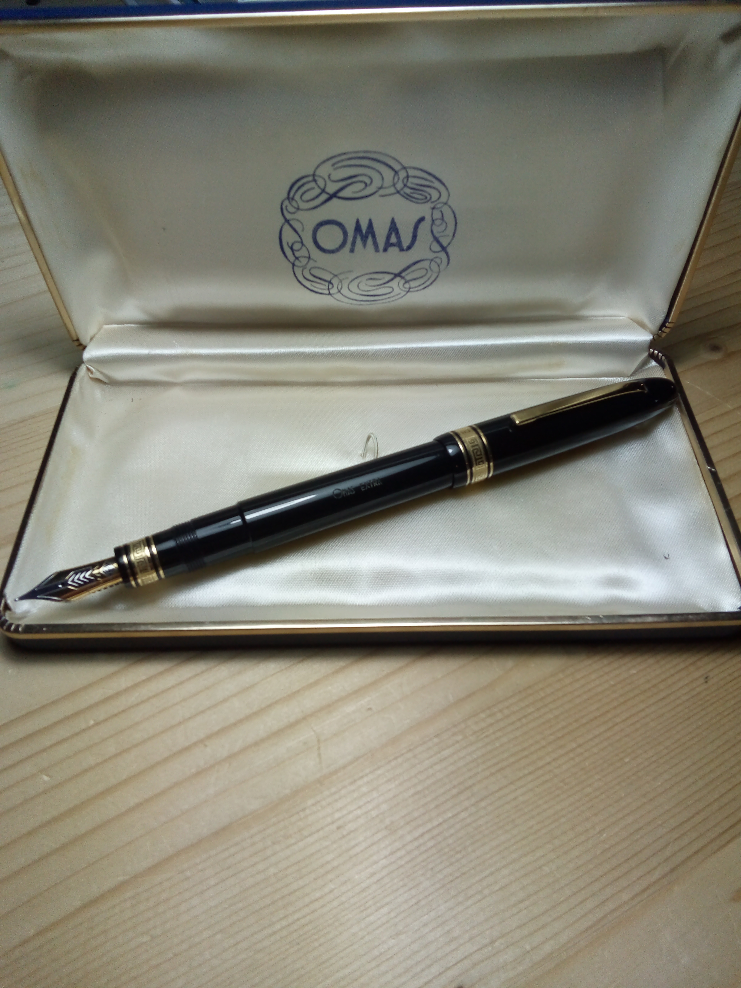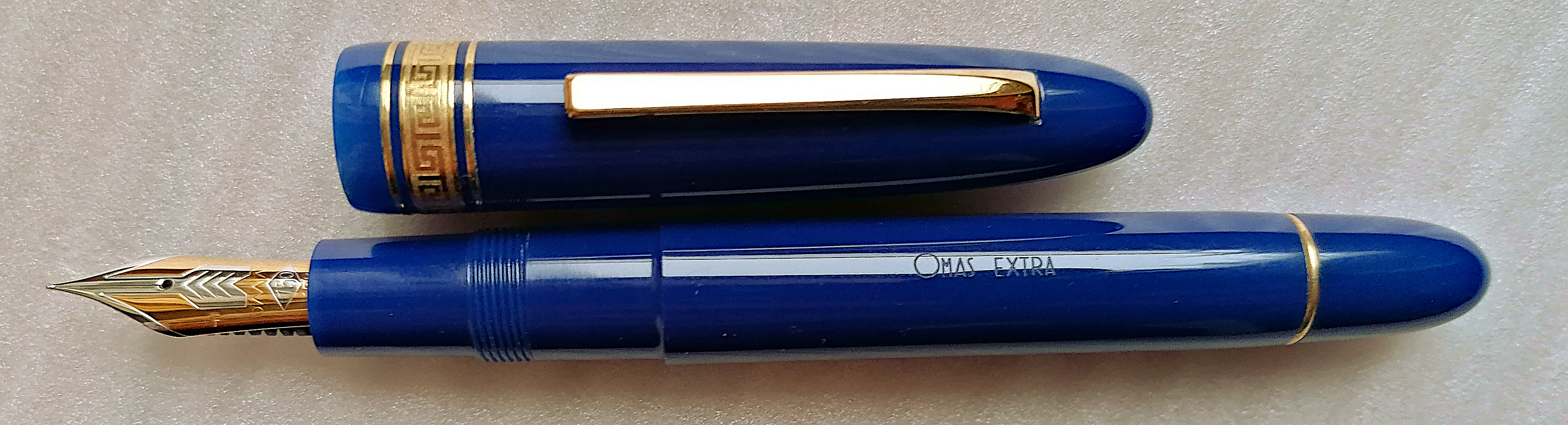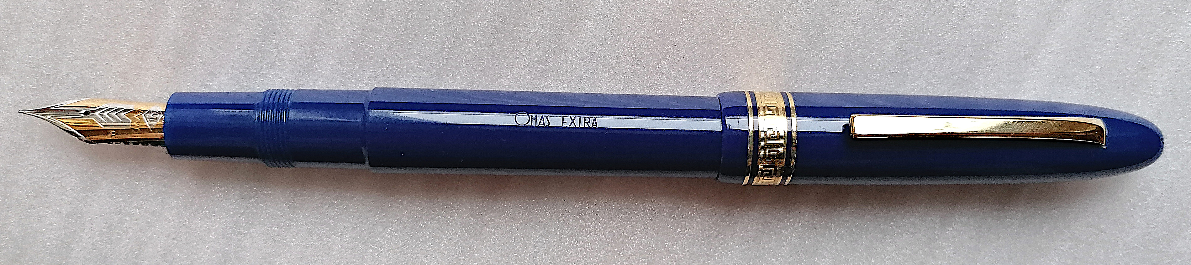 Buongiorno a tutte/i, un mio caro amico mi ha fatto pervenire questa OMAS EXTRA di uno splendido colore blu, sperando che io fossi in grado di darle un nome ed una valutazione. La penna non è mai stata usata ed è dotata di confezione,controscatola e garanzia originali.
