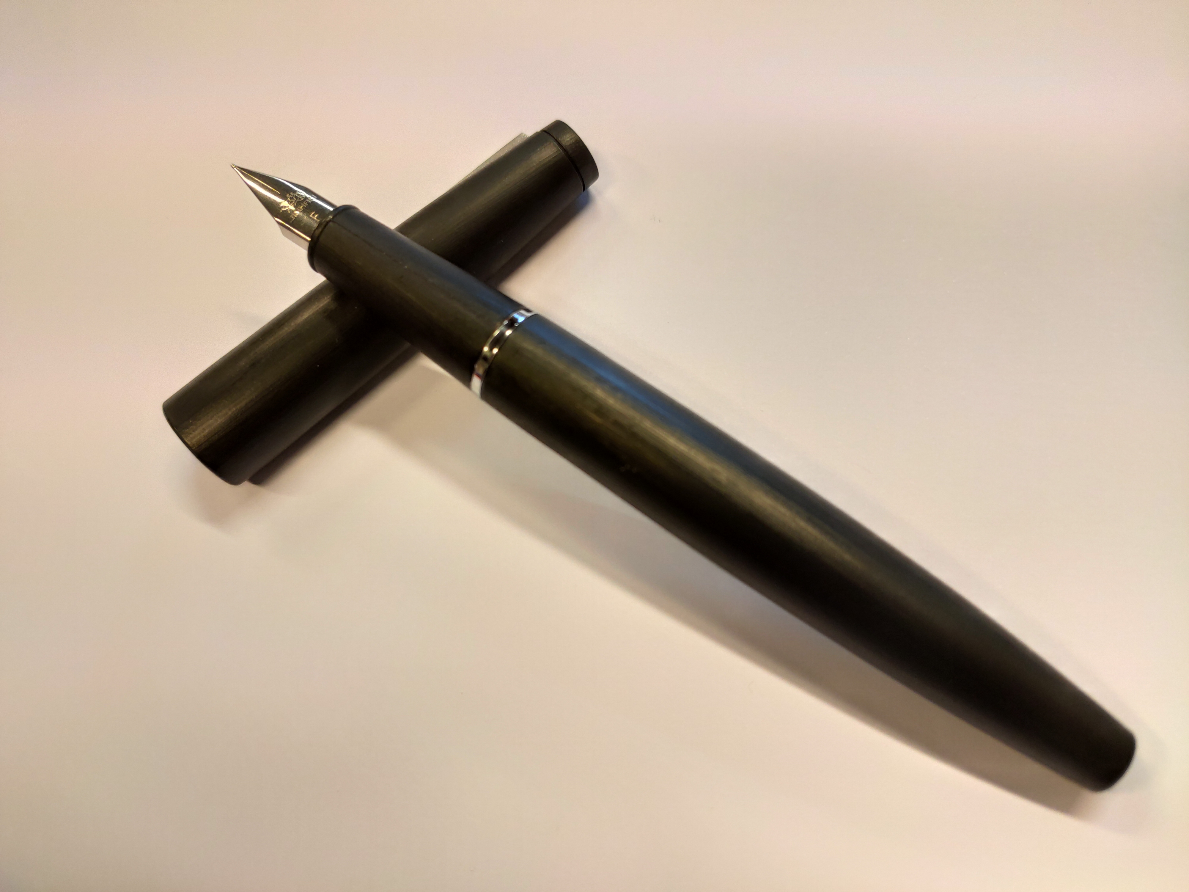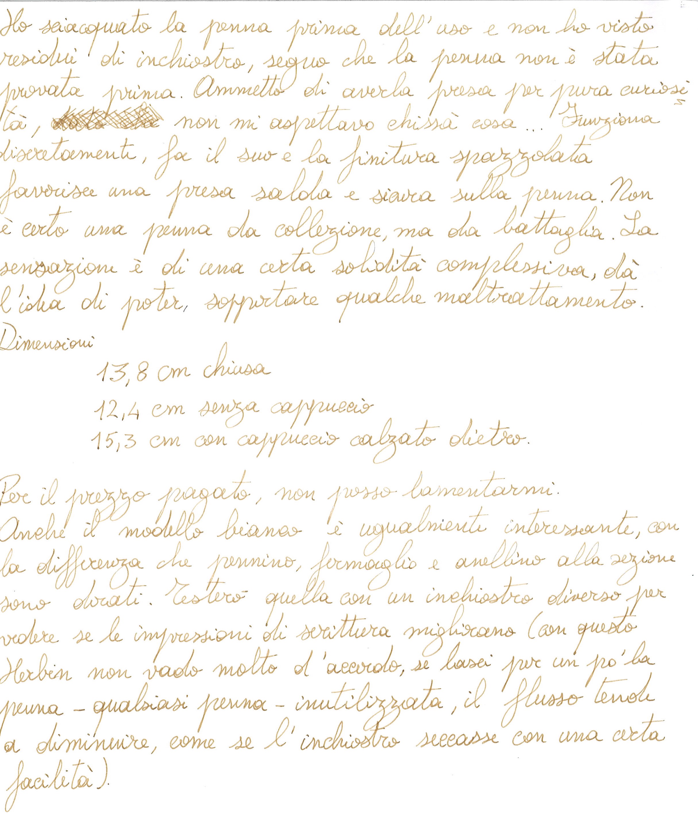 Ho fatto l'errore di caricare la nera con Herbin Lie de The, che è un inchiostro che secca moltissimo i pennini (e riduce il flusso fino ad azzerarlo). Lo fa con tutte le penne che ho, quindi non era il più indicato per una prova e, personalmente, ho finito per detestarlo. La bianca, però, è stata caricata con Pelikan 4001 dark green e la resa è stata perfetta.