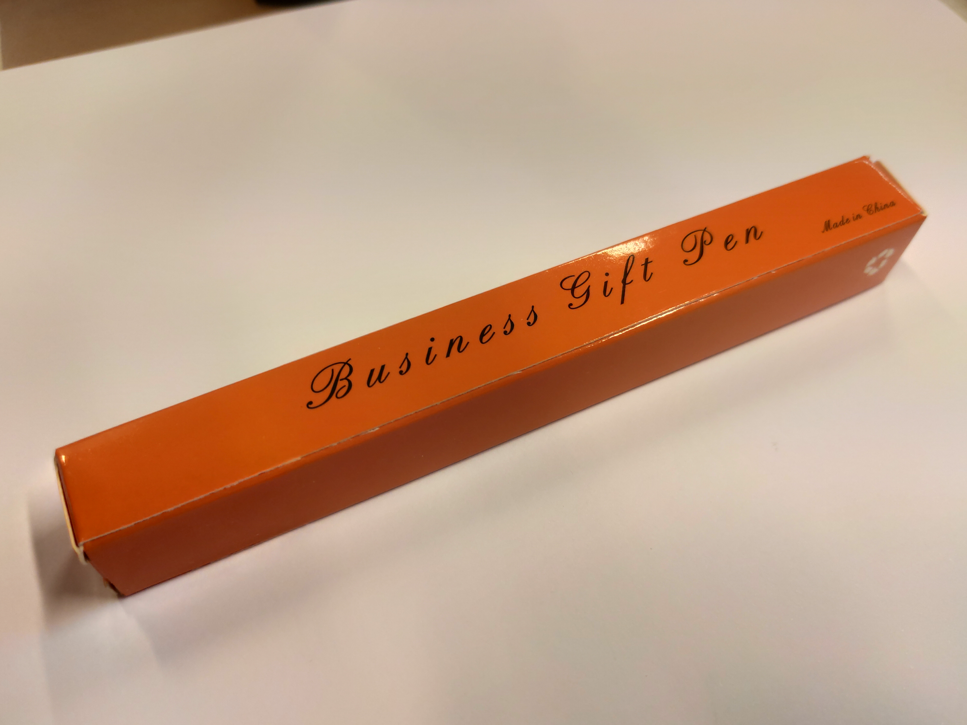Sono arrivate, quindi ve le presento. Il "corredo" fa pena. Appena una scatolina di cartone, all'interno della quale è presente la penna in un sacchettino di plastica. Ma, per il prezzo pagato, non mi aspettavo nemmeno la scatolina.