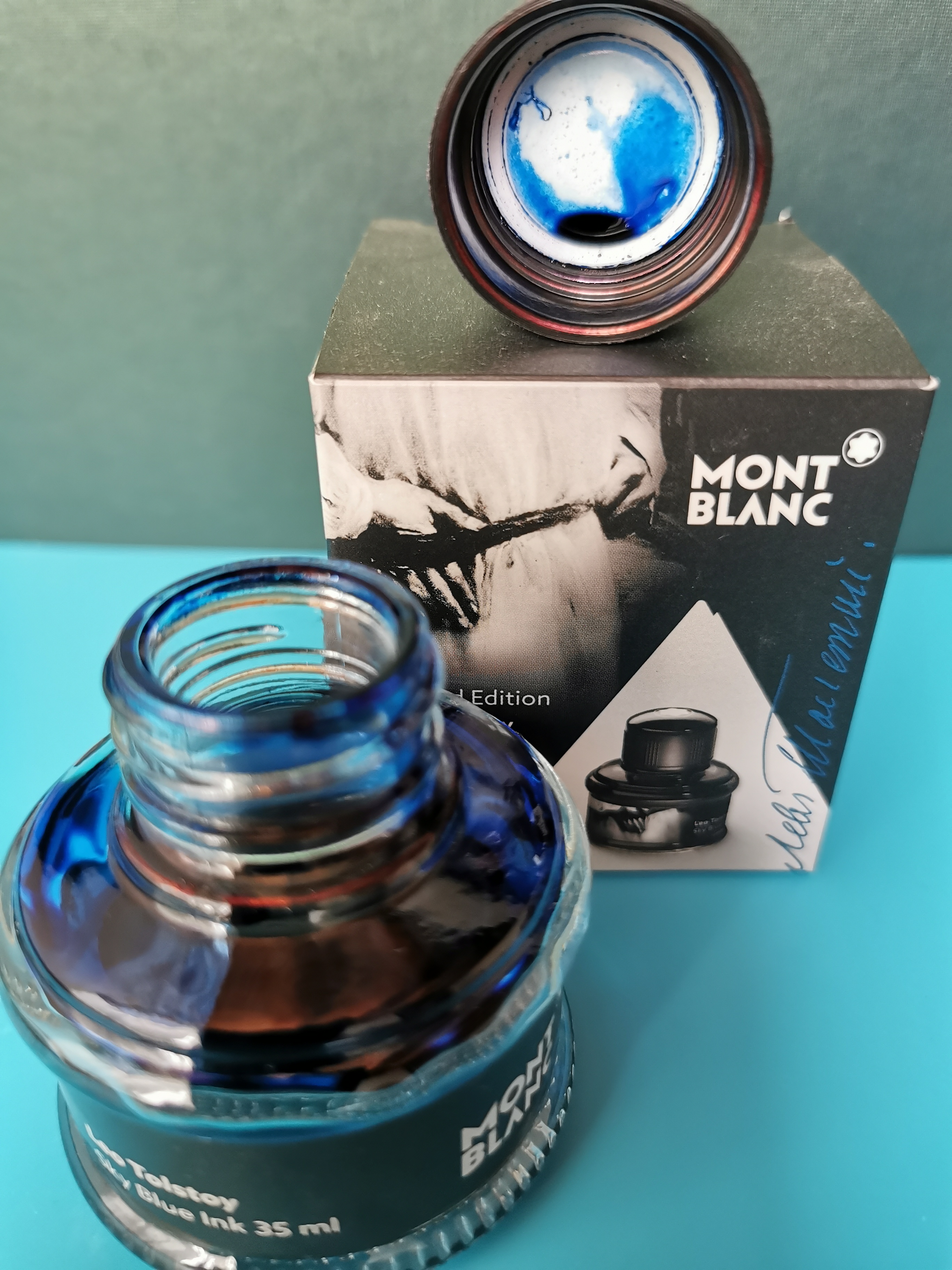 Uno dei colori che mi piace di più in assoluto è il blu del Montblanc Leo Tolstoy, un'edizione limitata di qualche anno fa. Ne avevo preso, ahimè, solo un calamaio e ora è quasi finito..