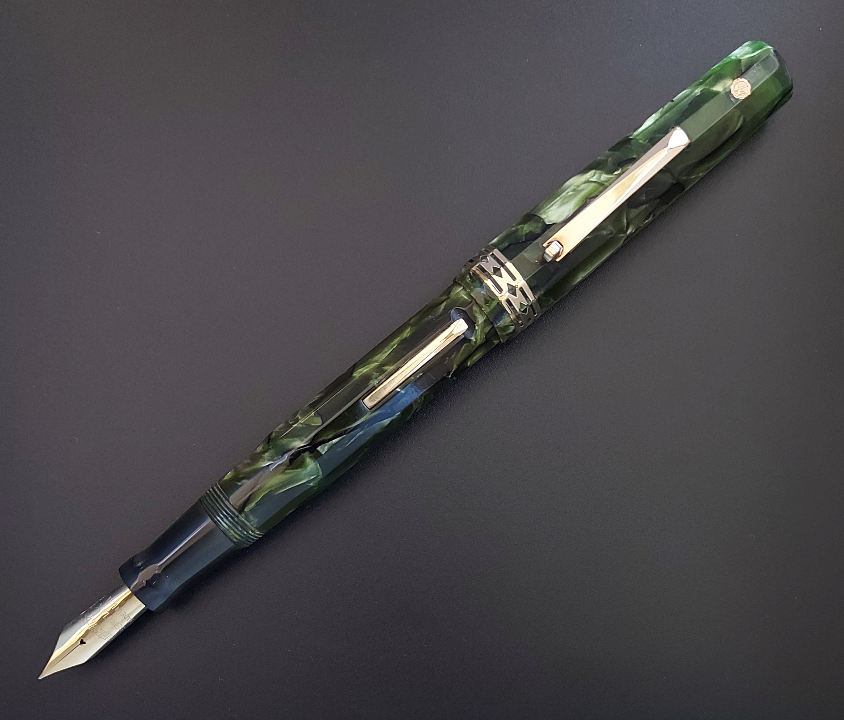 EVERSHARP DORIC OVERSIZE color “KASHMIR” [codice 86101 DC], in celluloide tornita dal pieno, parti metalliche a vista laminate oro, cappuccio a vite, pennino Eversharp in oro 14 carati in sistema “Personal Point”, caricamento a levetta, produzione U.S.A., anno 1931.