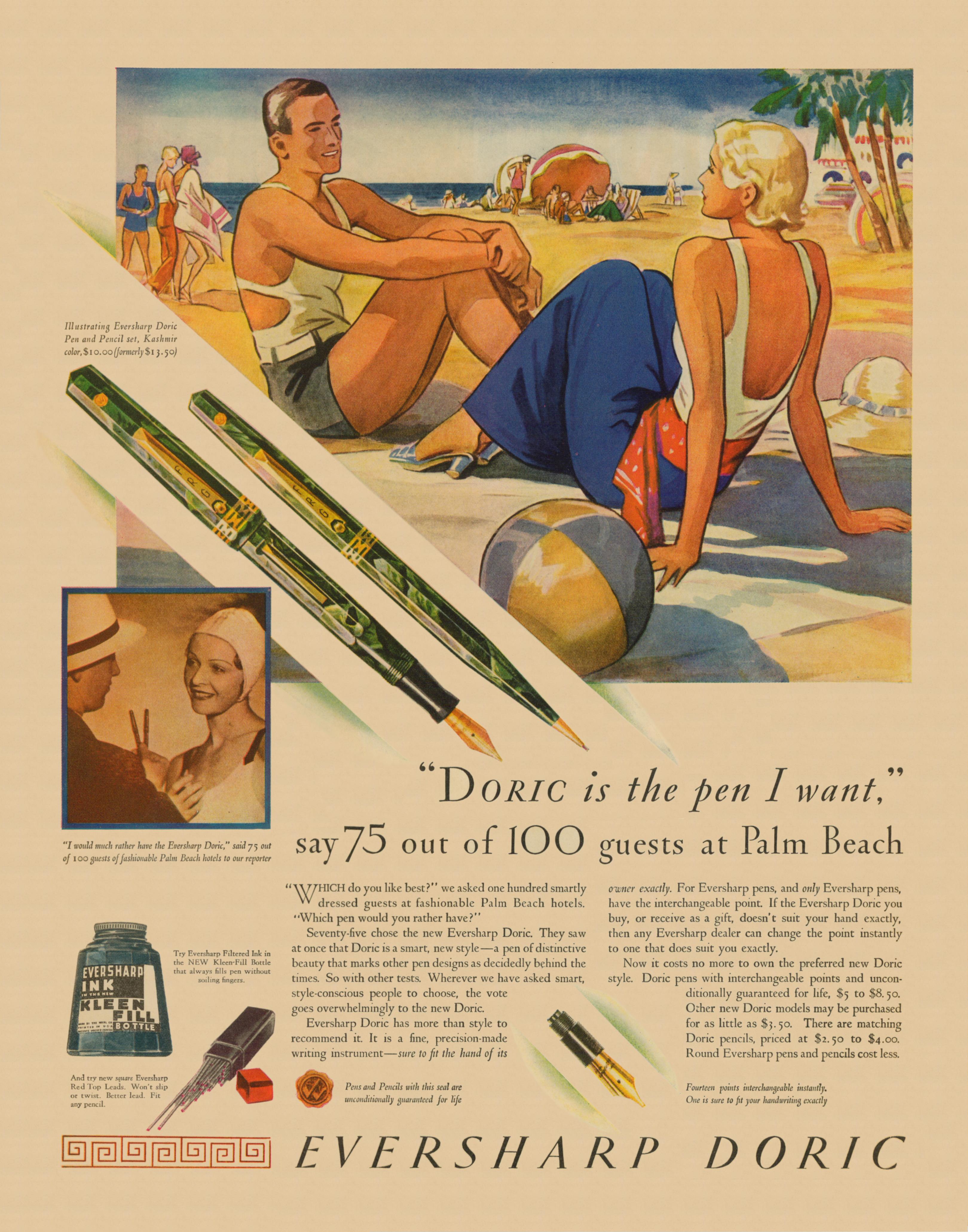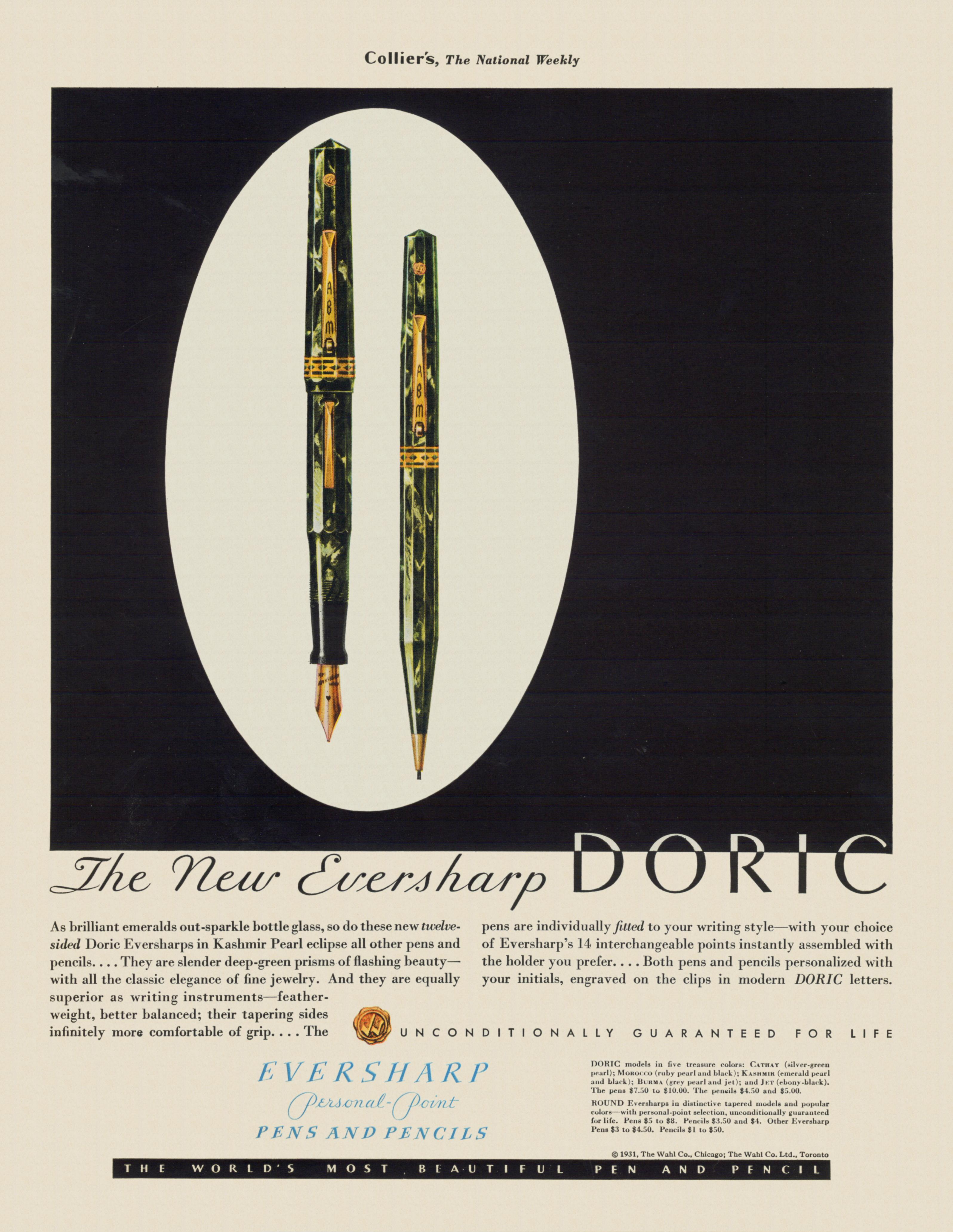 Per mantenere il passo della concorrenza tra le Big Five all’inizio degli anni Trenta, Wahl-Eversharp aveva bisogno di una nuova forma “moderna” e di un nome evocativo che l’accompagnasse al successo. La Waterman aveva creato solo pochi mesi prima la sublime (di fatto oltre che di nome) Patrician: per la nuova linea del 1930-1931, in piena Grande Crisi, ci sarebbe voluto qualcosa di altrettanto “memorabile”. La Eversharp (nella prospettiva di sostituire la tradizionale Deco Band ) aveva allora provato ad inseguire la Sheaffer, copiando sfacciatamente la nuova forma “a sigaro” del modello Balance e quasi esattamente anche il suo nome (“Equi-Poised” = ben bilanciato)! Ma la tutela del design della Sheaffer era inattaccabile e la Eversharp dovette ridisegnare velocemente la linea per arrivare, dopo due “aggiustamenti” successivi in brevissimo tempo ad una terza versione della “Equi-Poised” (ormai irriconoscibile come “Balance”) dalla quale presto scaturirà la nuova Doric. Ecco le due penne accostate (nel mio fotomontaggio di una pubblicità francese): il “modello cilindrico” della “Equi-Poised” (ancora senza un vero nome nel 1932, a pochi mesi ormai dalla dismissione!) e il nuovissimo modello faccettato Doric.
