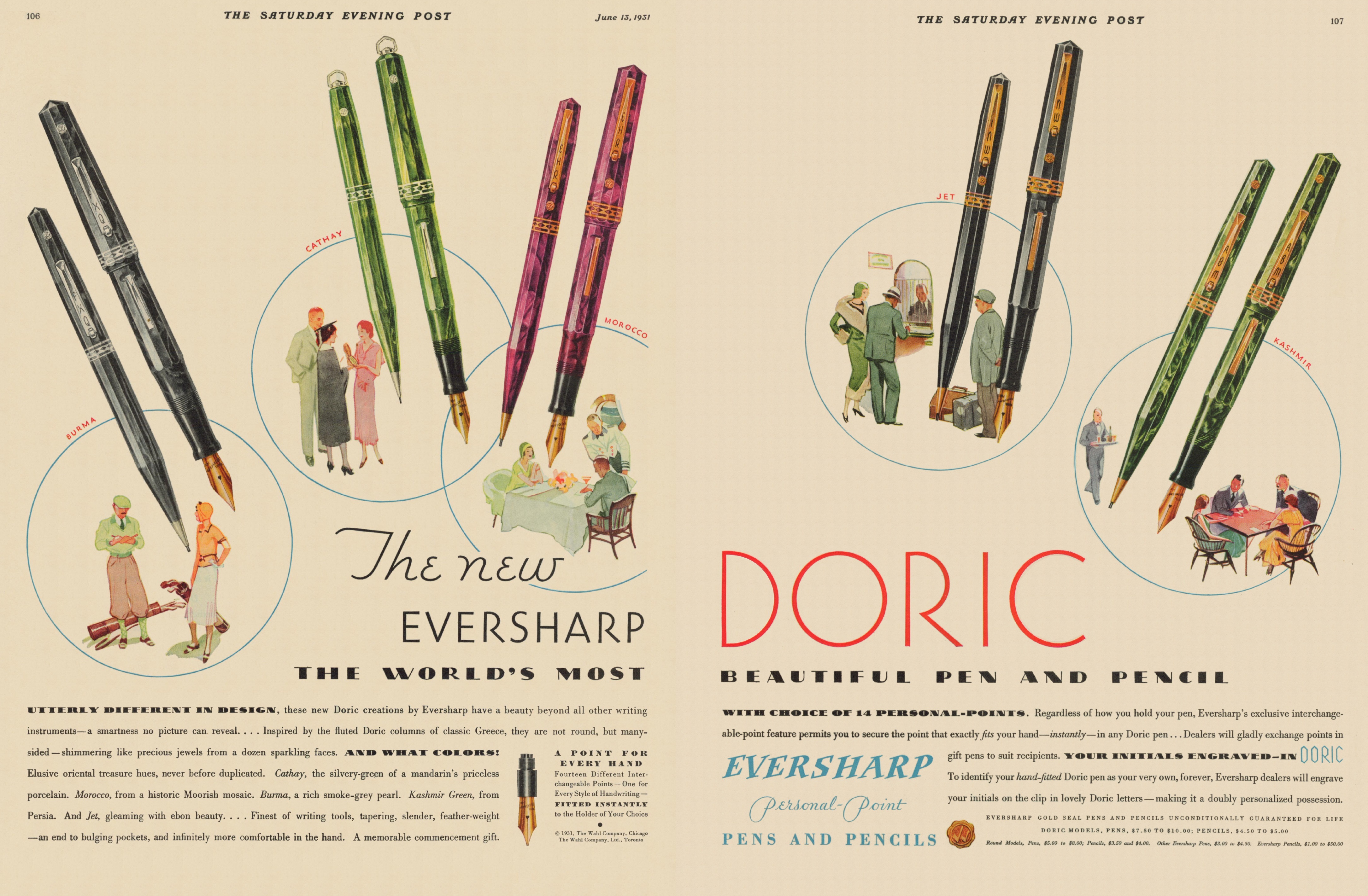 Imparata la lezione, dopo aver creato un capolavoro, fu scelto il nome adatto a rappresentarlo: Eversharp rispondeva così alla Waterman sul suo terreno, contrapponendo al romano “Patrician” l’olimpico (e finalmente memorabile) “Doric”!