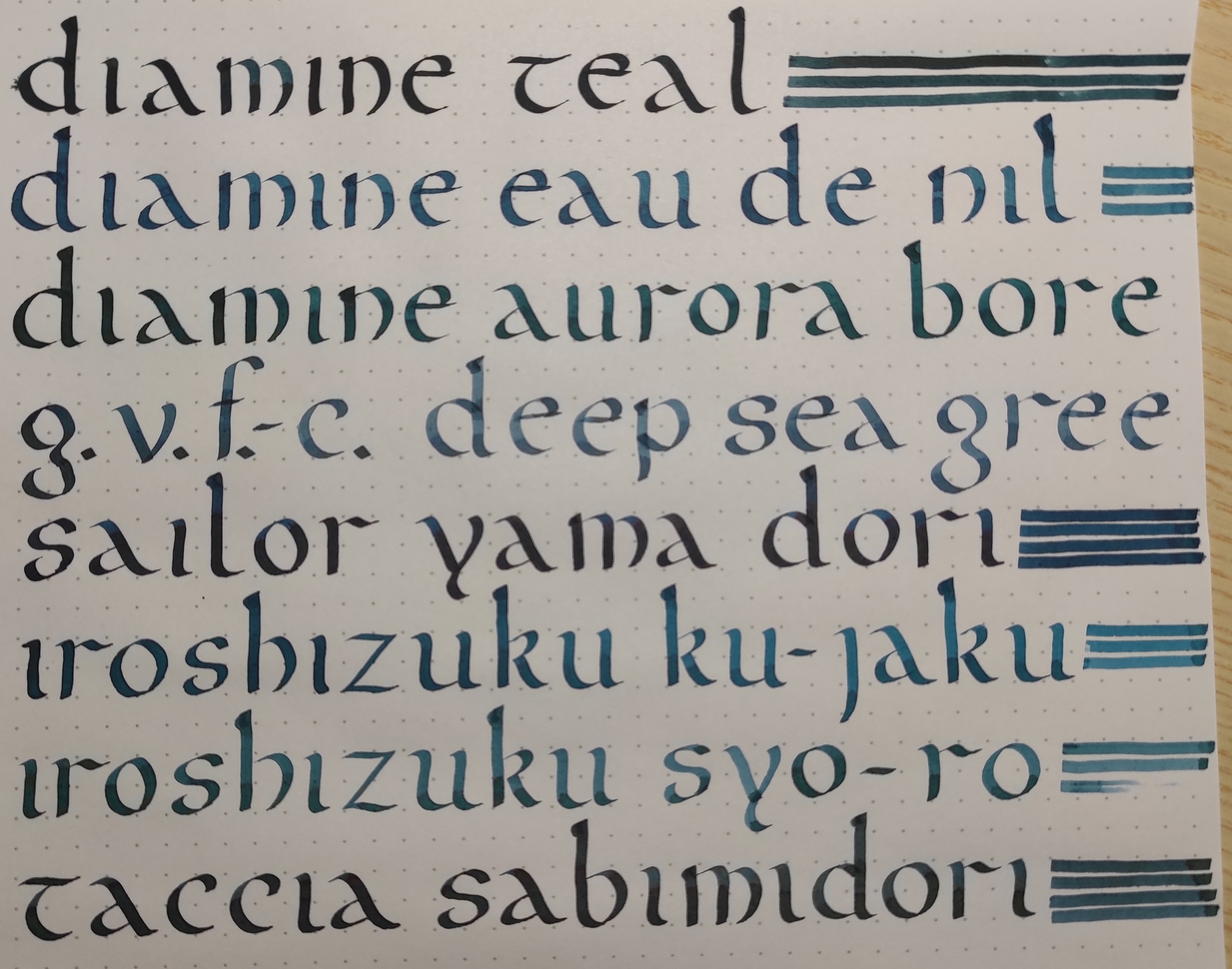 Diamine Teal è un bel petrolio con bello sheen, lo preferisco allo Yamadori. Gli altri due Diamine, Aurora Borealis e Eau de Nil, non mi dicono granché.