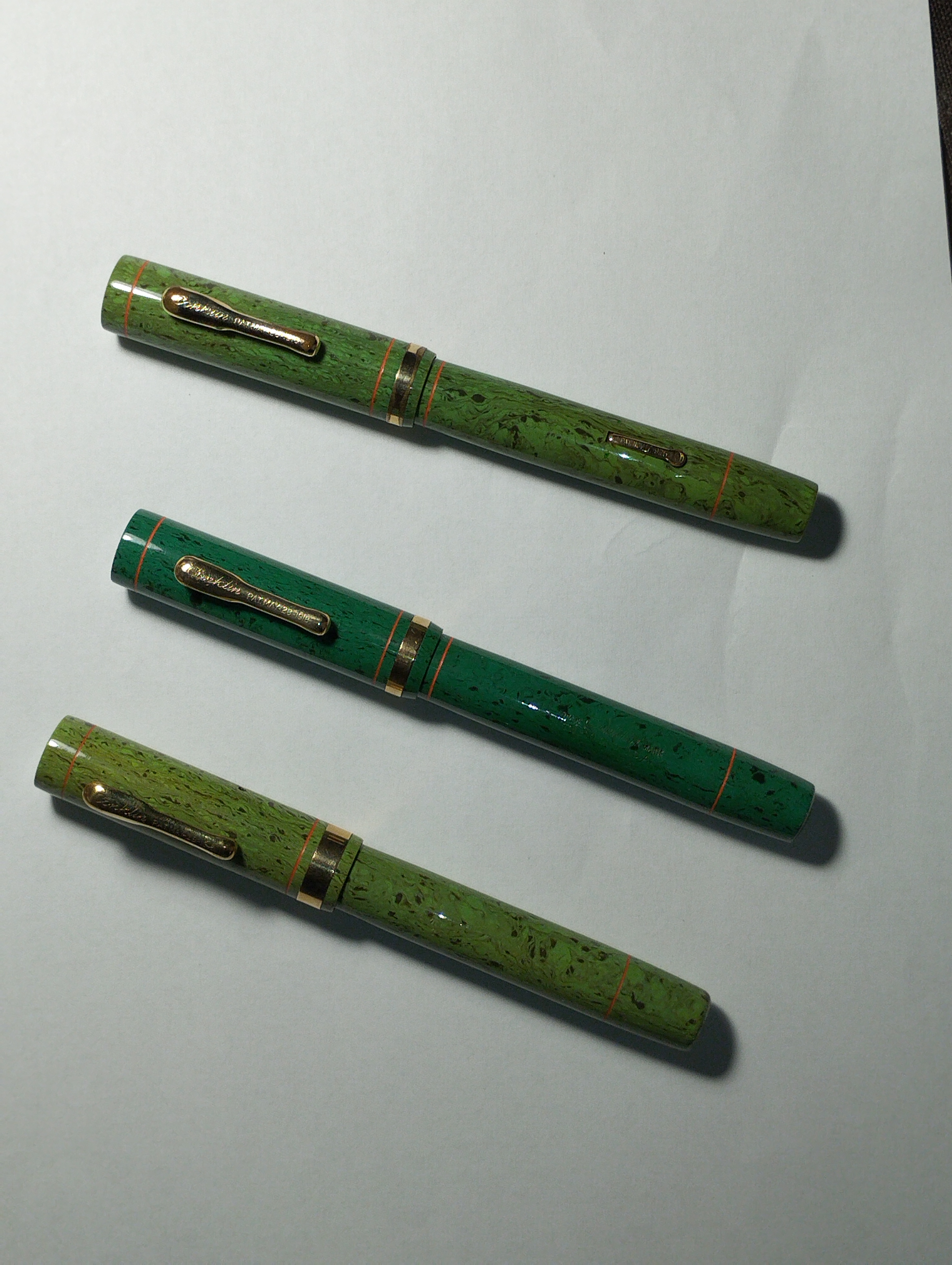 Le uniche "verdi" in ebanite di quel periodo (dopo il 1926) che conosco erano le "blu-green" (non "blue") verde-blu ripple di Waterman (92 e 92V).