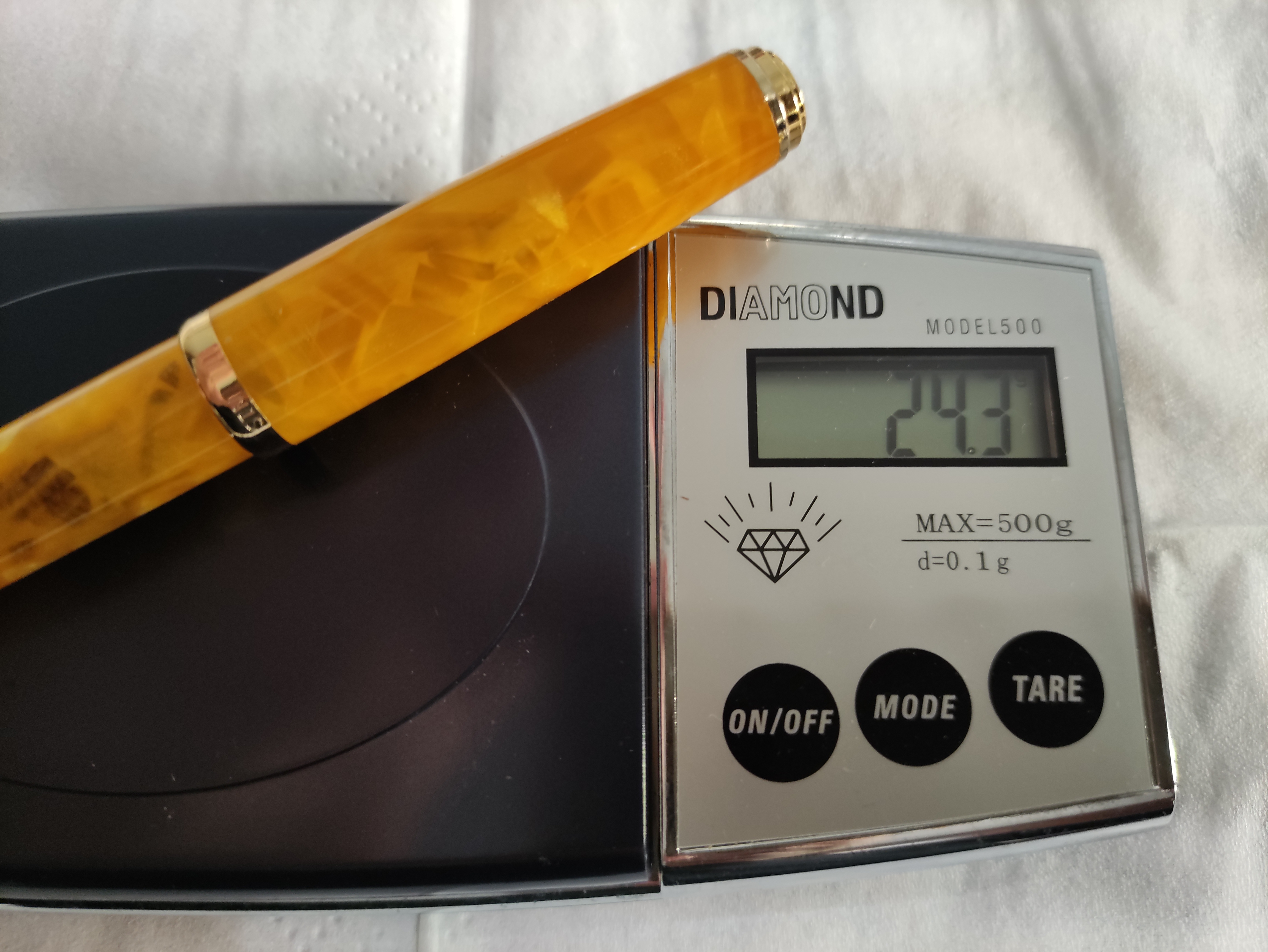 Veniamo alla penna, è una stilografica in resina arancione chiaro, tendente al giallo con pennino in acciaio extra fine.