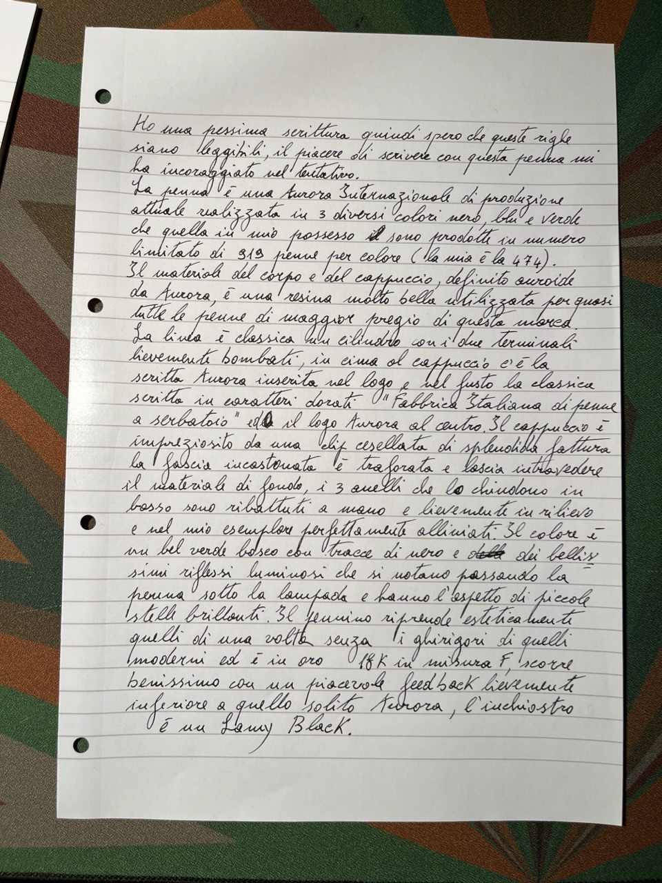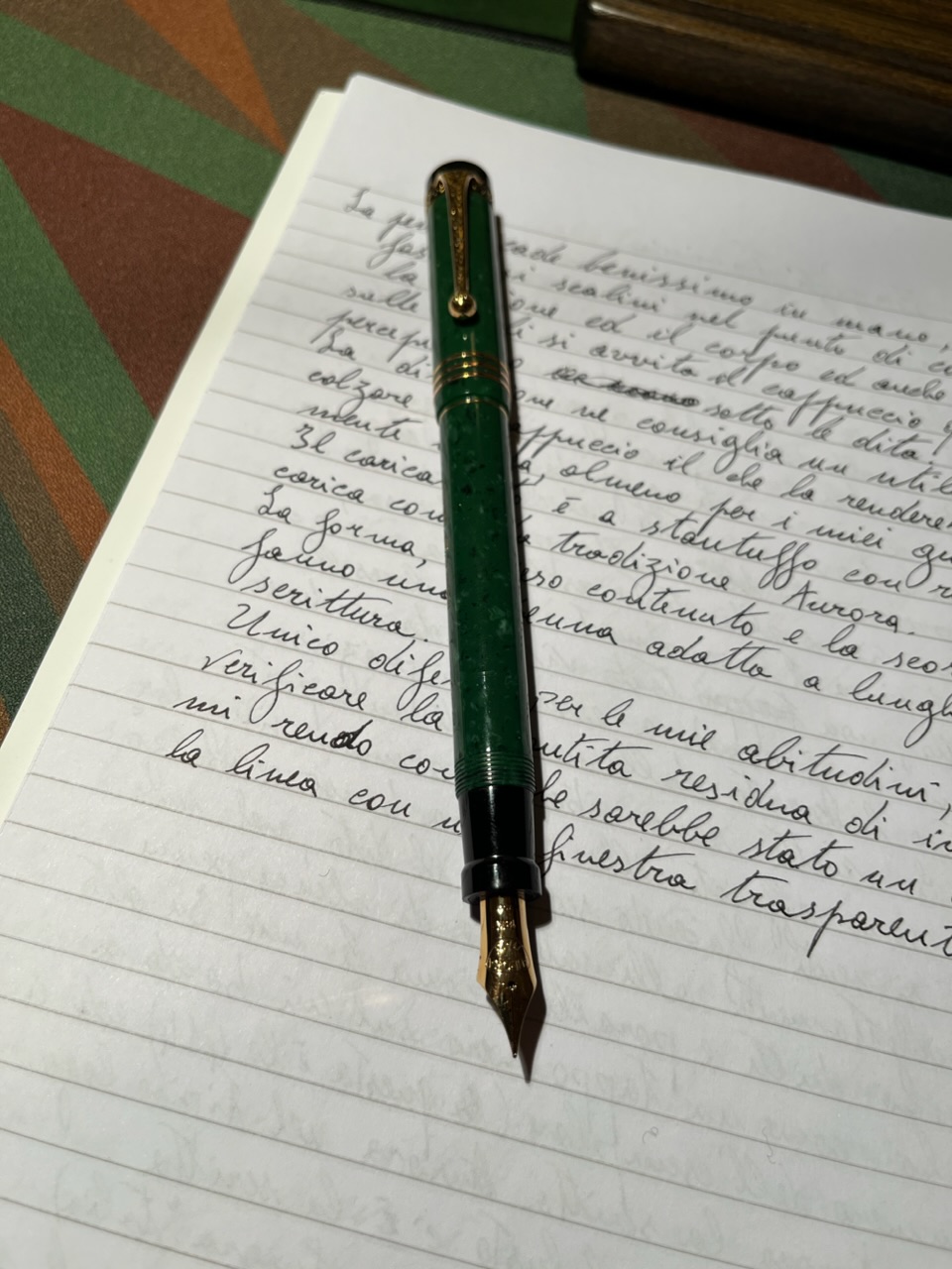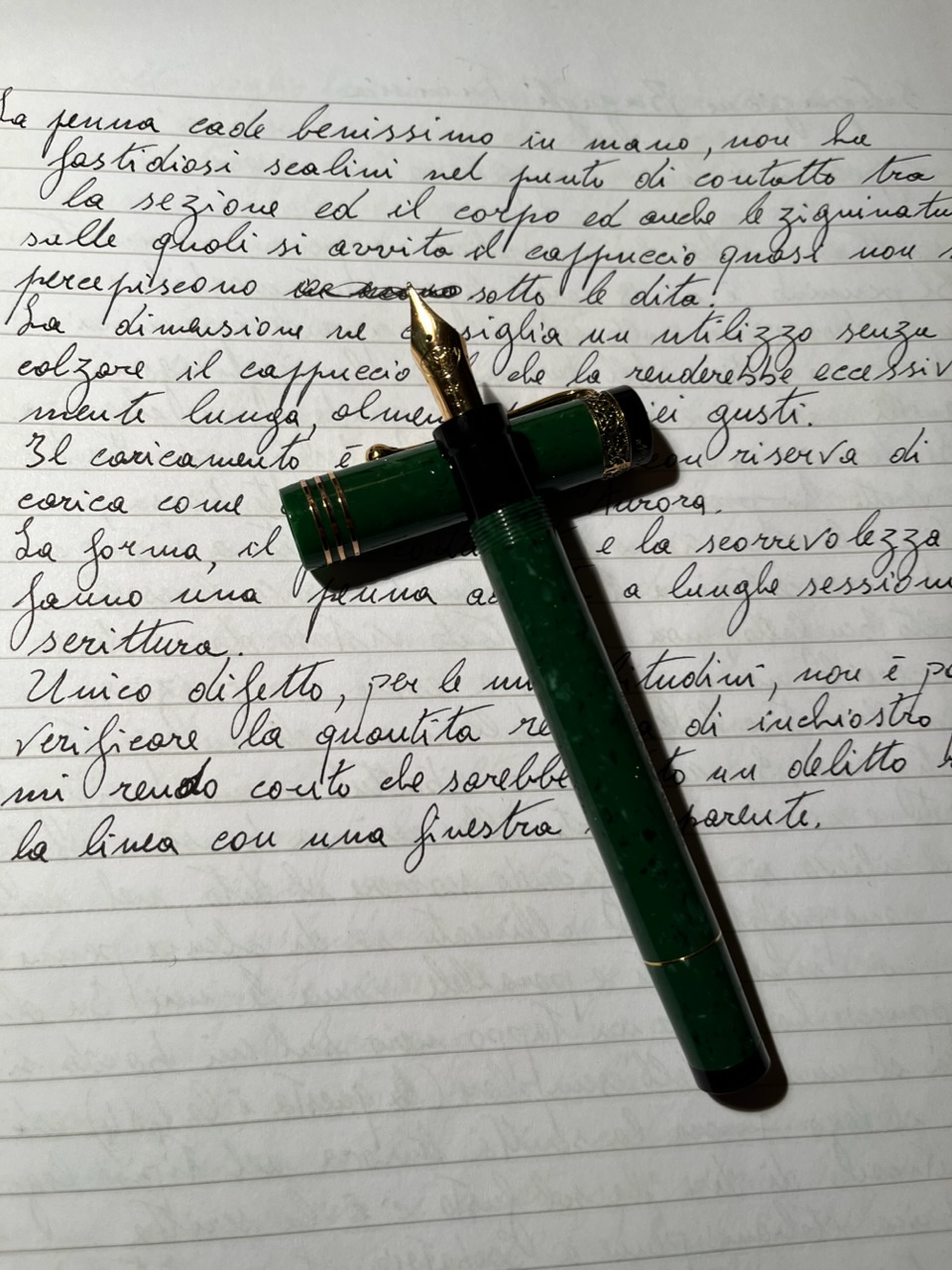 Grazie per la splendida recensione. È una bellissima penna ed è tra quelle che rimangono sempre tra i miei desideri. L'unica cosa che mi ha sempre frenato, a parte il prezzo, è la cesellatura del fermaglio che trovo piuttosto pesante. Ho la duplex, del colore verde e scrive ancora benissimo.