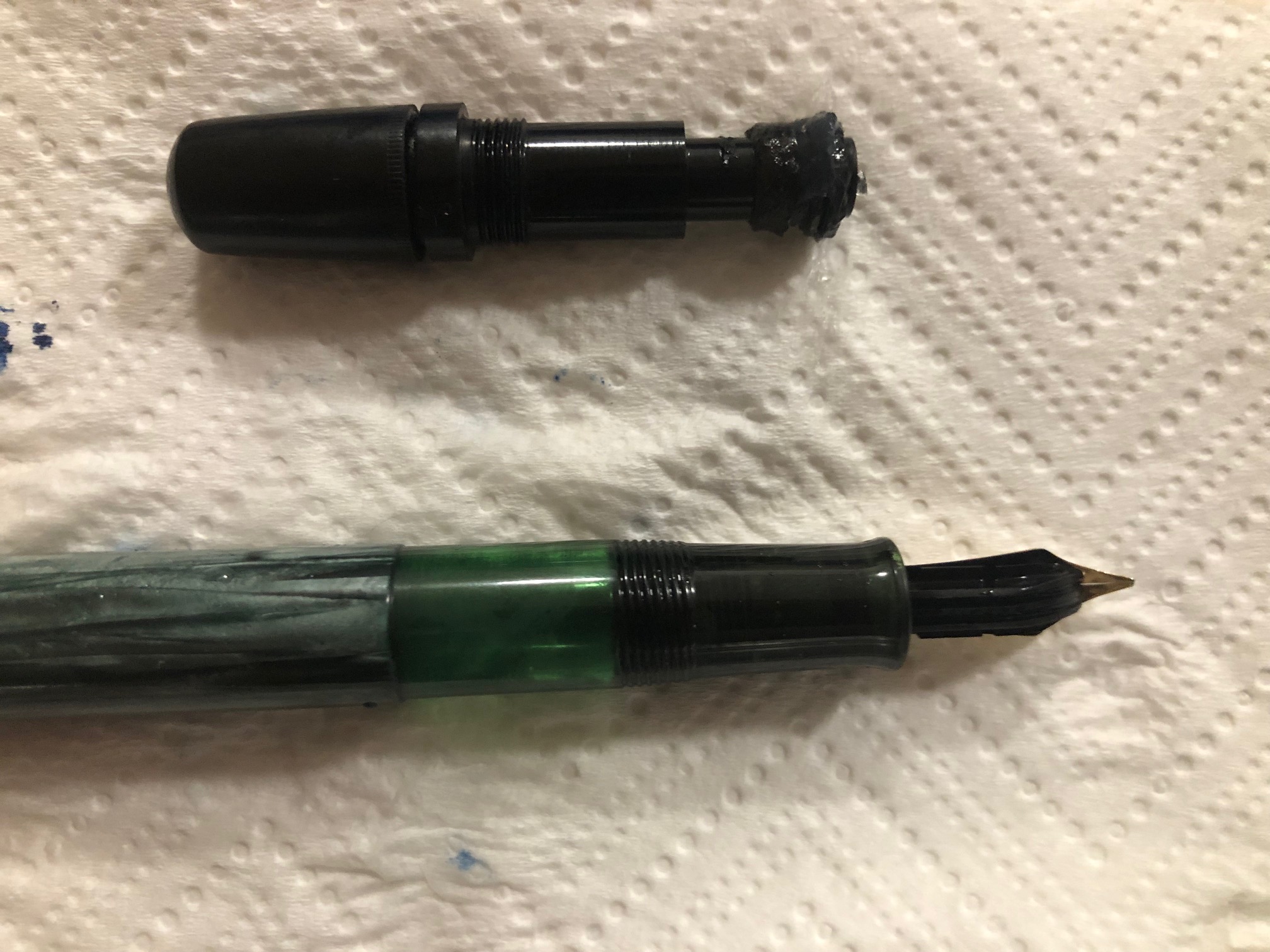 La mia è identica alla tua, l'ho trovata in un mercatino, non era messa bene ma dopo un po' di amorevoli cure è meravigliosa. Personalmente l'ho abbinata all'inchiostro Diamine Garland (evitando lo shimmer) ottimo flusso ed azzeccato il match con la livrea.