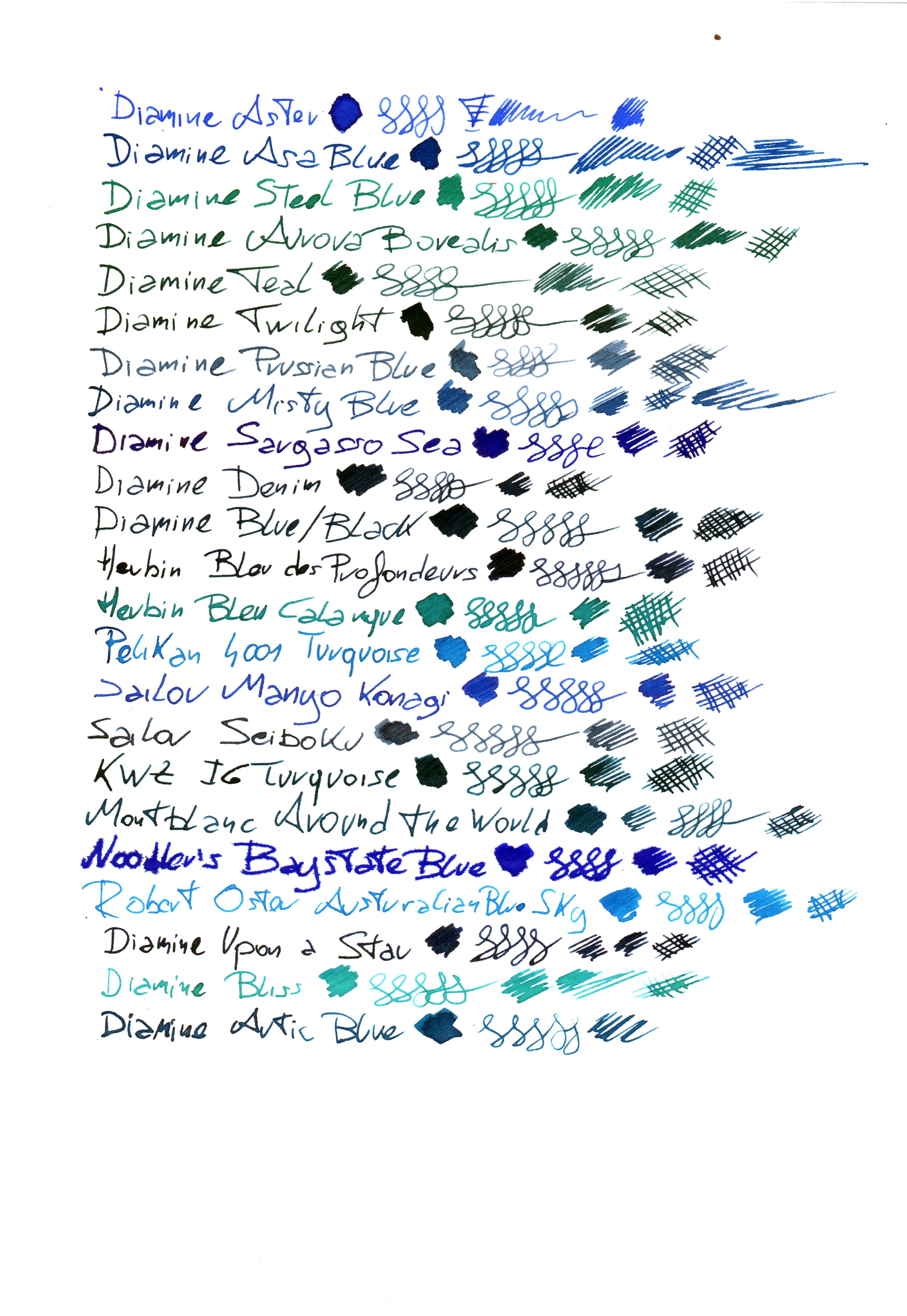 Mancano, ma solo per mio gradimento, due dei miei blu preferiti, il Blue Velvet e l'Oxford Blue di Diamine. E devo provare la carta Oxford Optik.