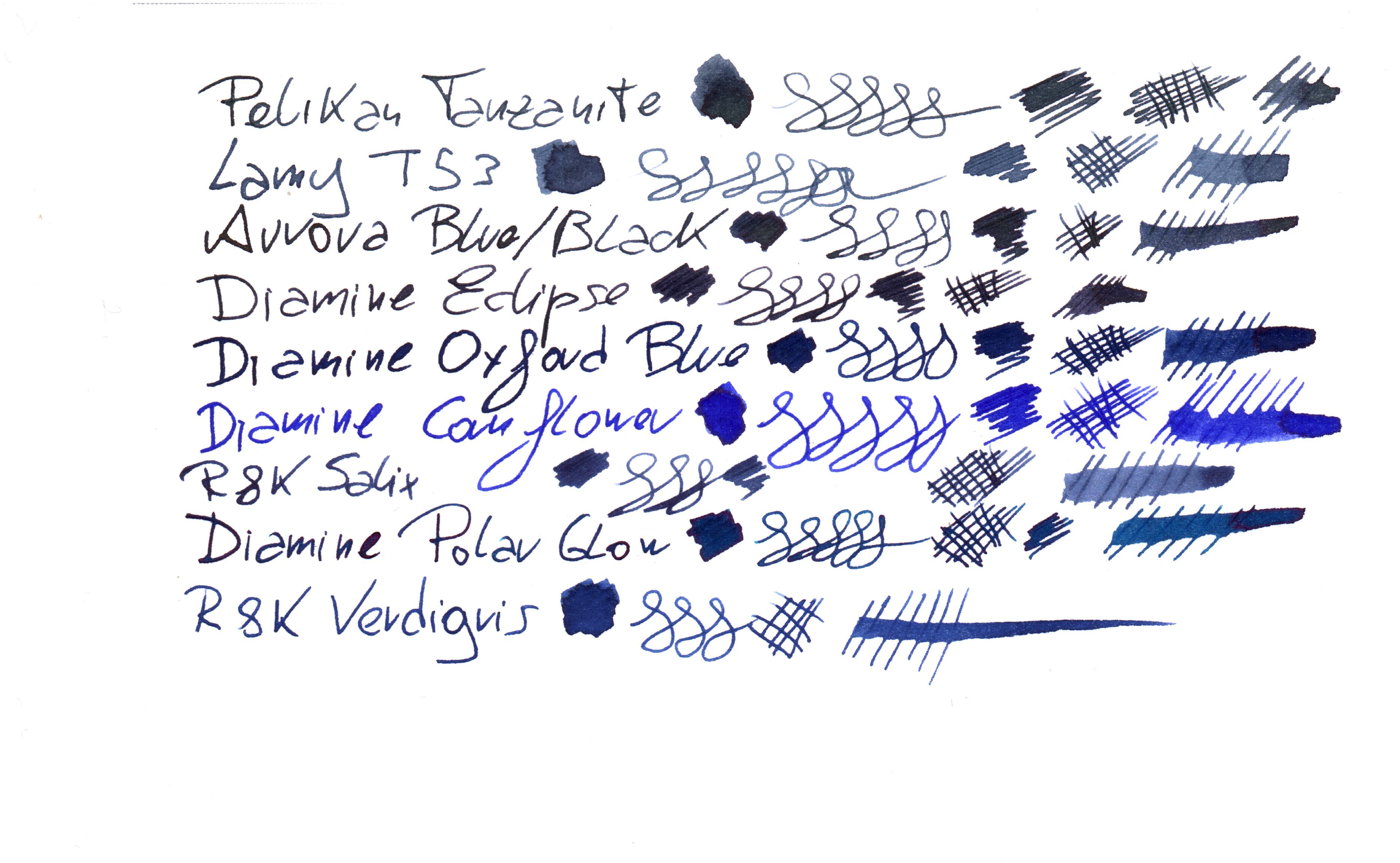 So che molti non amano i royal blu, probabilmente solo perché hanno un po' stufato, per me però è una tonalità classica, il MB Royal blue è il più attendibile, belli anche il classico Aurora, il Visconti, l'Omas. Il pelikan 4001 lo uso perché l'ho sempre usato ha il brutto vizio di sbiadire, è per questo che lo contamino con il Sargasso... Il Waterman Serenity/Florida è più neutro degli altri. Un altro preferito.