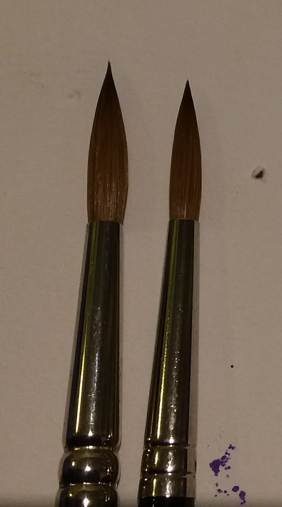 edit: è possibile correggere un pennello che non mantiene la forma come in origine inzuppandolo in una soluzione di acqua e poca gomma arabica, badando di rifargli la punta e togliendo la soluzione in eccesso "accarezzando" un foglio di carta assorbente, riponendolo orizzontale e MAI in verticale a punta in su. Nei Da Vinci la cosa è fondamentale, perché il loro pelo tende - quando secco - a fare il cosiddetto "uncino" all'estremità.