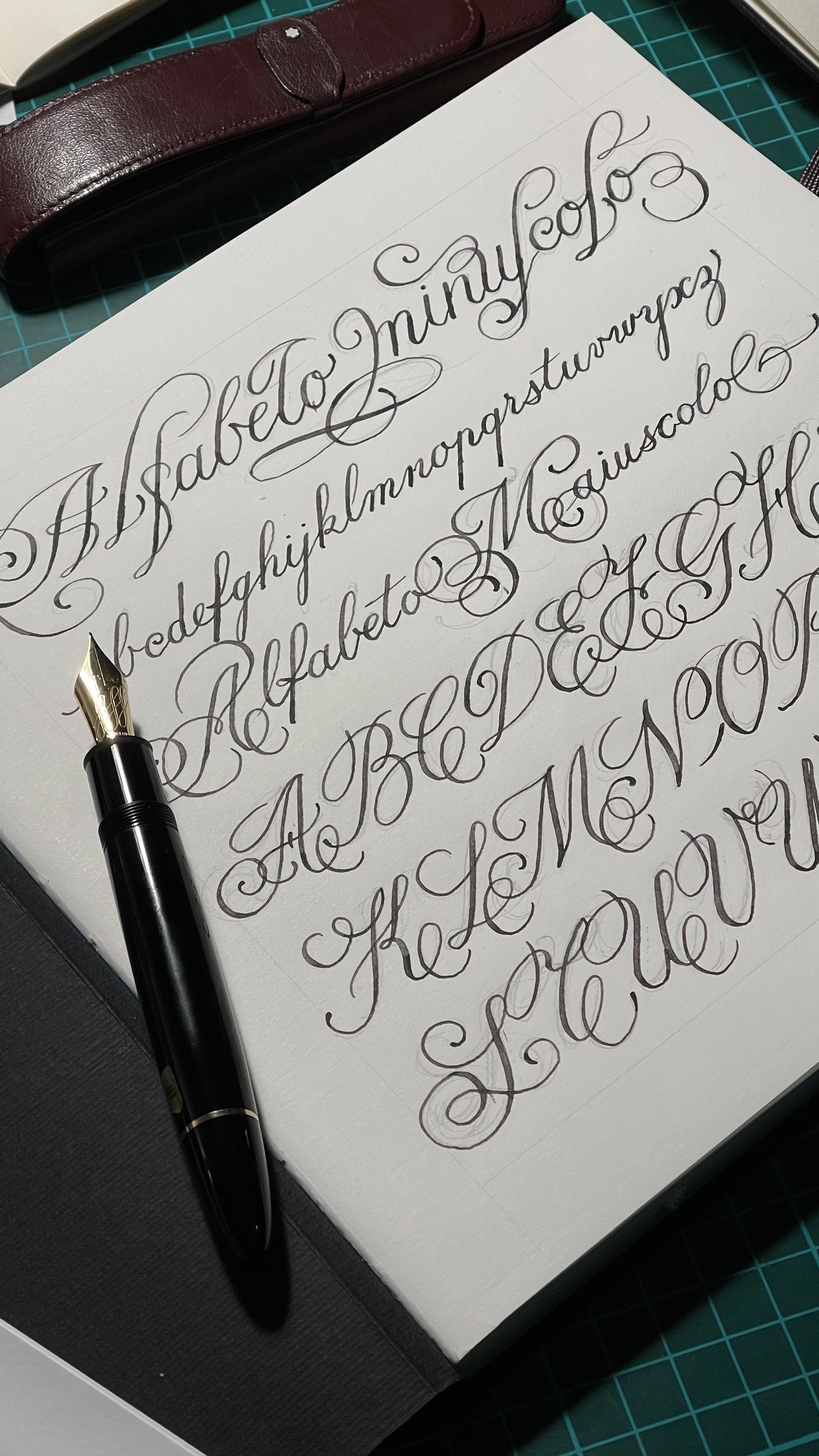 In foto una piccola tavola realizzata da me usando il corsivo inglese ed una montblanc 149 calligraphy , inchiostro nero montblanc e fogli Fabriano .