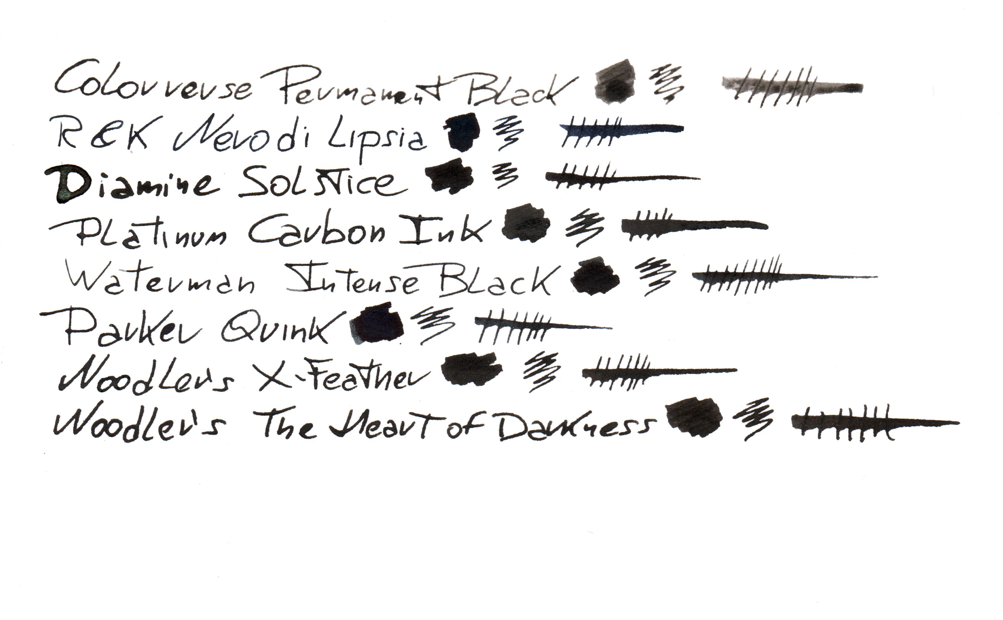 I miei preferiti sono già stati citati: X-Feather perfetto per penne abbondanti e per carte di tutte le qualità; Polar Black per aumentare il flusso e la lubrificazione del pennino, anche se serve una carta buona. Entrambi di un nero assoluto, senza dominanti cromatiche