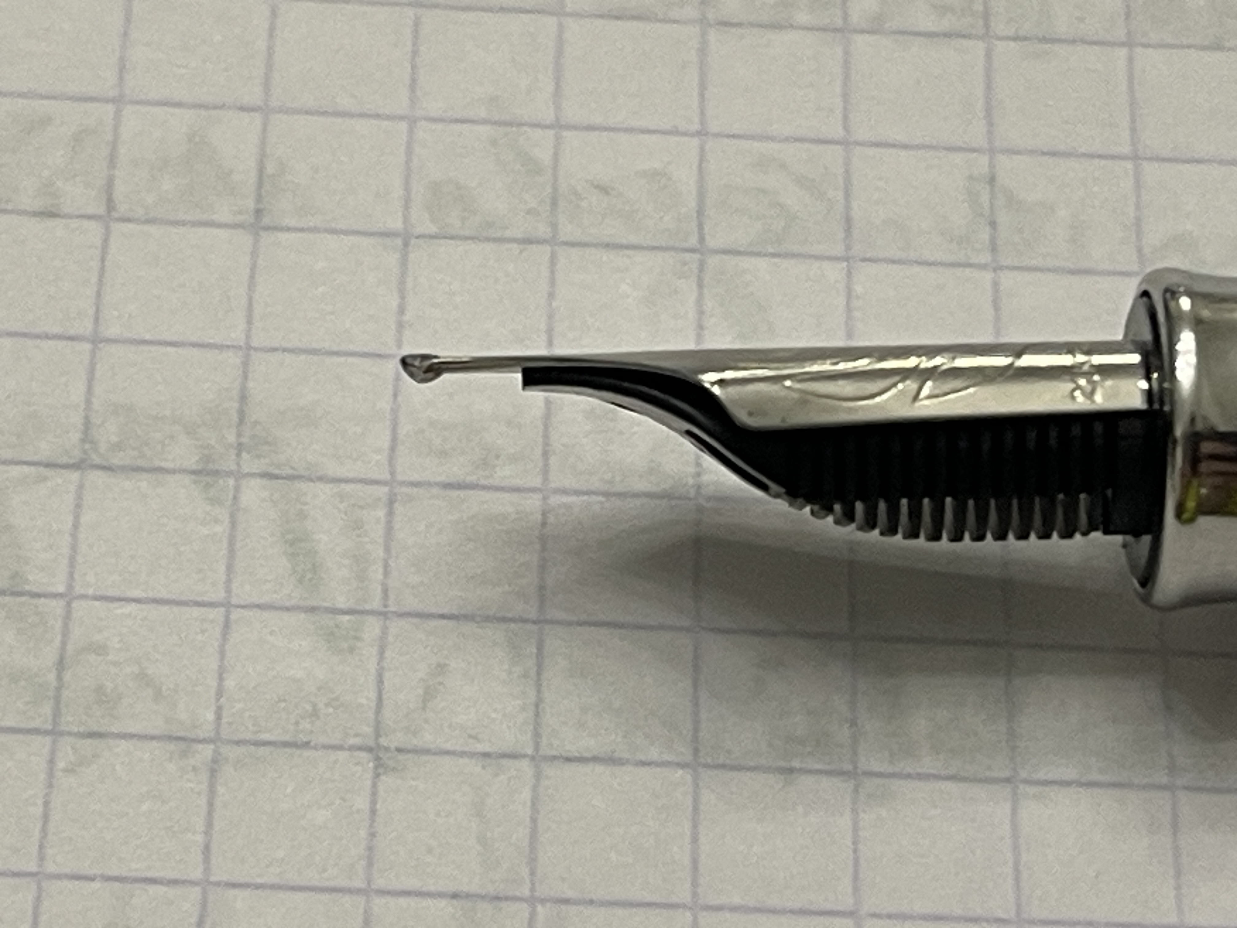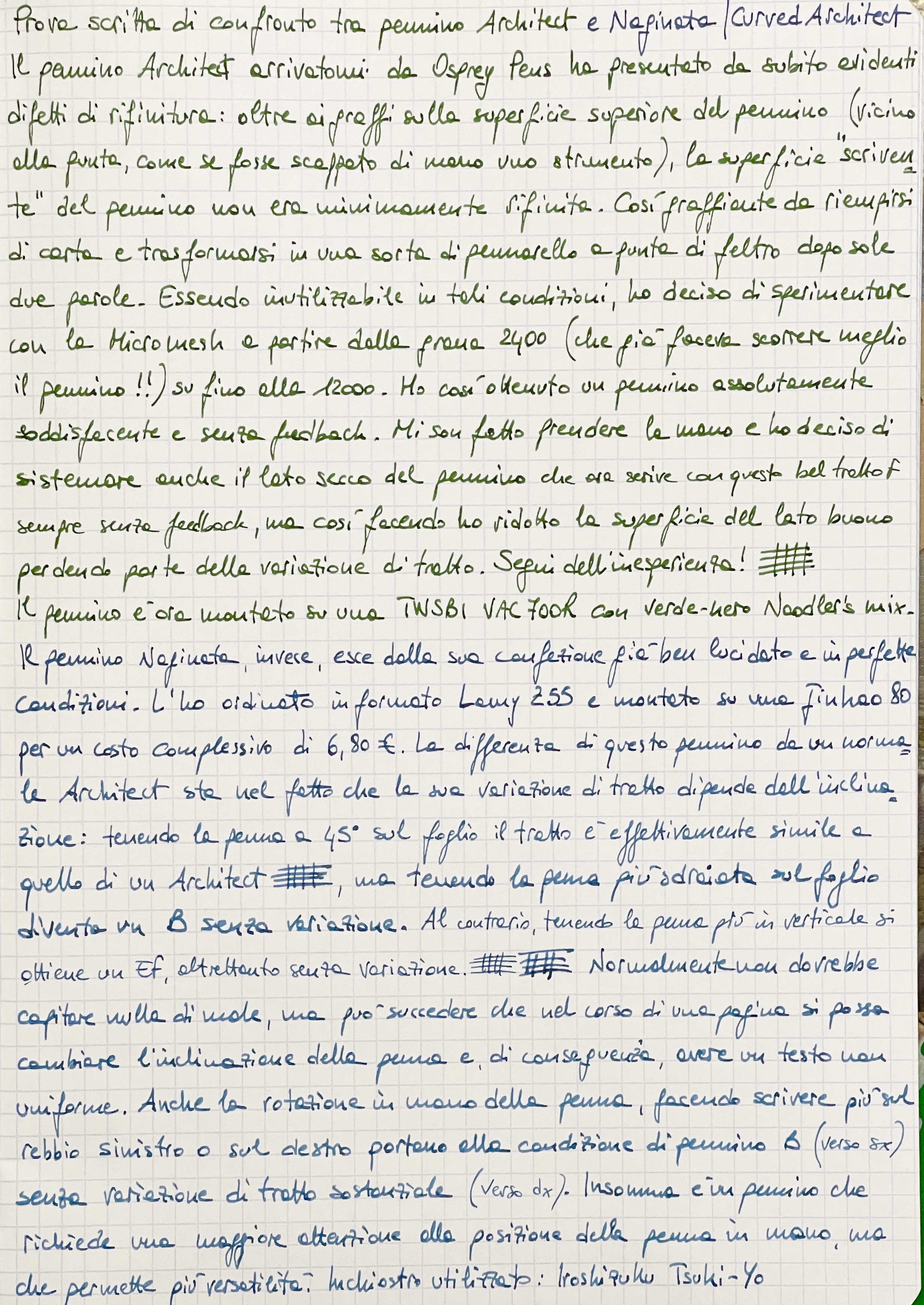 Il pennino Architect arrivatomi da Osprey Pens ha presentato da subito evidenti difetti di rifinitura: oltre ai graffi sulla superficie superiore del pennino (vicino alla ferita, come se fosse scappato di mono uno strumento), la superficie "scrivente" del pennino non era minimamente rifinita. Cosi graffiante da riempirsi di carta e trasformarsi in una sorta di pennarello a punta di feltro dopo sole due parole. Essendo inutilizzabile in tali condizioni, ho deciso di sperimentare con la Micromesh e partire della frana 2400 (che già faceva scorrere meglio il pennino!!) su fino alla 12000. Ho con ottenuto un pennino assolutamente soddisfacente e senza feedback. Mi son fatto prendere la mano e ho deciso di sistemare anche il lato secco del pennino che ora scrive con questo bel tratto F, sempre senza feedback, ma così facendo ho ridotto la superficie del lato buono perdendo parte della variazione di tratto. Segni dell’inesperienza!