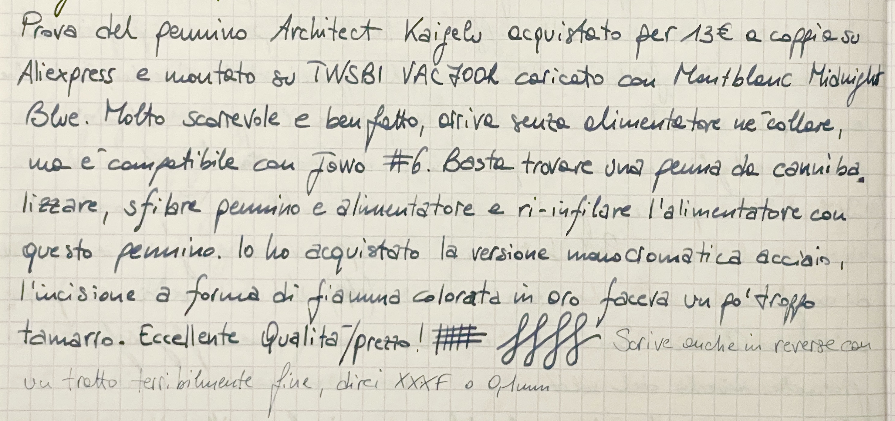 Il pennino Naginata, invece, esce dalla sua confezione già ben lucidato e in perfette condizioni. L'ho ordinato in formato Lamy Z55 e montato su una Jinhao 80 per un costo complessivo di 6,80 €. La differenza di questo pennino da un normale Architect sta nel fatto che la sua variazione di tratto dipende dell'inclinazione: tenendo la penna a 45° sul foglio il tratto é effettivamente simile a quello di un Architect, ma tenendo la penna più sdraiata sul foglio diventa un B senza variazione. Al contrario, tenendo la penna più in verticale si ottiene un EF, altrettanto senza variazione. Normalmente non dovrebbe capitare nulla di male, ma può succedere che nel corso di una pagina si possa cambiare l’inclinazione della penna e, di conseguenza, avere un testo non uniforme. Anche la rotazione in mano della penna, facendo scrivere più sul rebbio sinistro o sul destro portano alla condizione di pennino B (Verso sx)