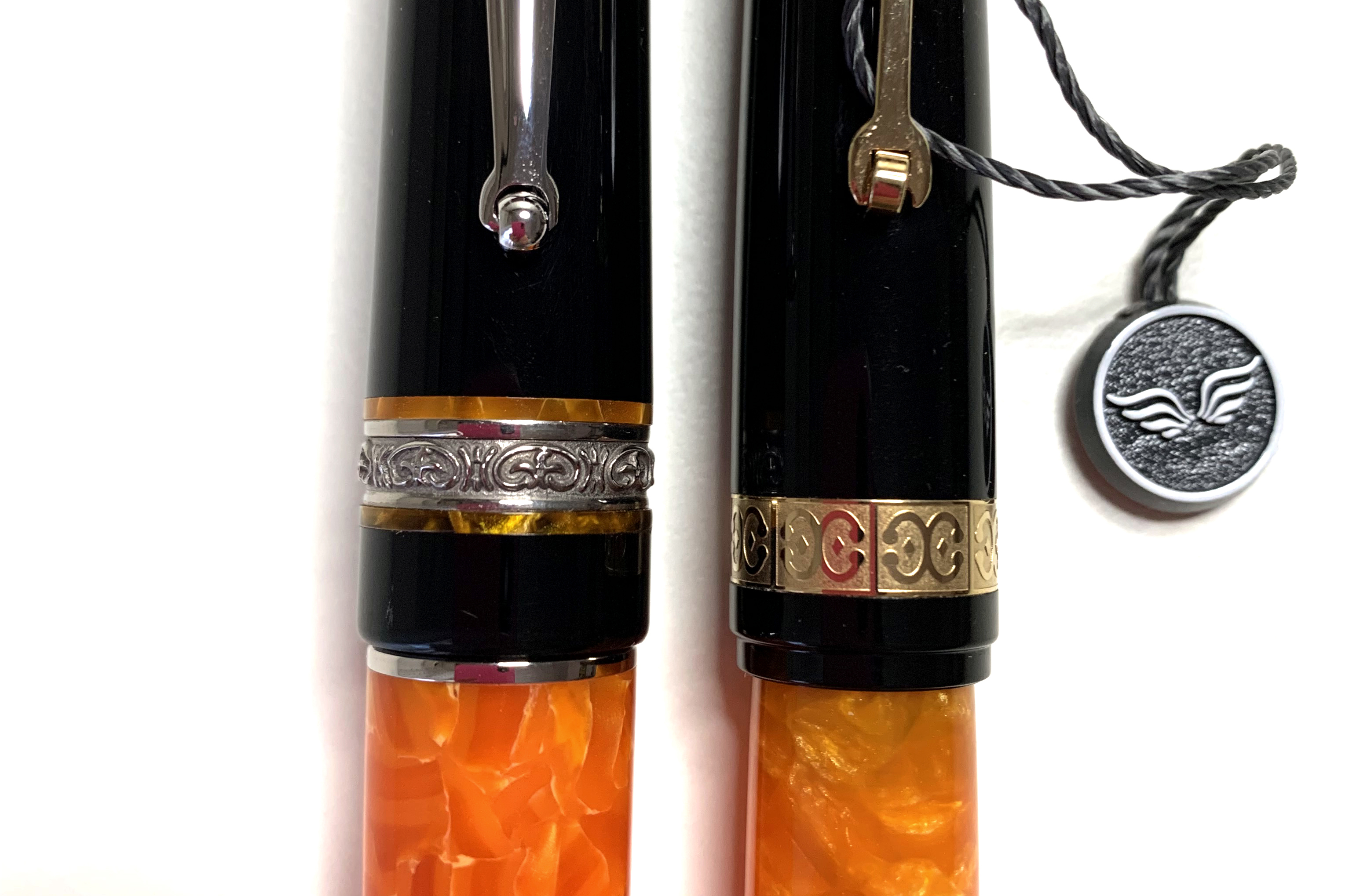 Entrambe con cappuccio e impugnatura nera, e fusto arancio vivace marmorizzato.