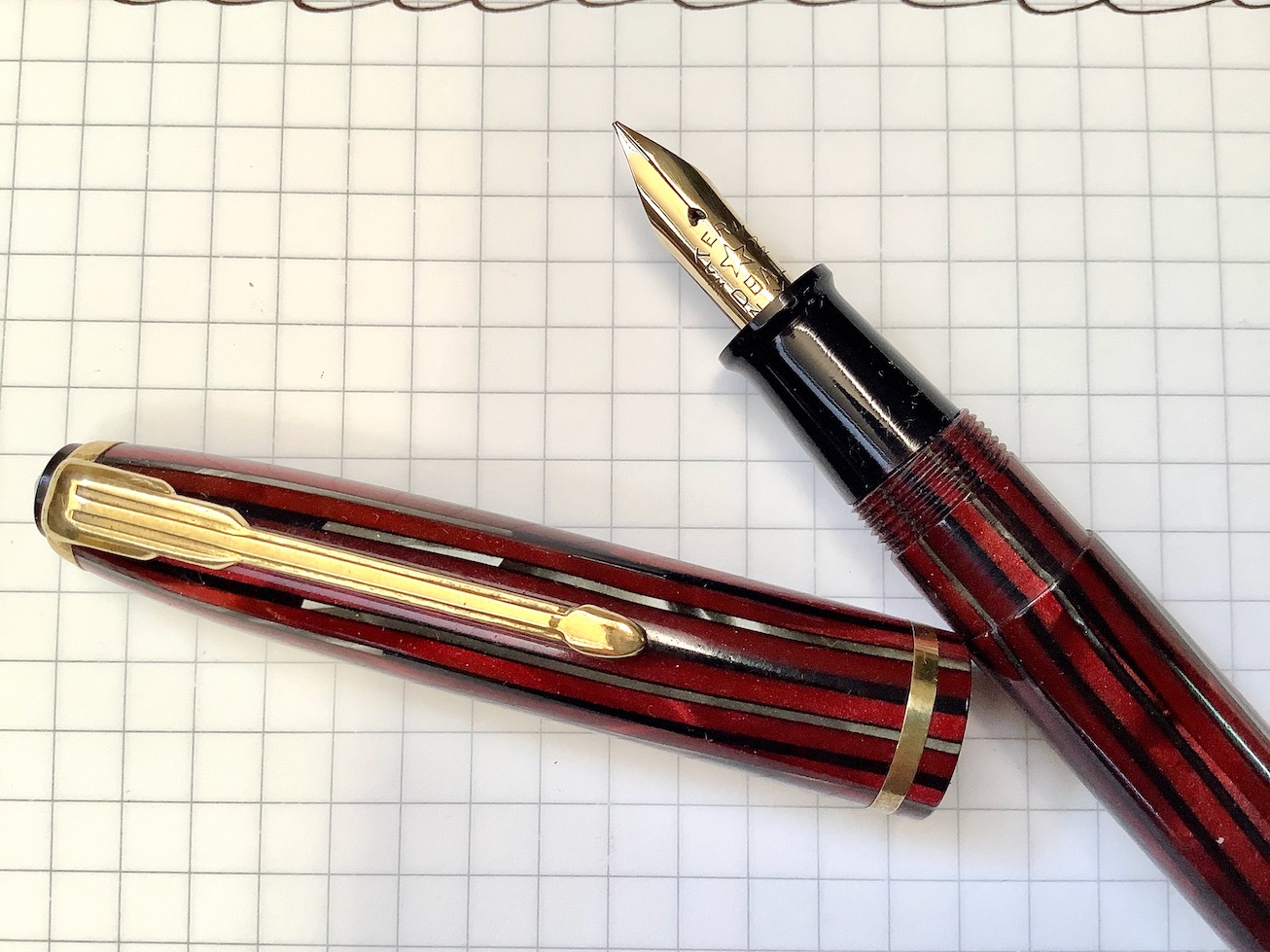 Il caricamento è a pulsante di fondo e caricato il sacchetto di inchiostro, scrive pagine di seguito con costanza di flusso che mai avrei immaginato (il conduttore sembra essere un Waterman non proprio coevo https://www.fountainpen.it/images/a/a2/ ... 201951.pdf senza le parti numerate 20-21-22)