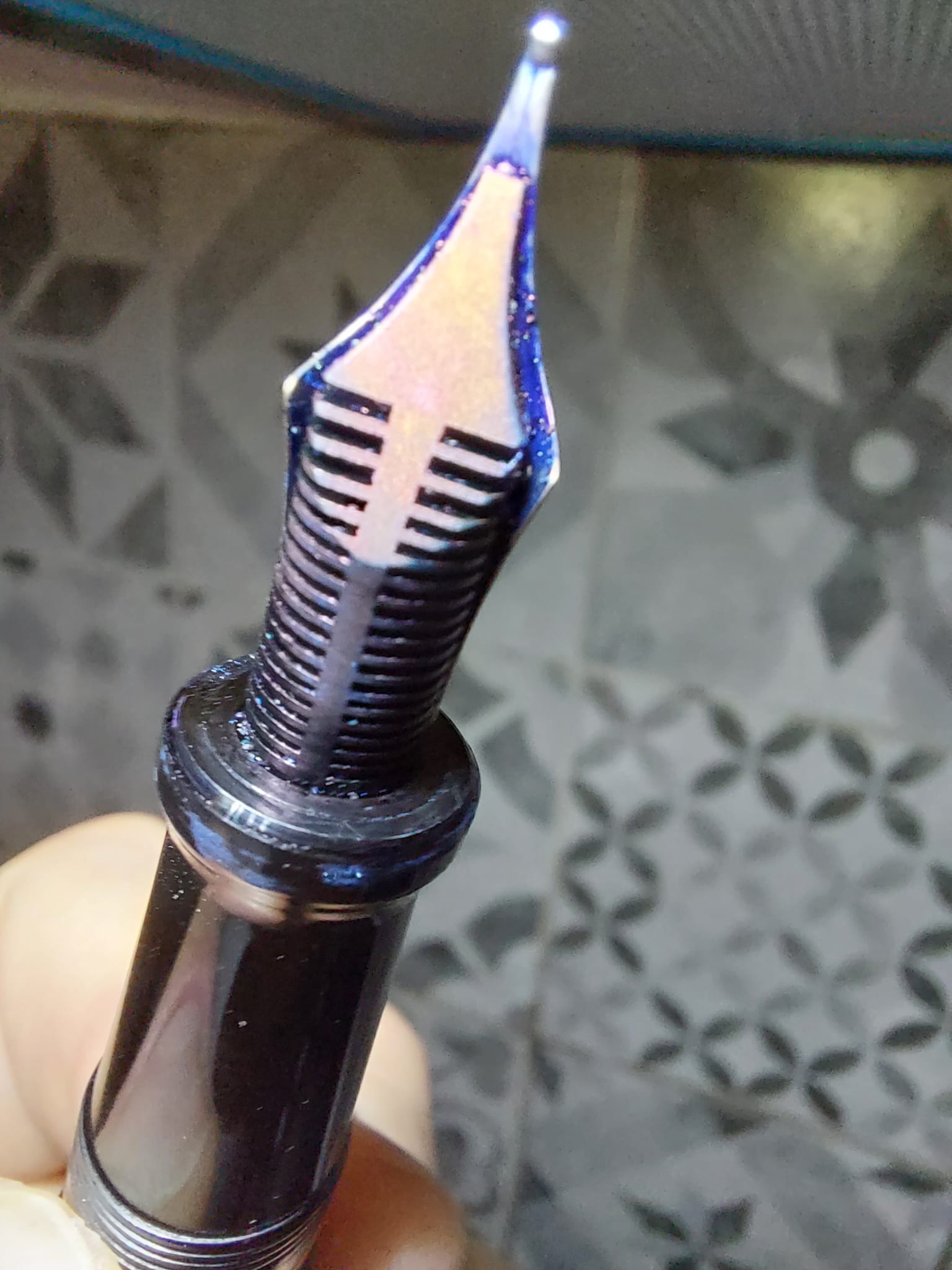 Ho smontato tutto...gruppo scrittura e pistone... per il gruppo scrittura non è stato facile... non so con che inchiostro è stata abbandonata questa penna, ma sembrava ambra fossile... non volevo che si rompesse il colletto dell'alimentatore... il tutto sembrava miele secco color blue... non volevo forzare ore e ore con acqua tiepida... poi piano piano si è svitato.ricart ha scritto: ↑venerdì 17 febbraio 2023, 15:56 E' una 88 prima serie con pennino a punte lunghe, da quello che ho letto hai già tolto il gruppo scrittura, lascialo nel liquido detergente per un'oretta non di più poi lavalo sotto il rubinetto, Con uno spazzolino a setole morbide togli eventuali residui fra le alette, con precauzione perch possono rompersi. Per i depositi all'interno della canna versa dentro un po di liquido detergente, aspetta sempre la solita oretta poi risciacqua con acqua tiepida. Se lo stantuffo non scorre bene porta la guarnizione a fine corsa, verso la sezione pennino, e con un pennellino sottile e/o stuzzicadenti bagna il perimetro dello con un po di olio lubrificante, fai su e giù un paio di volte, rimonta la sezione, carica l'inchiostro che ti piace e via a tutta birra. Non esagerare con il pennino cioè non insistere più di tanto per ottenere la variazione di tratto, lui non è stato progettato e costruito per quella roba lì. Se puoi pubblica una foto del bordo del cappuccio, grazie.