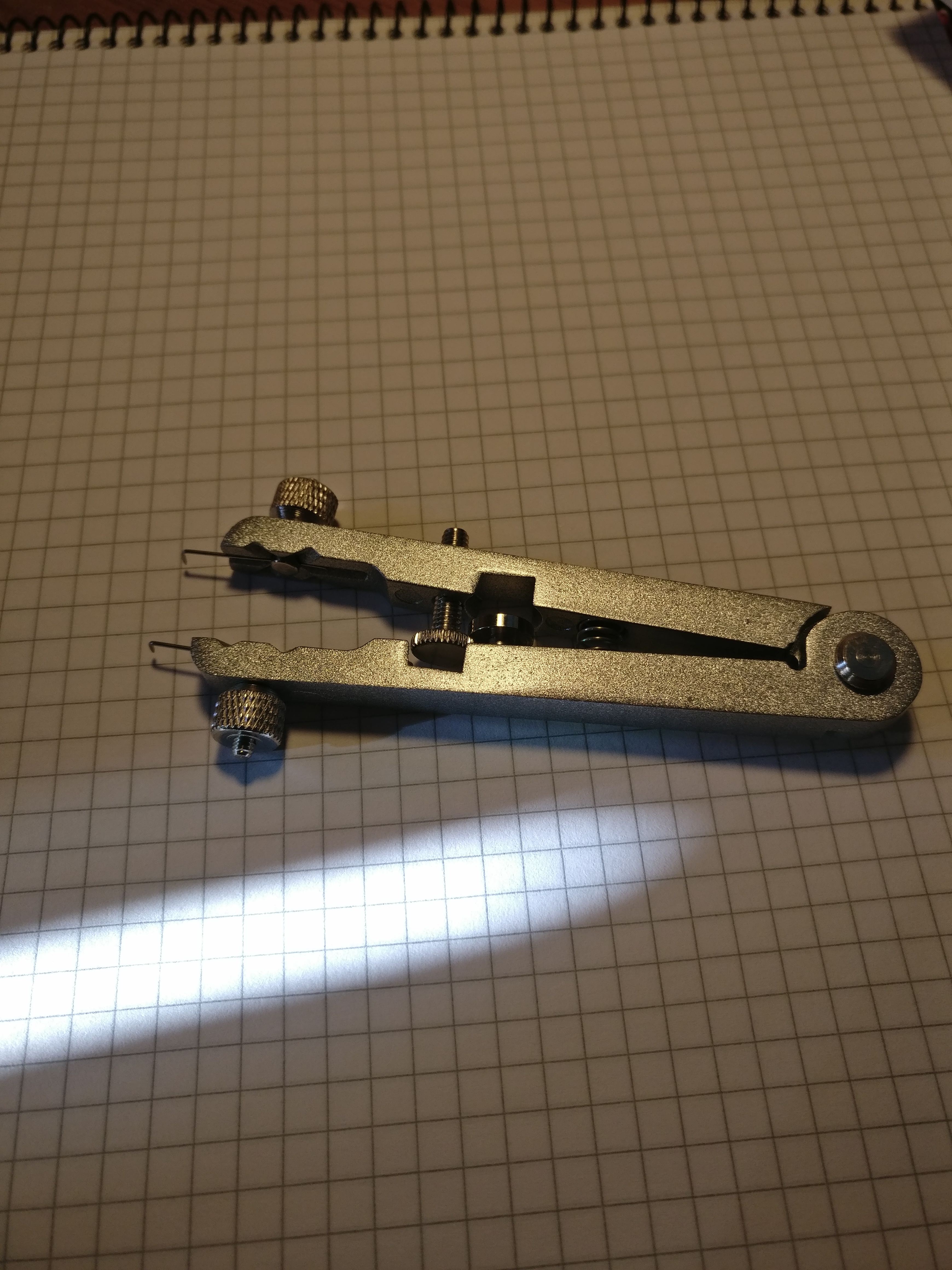 Per il gruppo pistone (qui è stato più facile, le incro si sono sciolte più velocemente) avevo visto dal wiki che serviva un attrezzo a misura ed io mi sono fatto due punte per l'estrattore Bergeon che uso in orologeria, vedi foto, alla fine è comodo..fatte le punte lo regoli e apri cosa vuoi... però non veniva il pistone... e giu di acqua distillata con siriga.