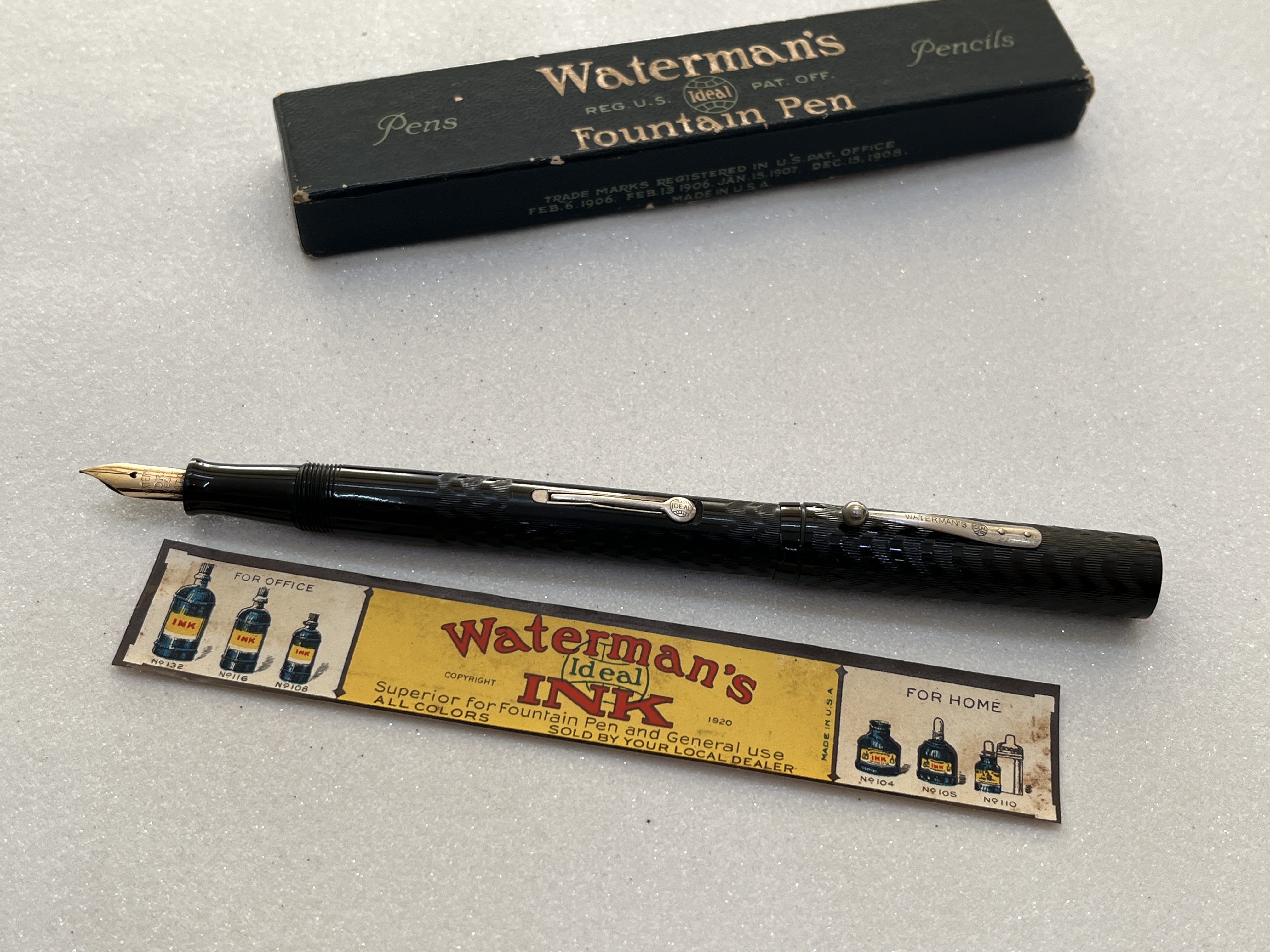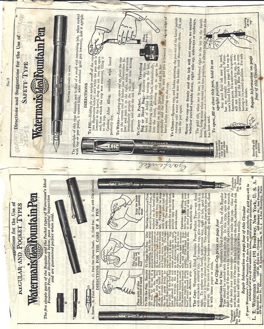 Forse due o tre anni dopo (1928), il foglietto almeno, visto che sono citati i ricambi per le Waterman 7 e 94 (ripple), ma rimane una signorina "palestrata" decisamente attempata...