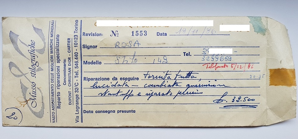 - Busta di lavorazione della manutenzione fatta da me fare dalla "Musso Stilografiche", negozio di eccellenza a Torino nel campo dlle stilografiche, con i Marchi di Cartier, Montblanc ecc., ora purtroppo definitivamente chiuso (per privacy ho cancellato dati riguardanti la persona che l'ha ritirata per mio conto, mia moglie)