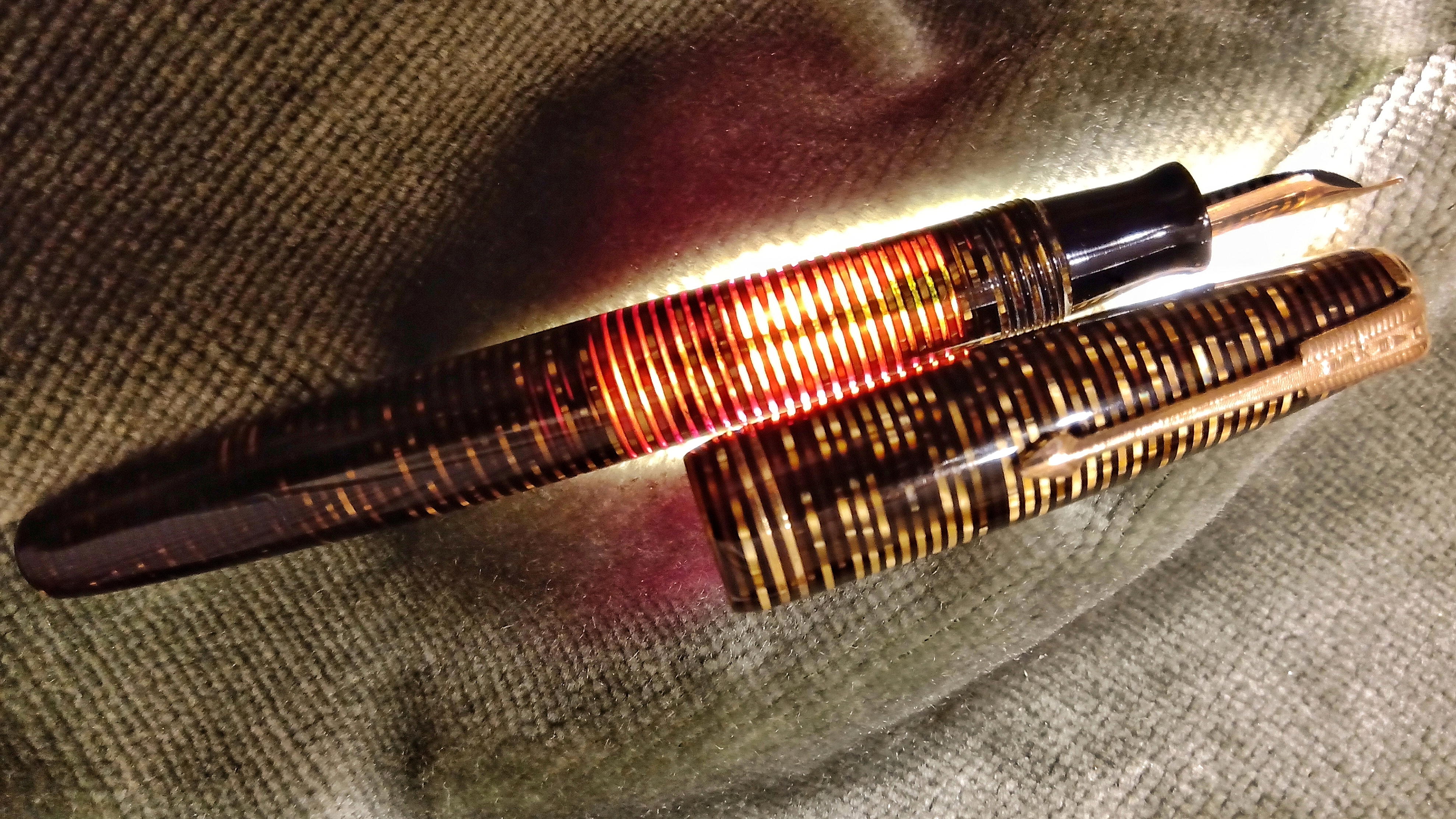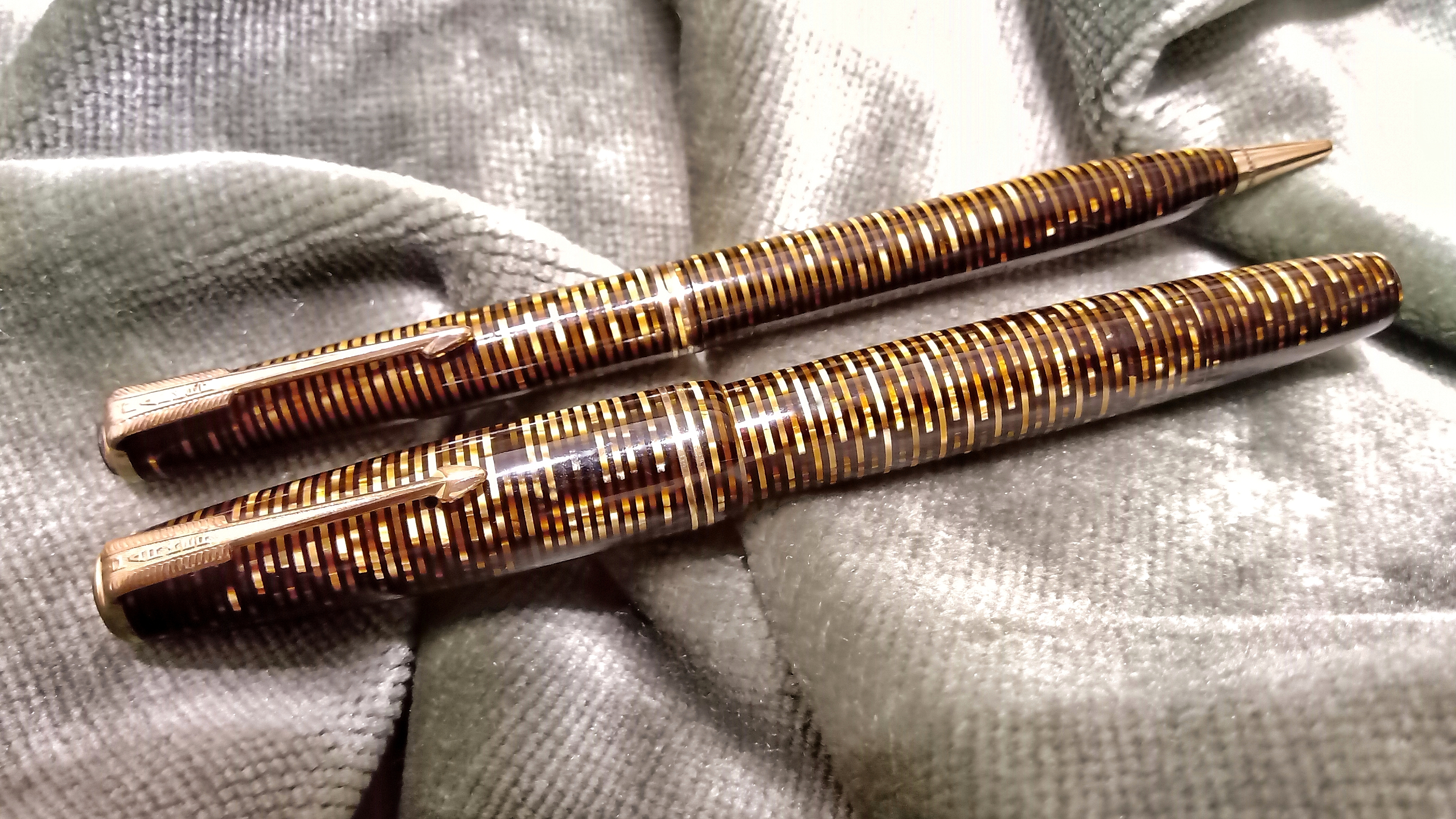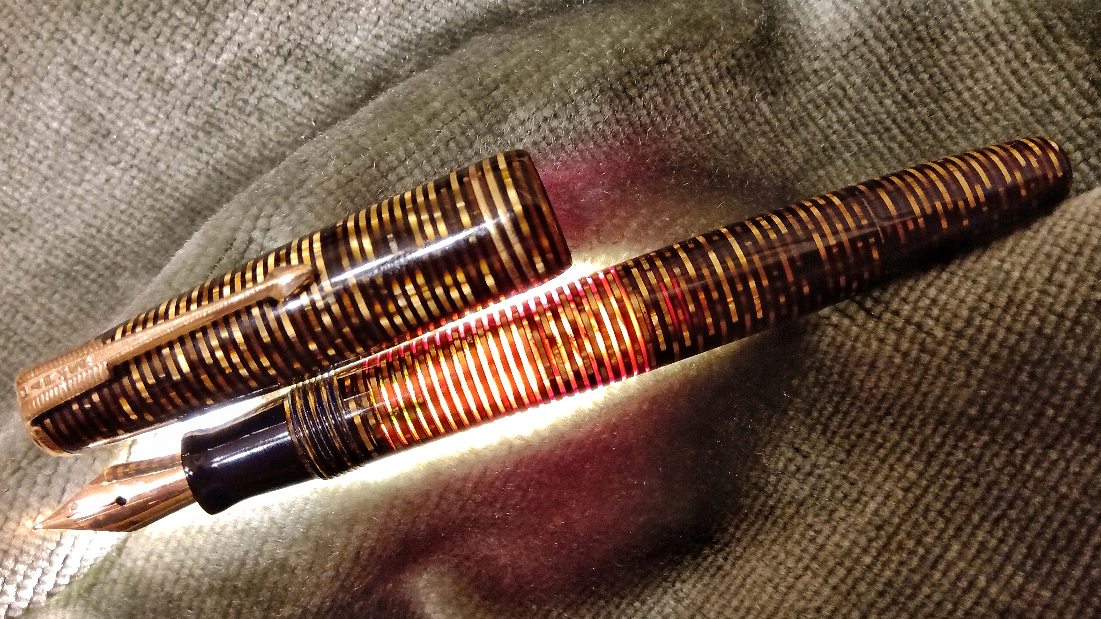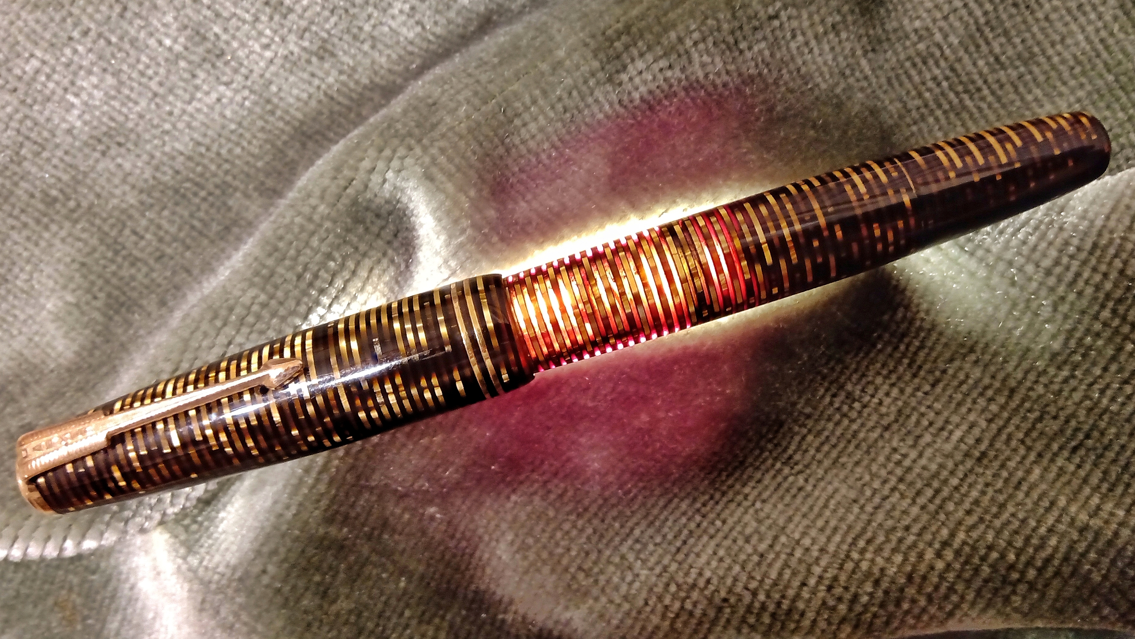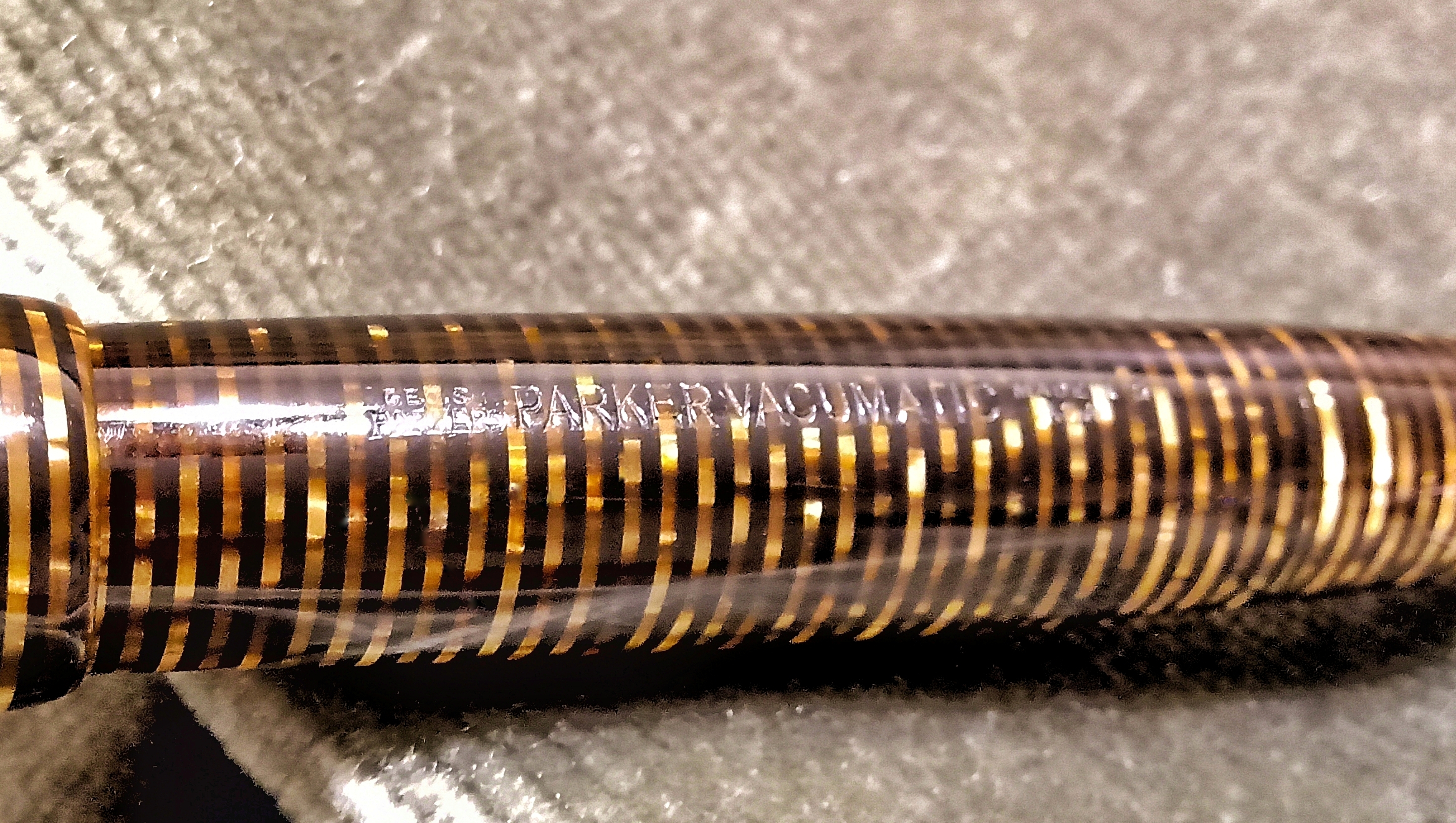 Oggi volevo condividere con voi il restauro di una penna stilografica, portamine e cofanetto, di un prodotto Parker che si chiamava Vacumatic Debutante Junior, una bellissima penna realizzata in celluloide laminata con anelli dorati sulla sua struttura, sistema di ricarica vacumatic, a vista pennino semiflessibile in oro, serbatoio dell'inchiostro traslucido, cappuccio con doppi anelli laminati in oro e un semplice gioiello nero a coronamento della sua clip, anch'esso in oro laminato.