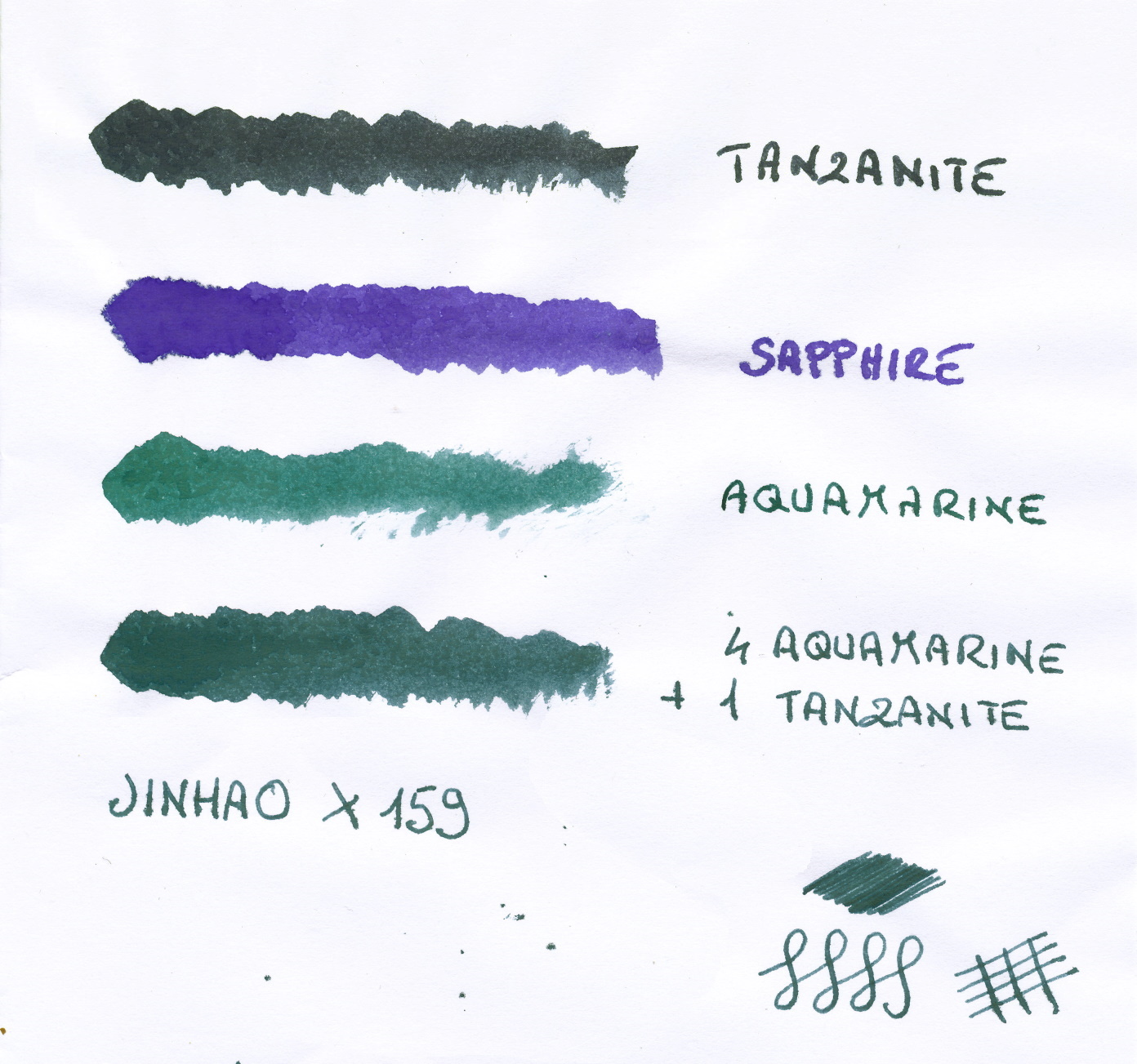 Nello swab fatto a pennello si vede bene che l'inchiostro è scurito, la tonalità è rimasta quasi la stessa, ad occhio si vede una leggera maggiore dominante blu. Nella prova di scrittura la differenza con l'Aquamarine puro è tuttavia quasi indistinguibile (nell'Aquamarine c'è una leggera tonalità verde più accentuata, ma molto lieve).